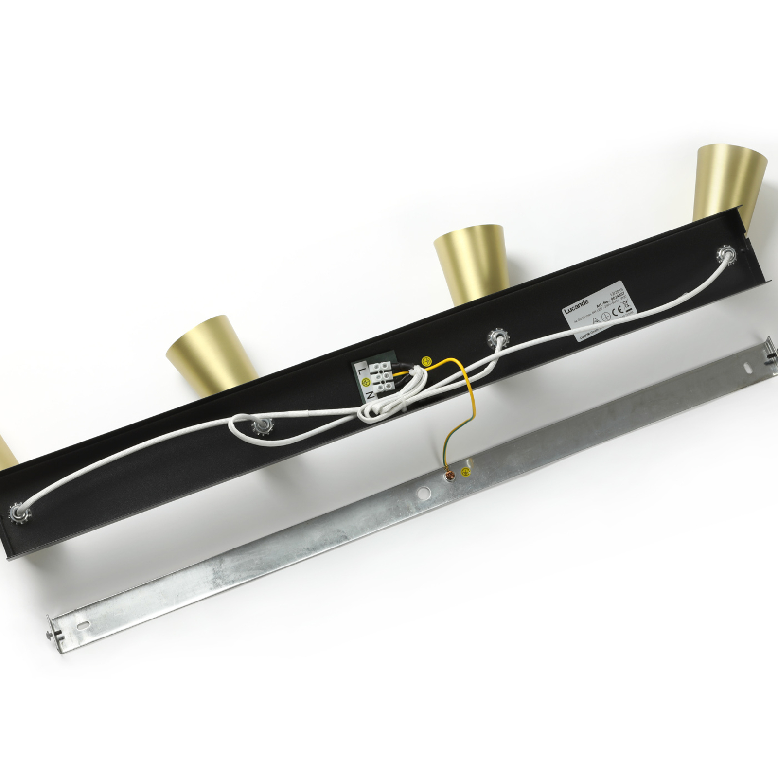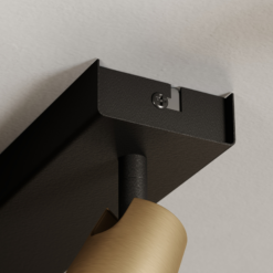 Tämä kattovalaisin soveltuu erinomaisesti huoneen päävalonlähteeksi. Valaisin sopii myös moderniin sisustukseen ja skandinaaviseen sisustustyyliin selkeän muotoilunsa ansiosta. Valaisimessa on musta pitkänmuotoinen runko ja varjostimet, joiden mattapintainen messinginsävyinen sisäpuoli luo kauniin kontrastin. Varjostimiin sopivat GU10-LED-lamput.