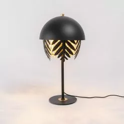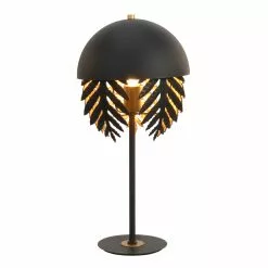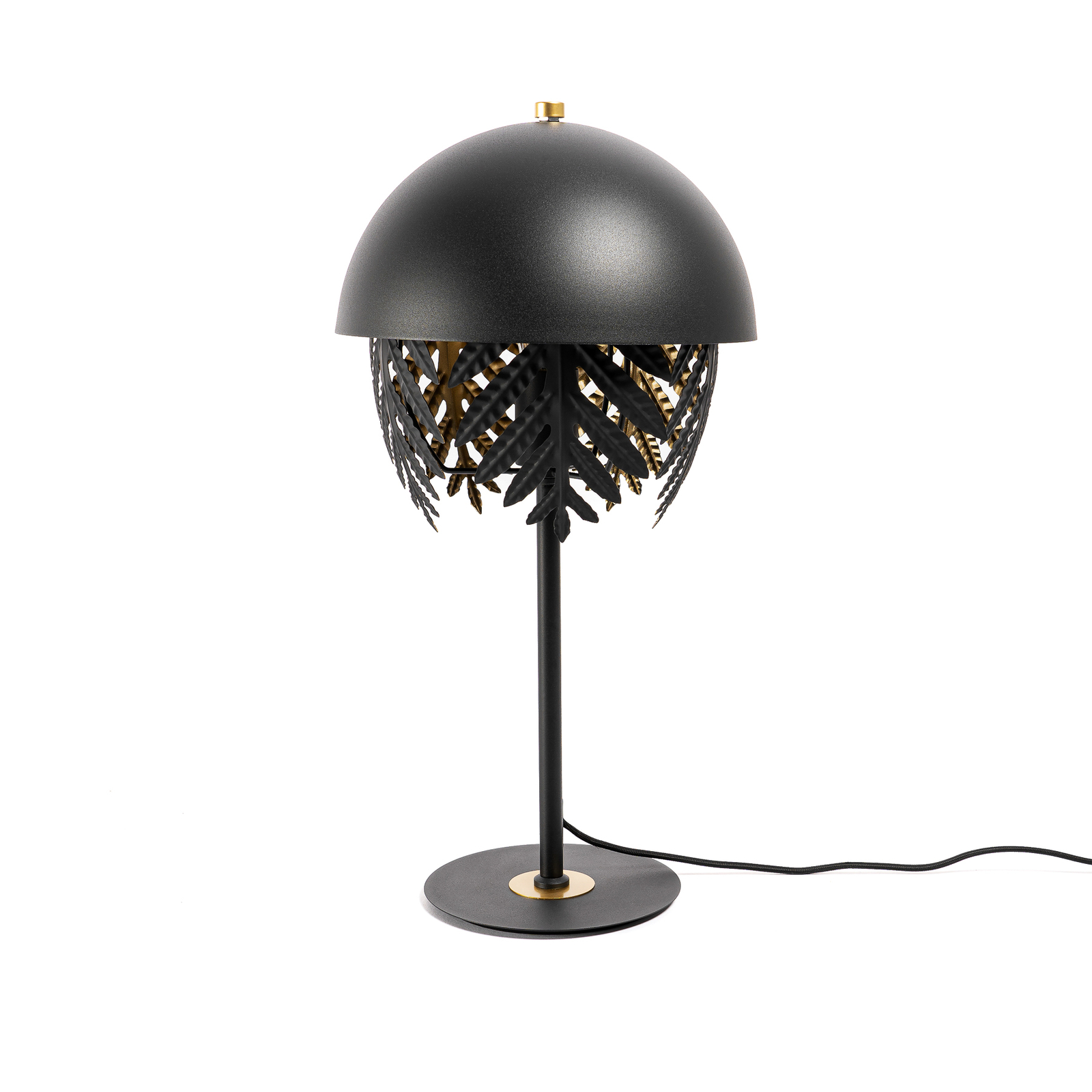 Aparas on pöytävalaisin, joka näyttää erittäin koristeelliselta erikoisen muotoilunsa ansiosta. Koko valaisimen runko on valmistettu raudasta, ja siinä on musta pintakäsittely, jolla on näyttävä vaikutus ja joka tekee valaisimesta katseenvangitsijan. Lampunvarjostin muistuttaa puolipalloa, jota on täydennetty koristeellisilla saniaislehdillä, ja sen sisäpuoli on kultainen, jolloin syntyy tehokas mutta harmoninen kontrasti, joka vaikuttaa valon kuvaan ja ulkonäköön yhtä lailla. Pohja on pyöreä, ja pistokkeen syöttöjohto on tekstiilipäällysteinen, mikä antaa sille laadukkaan ulkonäön, ja kytkin on sisällä