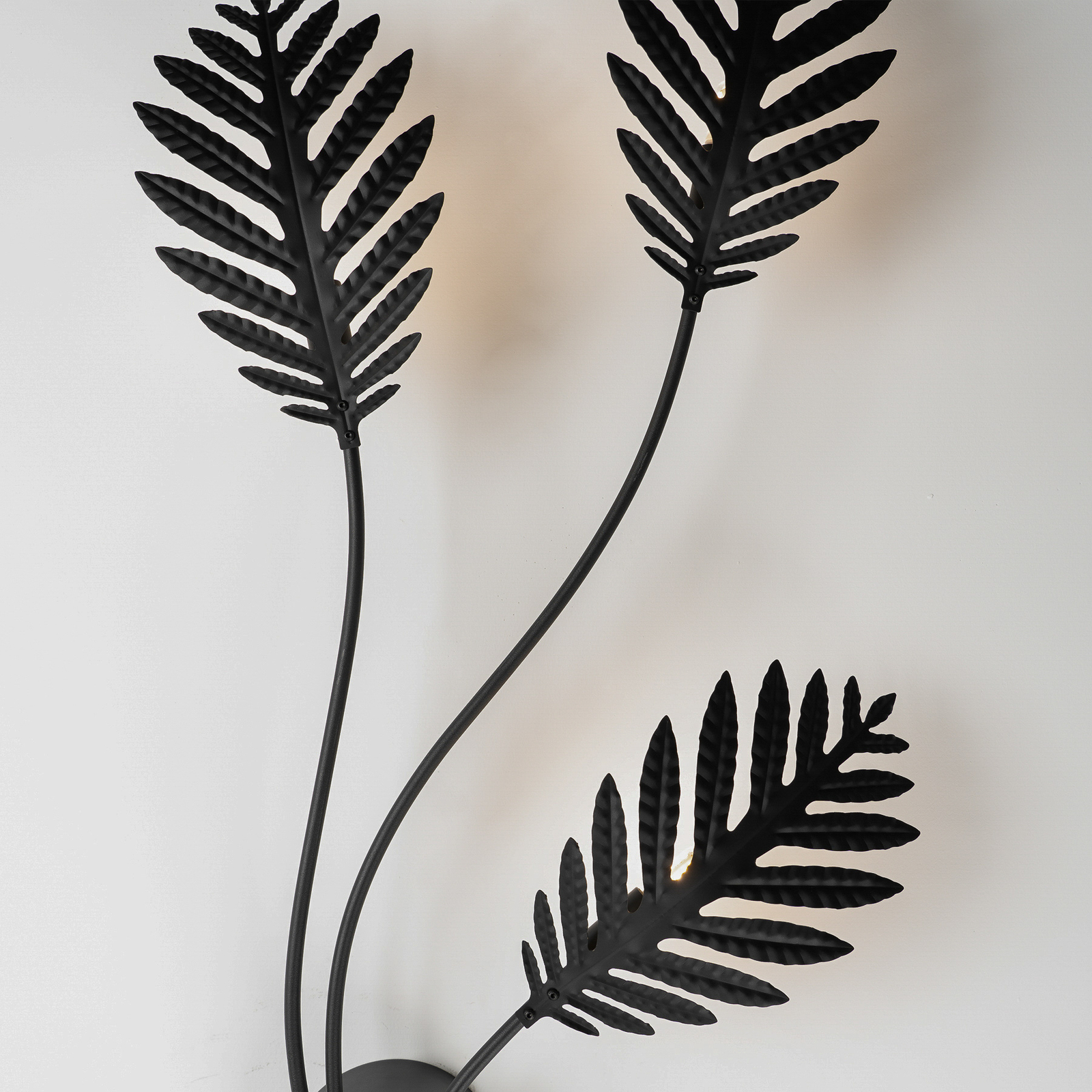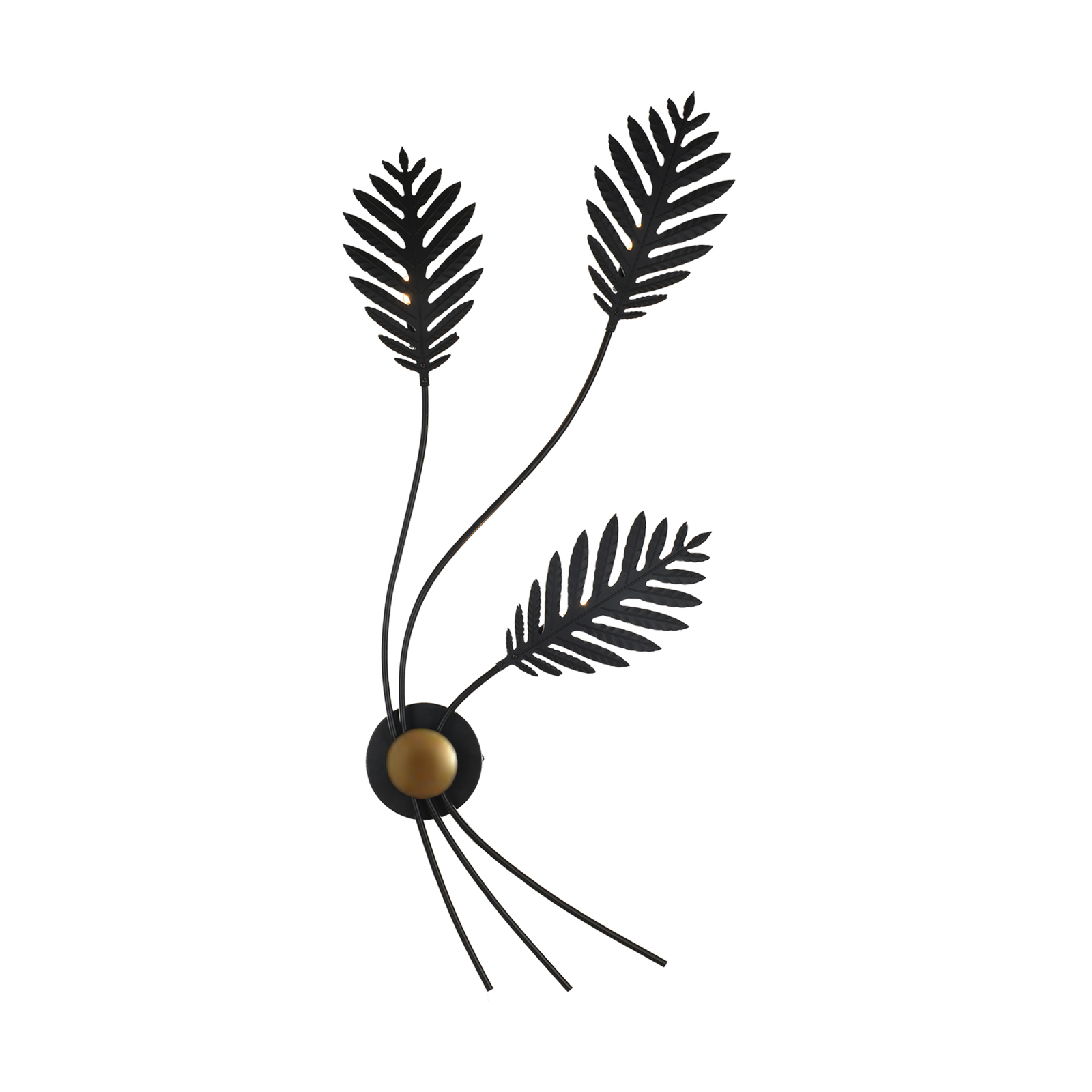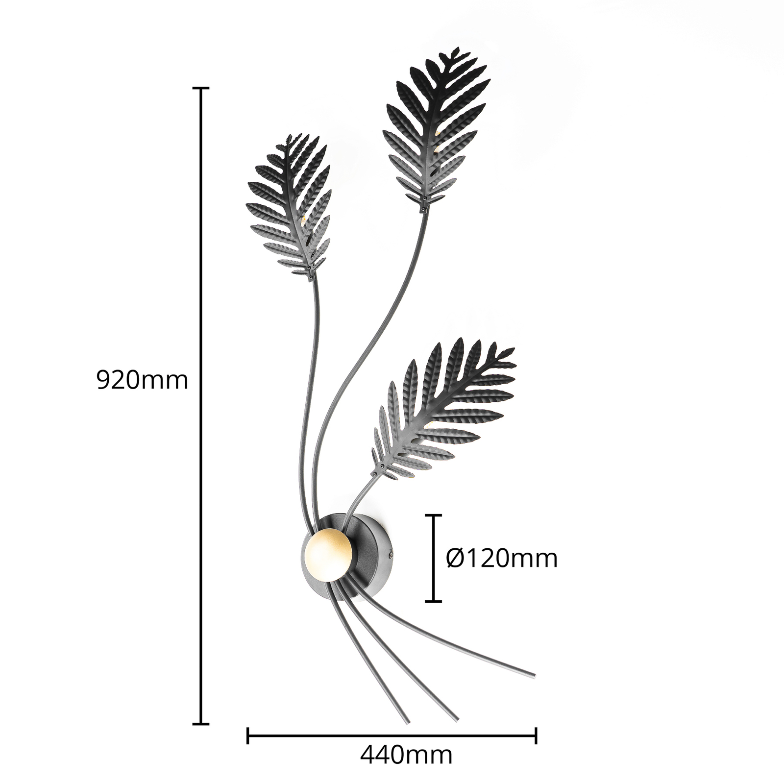 Tämä seinävalaisin on todellinen kohokohta asuintiloissa, ja se on valmistettu eksklusiivisella ja erittäin jalolla muotoilulla. Tätä varten kolme lehtiä muistuttavaa elementtiä on sijoitettu kauniisti vierekkäin, ja valonlähteet on sijoitettu niiden taakse niin, että valaisin on kauniisti valaistu takaa. Kaunis rautakehys on sävytetty kullanväriseksi, joten valon vaikutus on erityisen lämminsävyinen ja ennen kaikkea epäsuora. Tuloksena on upea valokuva seinällä, ja seinävalaisin ei ole vain kaunis korostusvalaisin, vaan myös erittäin houkutteleva koriste-esine asuinalueelle, jossa valo ja varjo yhdistyvät koristeelliseksi kokonaisuudeksi