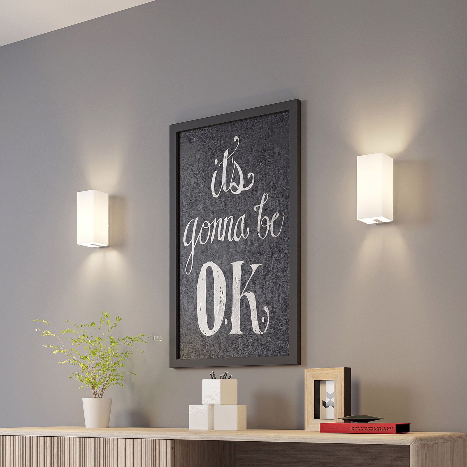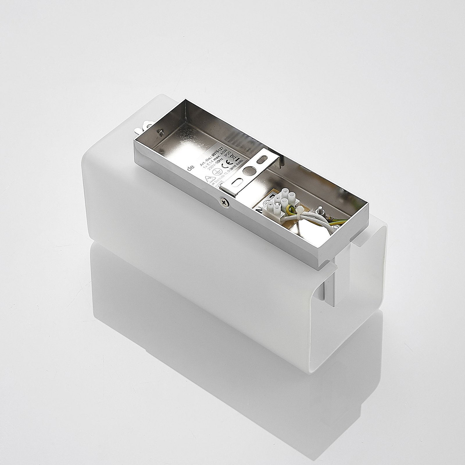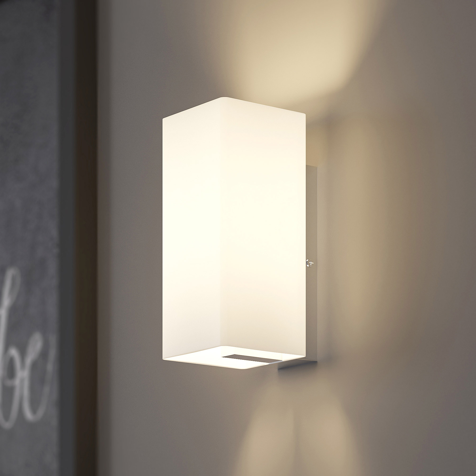 Tämän lasista valmistetun valkoisen seinävalaisimen muoto on kulmikas, joten lamppu on erityisen ajaton ja se voidaan asentaa monin eri tavoin olohuoneisiin ja käytäviin. Valosi on aina miellyttävä ja mukava, koska lasin pinta toimii kuin diffuusori ja kuljettaa valaistus pehmeästi huoneeseen aiheuttamatta häikäisyä. pidin voidaan varustaa halutulla valonlähteellä, myös tehokkailla LEDeillä ja erityisen lämpimällä valovärillä tai suositulla stepdim-tekniikalla, jota voidaan ohjata normaalilla kytkimellä.