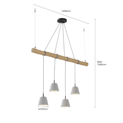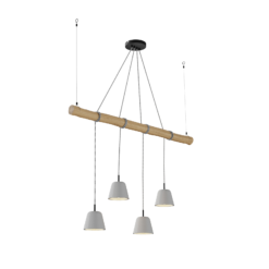 Asta sopii täydellisesti ruokailutilaan ja on riippuvalaisin, joka sopii täydellisesti skandinaaviseen sisustukseen sekä kauniiseen vintage-tyyliin. Mahdollisimman luonnollisen näköisestä puupalkista riippuu neljä betonista valmistettua pyöreää varjostinta. Niiden pinta on harmaa, kuten betonissa on, ja sopii hyvin yhteen puisen elementin kanssa. Valo säteilee alaspäin niin, että keittiönpöytä voidaan tällä valaisimella valaista hyvin. Nelilamppuinen ominaisuus takaa riittävän kirkkauden ja E14-kannat voidaan varustaa halutuilla lampuilla, myös lämpimällä värisävyllä varustetuilla LED-lampuilla. Tämä sopisi hyvin niin skandinaaviseen sisustukseen kuin myös vintagetyyliin, sillä näissä sisustustyyleissä kodikkuus on etusijalla.
