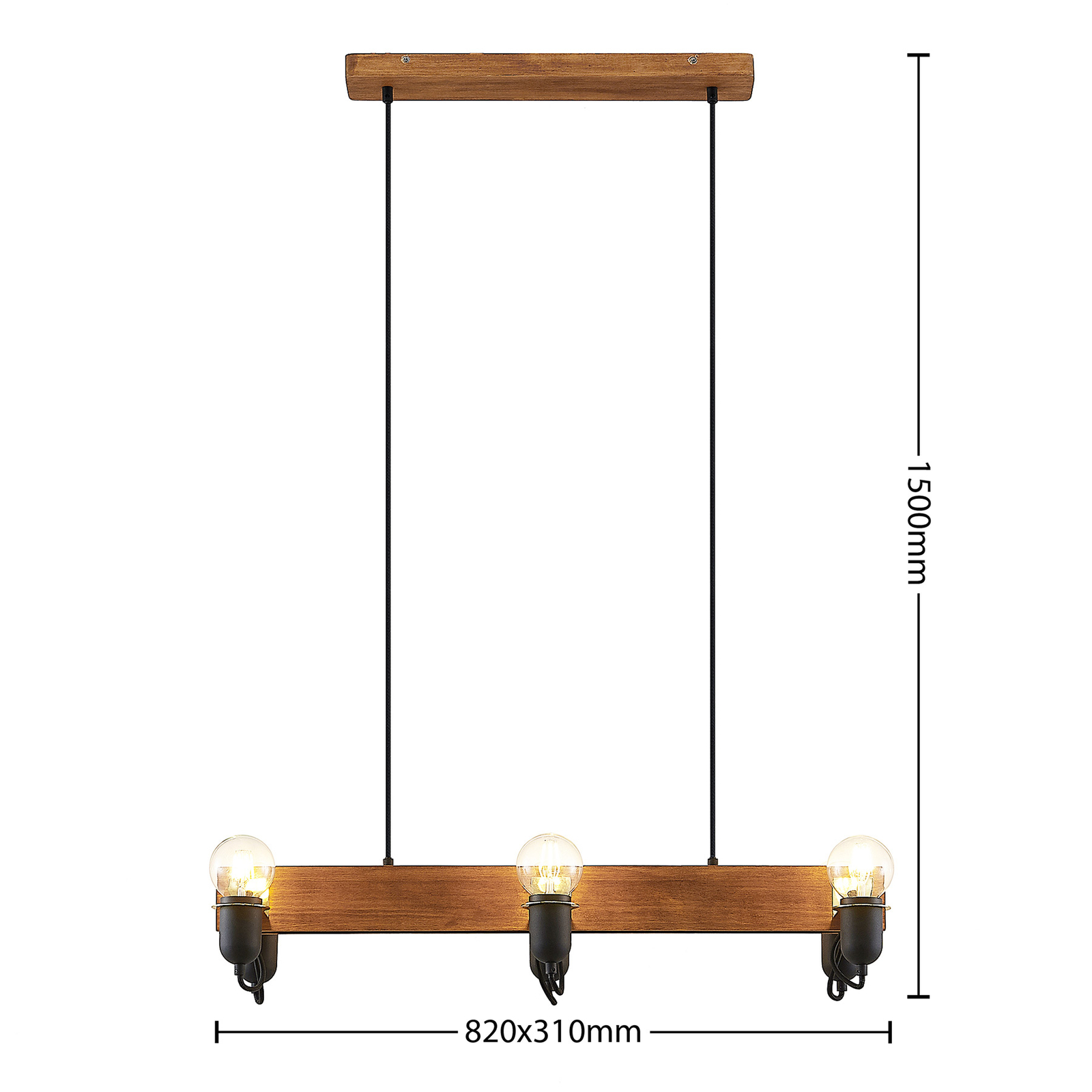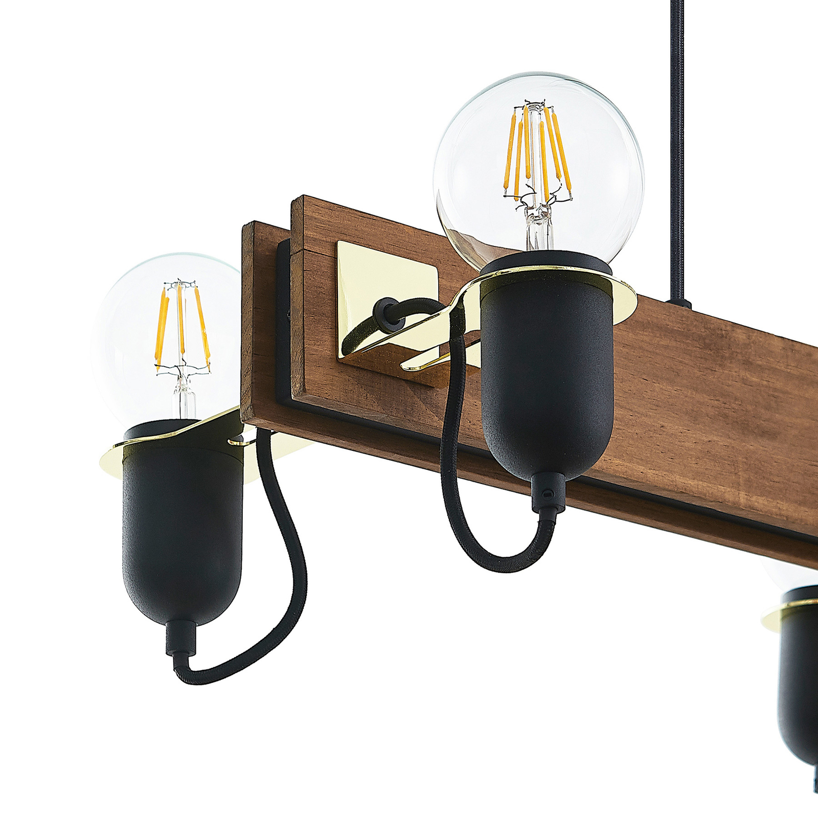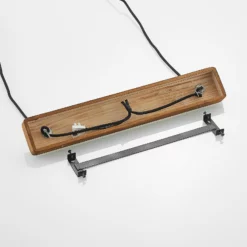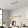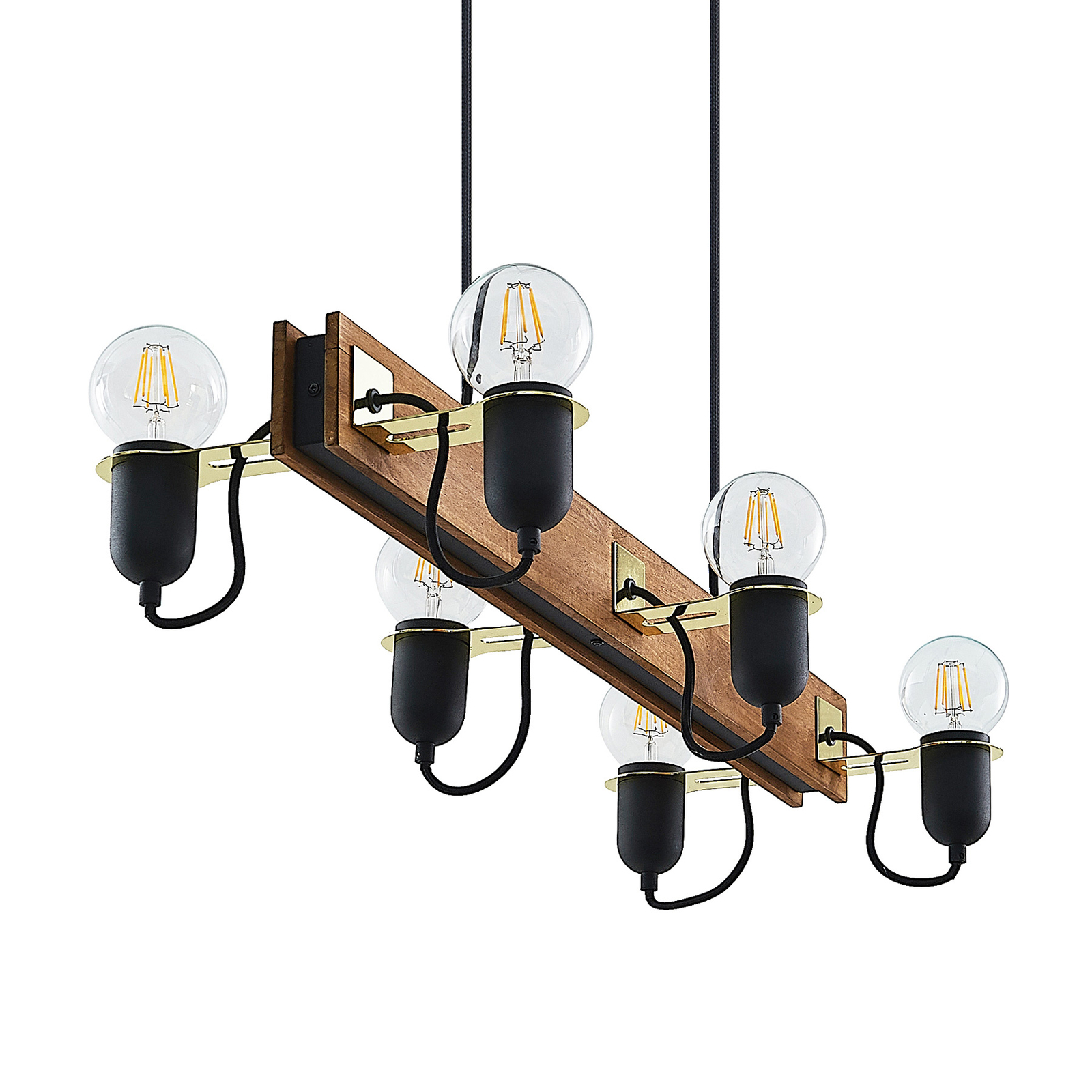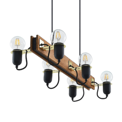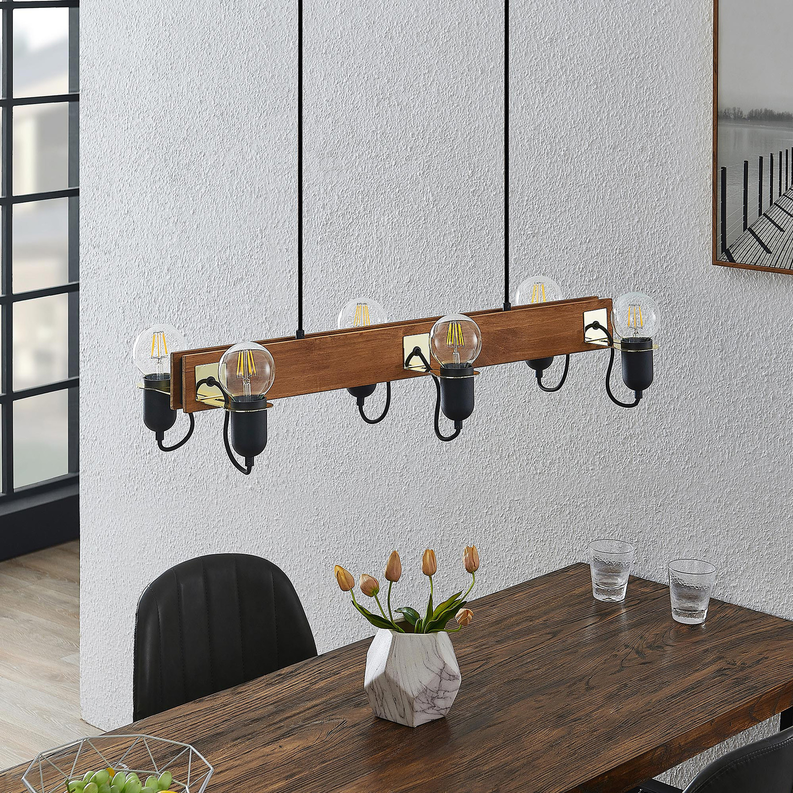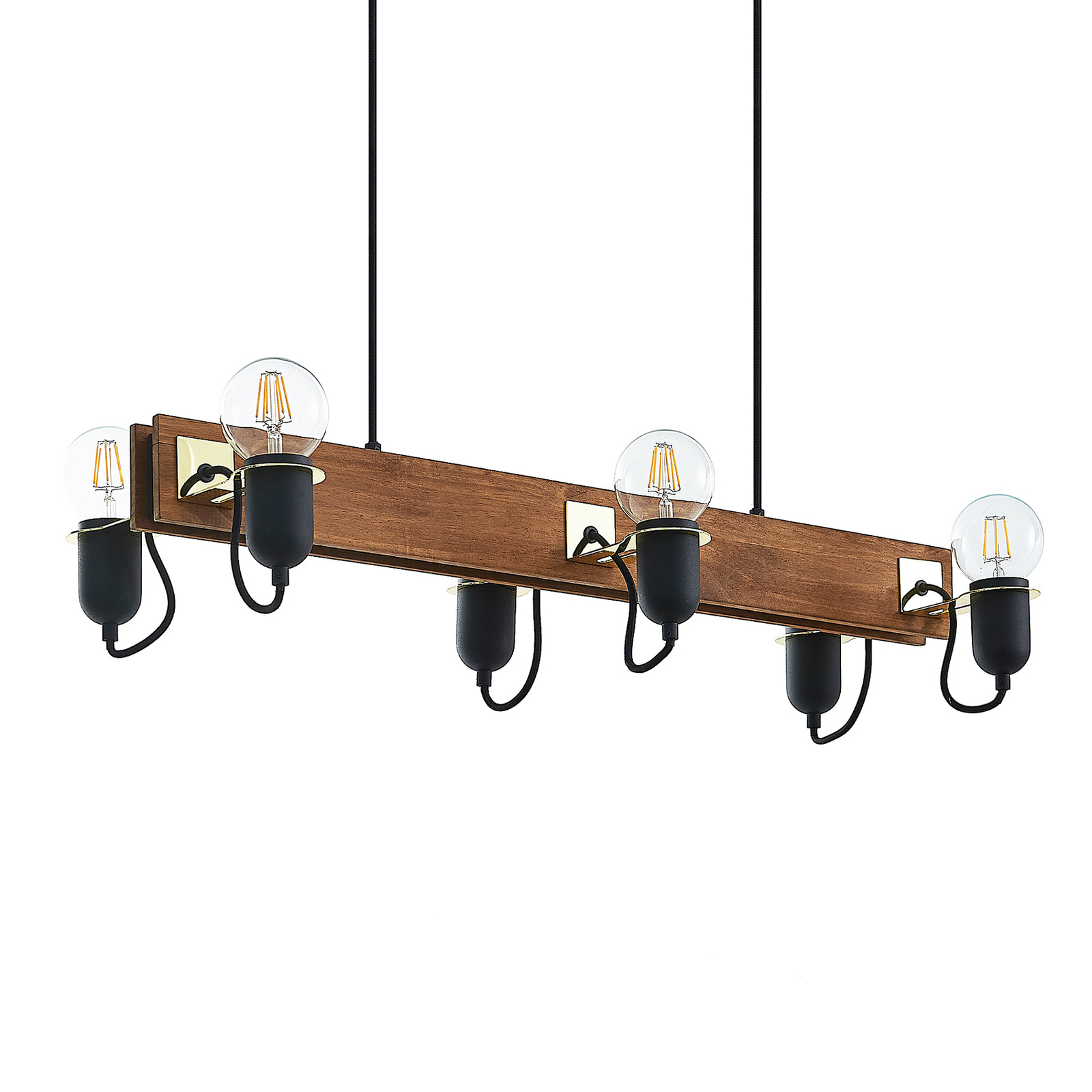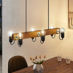 Becky voidaan sijoittaa hyvin tiskin tai ruokapöydän yläpuolelle olohuoneessa. Riippuvalaisin koostuu pitkänomaisesta puupalkista, jossa on hieman tummempi antiikkipinta, johon on kiinnitetty kuusi mustaa E27-lamppupistoketta, ja kiiltävästä messingistä valmistetut lisäelementit muodostavat onnistuneen värisekoituksen, joka myös skandinaavisissa sisustustyyleissä pääsee tehokkaasti esille ja näyttää aina tyylikkäältä ja tyylikkäältä. Lisäksi skandi-tyylille on useimmiten ominaista luonnonmateriaalien – tässä tapauksessa puun – käyttö ja samalla pelkistetty muotokieli, jossa keskitytään olennaiseen. Tämä pätee myös Becky-ruokailuhuoneen riippuvalaisimeen, jonka pistorasiat on suunnattu ylöspäin, jotta voidaan luoda erityisen viihtyisät valaistusolosuhteet. Pääpeililamppujen käyttö on mahdollista, jolloin olohuoneen valaistus on entistäkin viihtyisämpi.