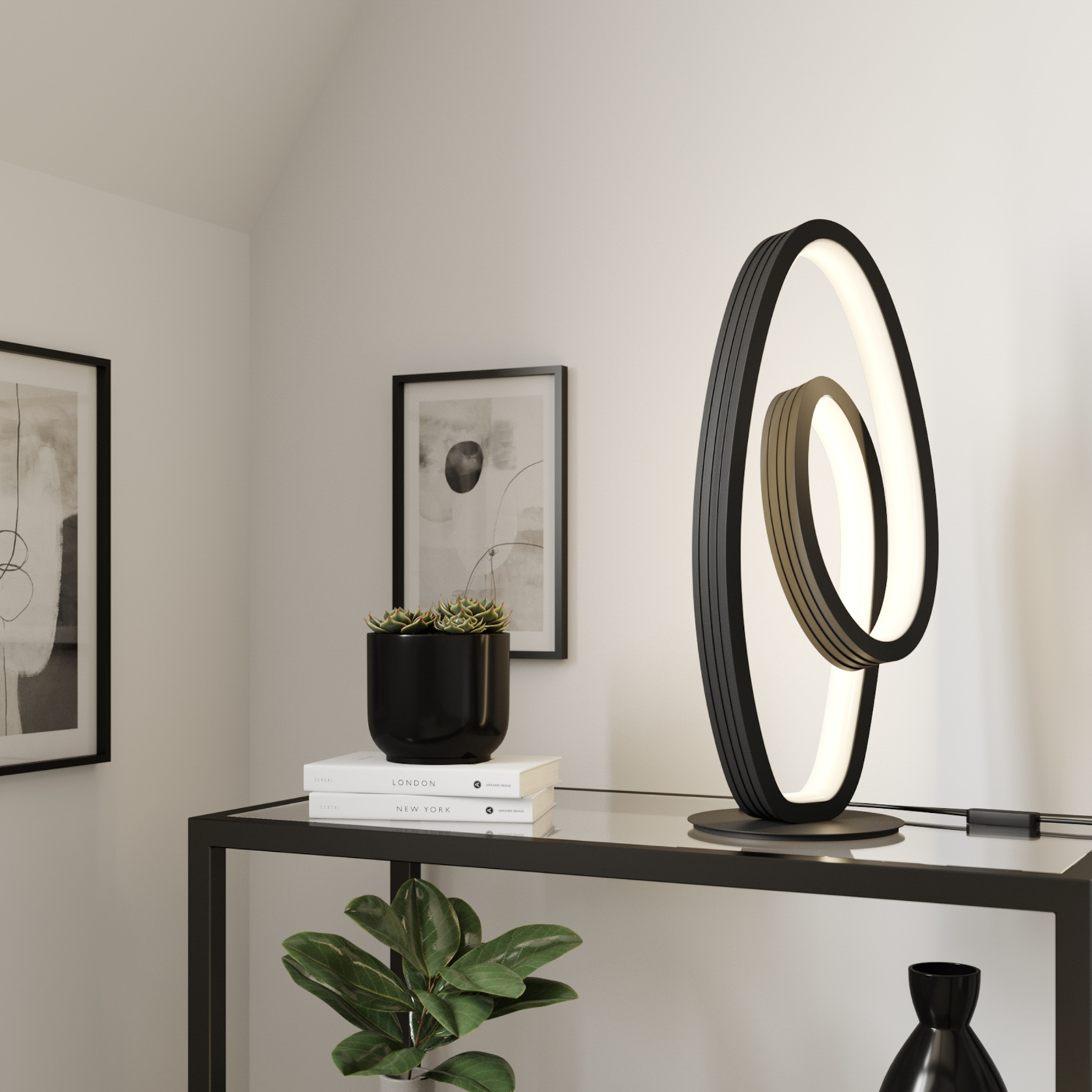 Bronwyn LED-pöytävalaisin, jossa on silmukka Bronwyn LED-pöytävalaisin näyttää erittäin mielenkiintoiselta varjostimen silmukan ansiosta. Antrasiittisen ulkopinnan ja valkoisen LED-kannen sisäpuolen välinen kontrasti auttaa myös erottumaan valaisimesta. Erityisominaisuutena valaisinta voidaan himmentää kolmessa vaiheessa arvoilla 100 % / 50 % / 10 %. Tällainen valaisin ei saisi puuttua modernisti sisustetusta kodista.