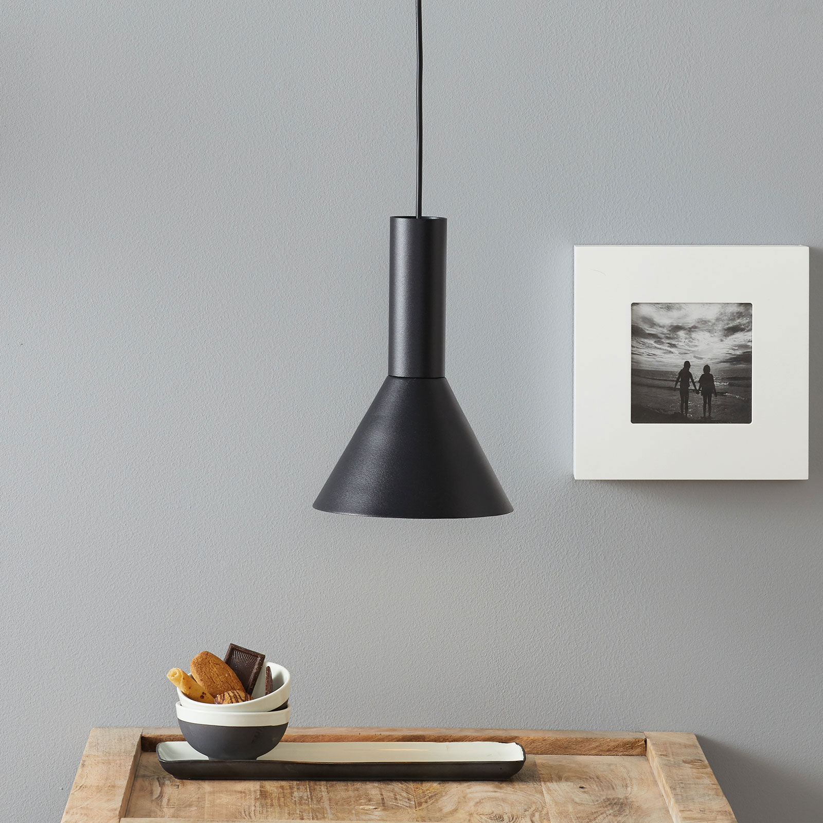 Caris-riippuvalaisin on pelkistetyn tyylikäs. Valaisin ihastuttaa selkeälinjaisella ja pelkistetyllä muotoilullaan. Valaisimessa on teräksinen, modernin musta runko. Alaspäin suunnatun varjostimen ansiosta valaisin sopii erinomaisesti pöydän yläpuolelle olohuoneeseen tai ruokailuhuoneeseen. Suppilon muotoisen varjostimen ansiosta myös sisällä oleva lamppu on näkyvillä (lamppu ei sisälly toimitukseen). Siksi valaisimeen kannattaa valita sen tyyliin sopiva, trendikäs filamentti- tai hiililankalamppu.