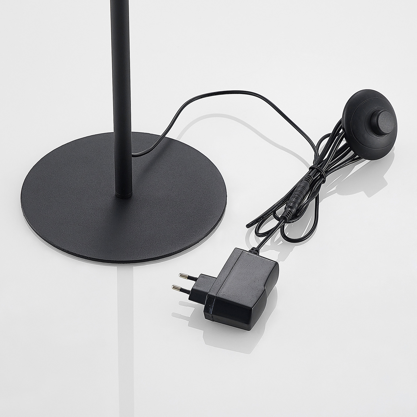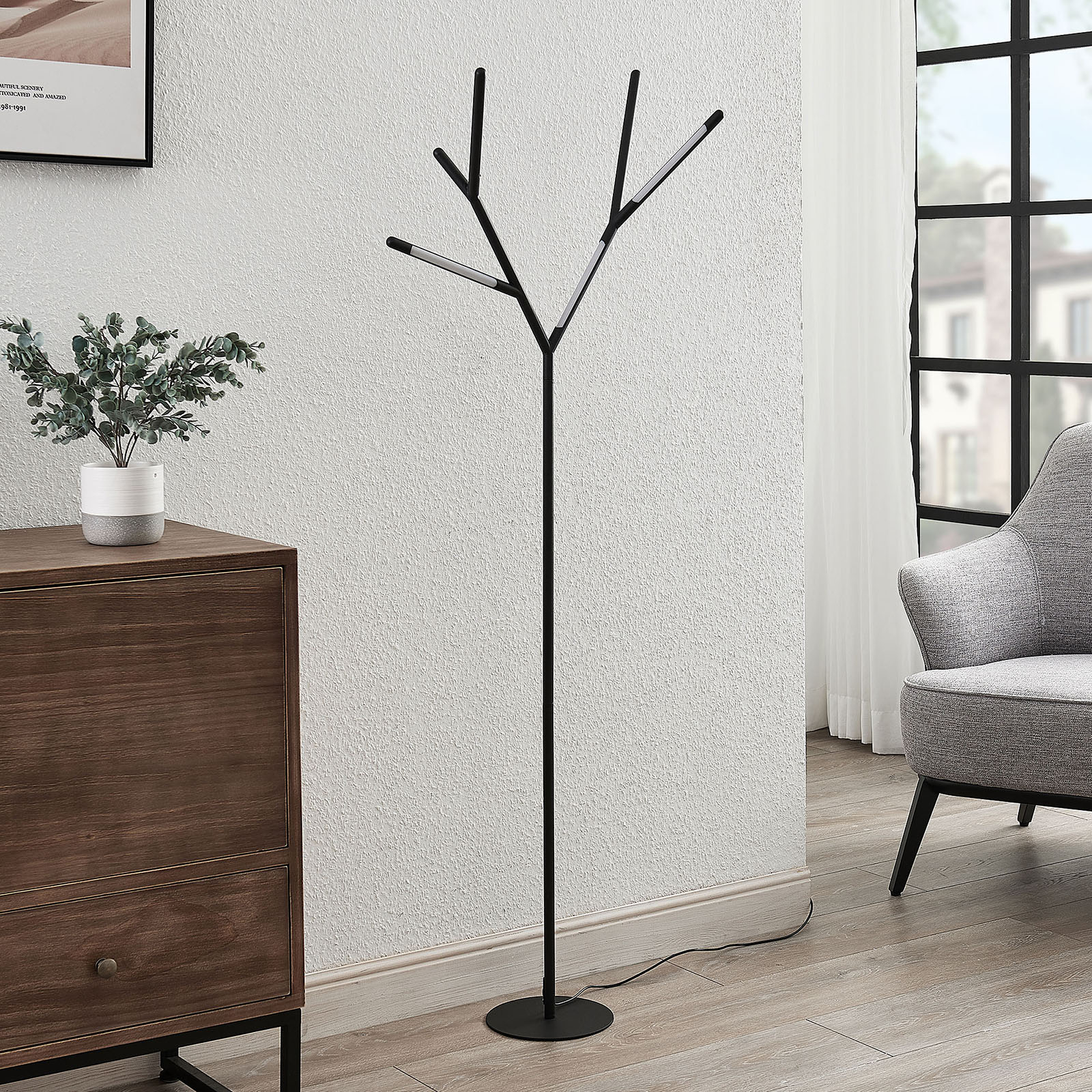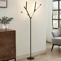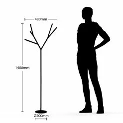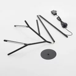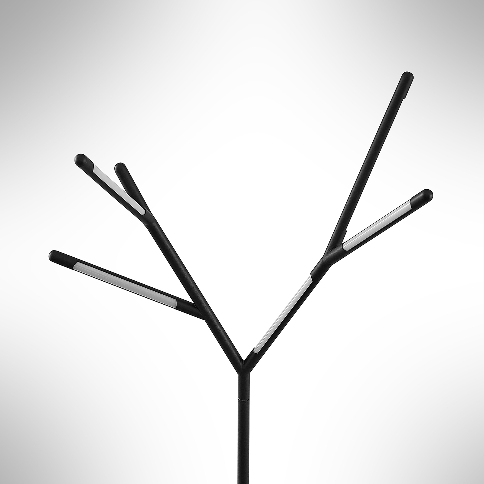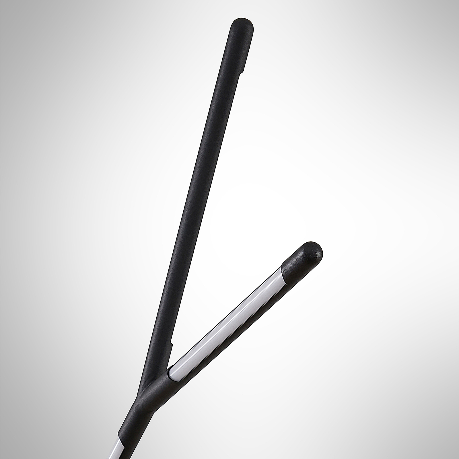 LED-lattiavalaisin Cuerno on lamppu, joka edustaa modernia tulkintaa sarvesta. Kolme sarvet muistuttavaa elementtiä ulkonee lattiavalaisin kehyksestä. Ne koostuvat osittain metallista, jossa on mattamusta pinta – aivan kuten runko ja jalka – ja osittain satiinipolykarbonaatista valmistetuista osista.