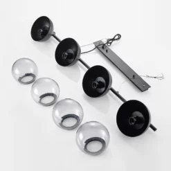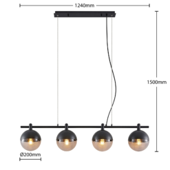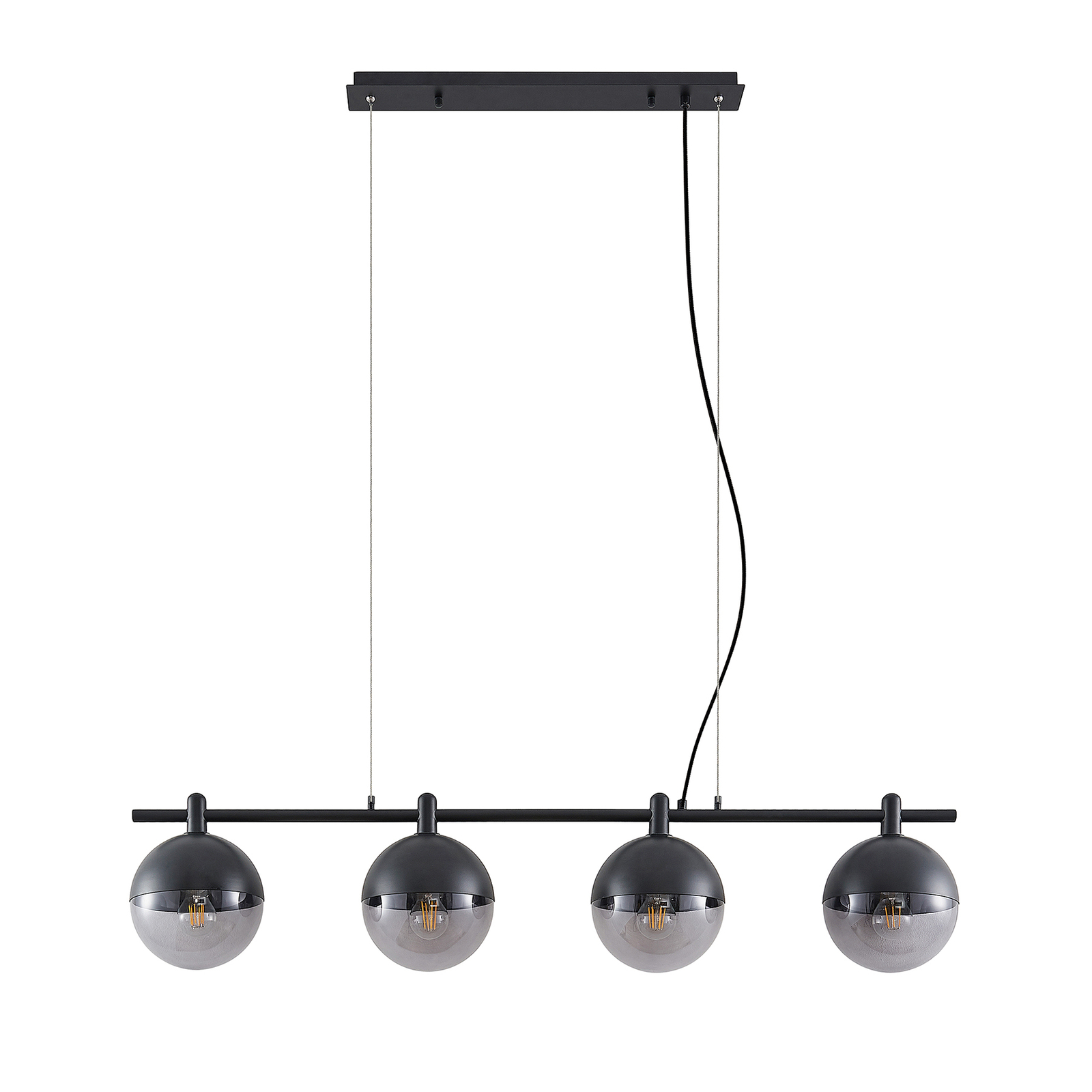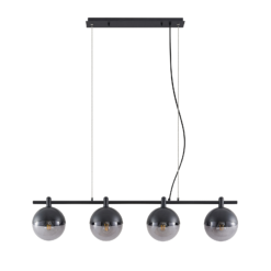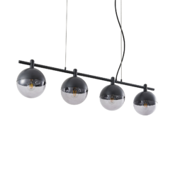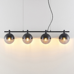 Dustian ihastuttaa monipuolisilla ominaisuuksillaan. Valaisimen neljä pallonmuotoista varjostinta kiinnittyy pitkänmalliseen suoralinjaiseen tankoon, ja valaisimen valo suuntautuu alaspäin. Varjostinten toinen puoli on mustaa metallia ja toinen puoli kirkasta lasia. Tämä kaksiosainen rakenne muodostaa modernin ja persoonallisen kokonaisuuden. Musta metallipinta on trendikäs ja tämän valaisinsarjan valaisinten tyypillinen piirre. Viileää modernia pintaa täydentävät kauniisti lämpimän valkoisen, lähes meripihkan sävyisen valon tuottavat lamput. Nelilamppuinen riippuvalaisin sopii hienosti ruokailuhuoneeseen tai saarekkeen yläpuolelle. Valaisimen dynaaminen mutta silti kepeä muotoilu sopii myös moderneihin oleskelutiloihin.