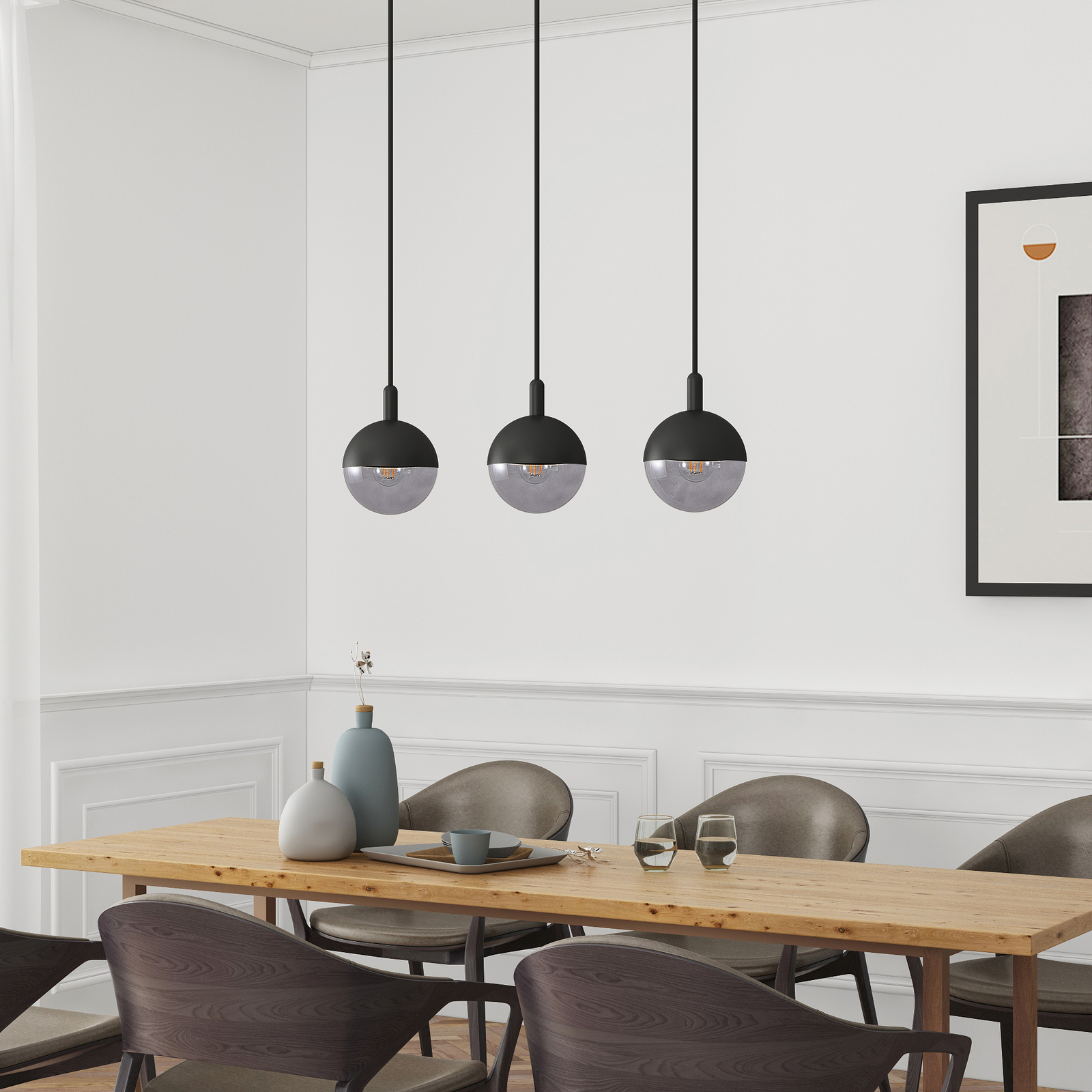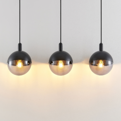 Kolmilamppuinen ja selkeälinjainen Dustian-valaisin sopii erinomaisesti ruokailutiloihin. Riippuvalaisimessa on kolme pallovarjostinta, joiden toinen puoli on metallia ja toinen puoli kirkasta lasia. Tämän valaisinsarjan tuotteet ovat persoonallisia, tyylikkäitä ja kepeitä valaisimia, jotka sopivat hyvin moderniin sisustukseen. Varjostinten metalli- ja lasiosat on helppo irrottaa toisistaan ja kiinnittää takaisin lampun vaihdon yhteydessä. Varjostimen aukko on riittävän tilava myös nk. globe-lamppuja varten (lampun halkaisija enintään 9,5 cm). Nämä isot lamput ovat erityisen kauniita kirkkaan lasin takana. Valaisimeen sopivat myös pääpeililamput, jotka valaisevat miellyttävästi ja häikäisemättömästi. Vaihtoehtoisesti valaisimeen käyvät kaikenlaiset LED-filamenttilamput, joissa on erittäin lämmin valoväri.