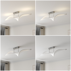 Kuten lintu, joka purjehtii tuulessa leveillä siipillä, vaikuttaa kattovalaisin Edano valkoisella kangasvarjostimellaan, joka on suunniteltu kaarevassa muodossa ja joka on ripustettu pienellä etäisyydellä alumiinista valmistettuun kattokiinnike . Moderni LED-kattovalaisin tekee vaikutuksen poikkeuksellisesta muotoilustaan ja koostaan ja on siksi ihanteellinen isoon olohuoneeseen tai makuuhuoneeseen.