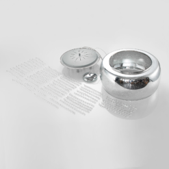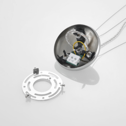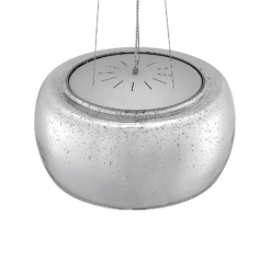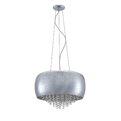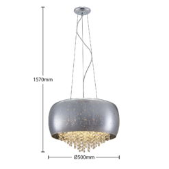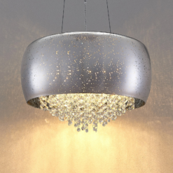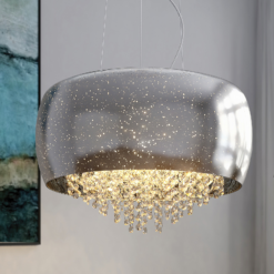 Etualalla on rehevä varjostin, joka tehtiin käsin puhalletusta lasista. Sillä on lieriömäinen ja pyöristetty muoto ja se loistaa ulkopuolelta kuin tähtikirkas yötaivas. Kromivärimaailma voidaan yhdistää upeasti erilaisiin huonekaluihin. Ripustettavat kristallielementit tarkentavat tätä erityistä lamppua ja antavat sille erehtymättömän kosketuksen.