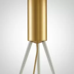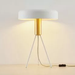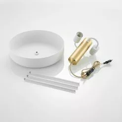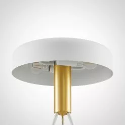 varjostin ja runko valkoinen pinta hallitsee pöytälampun ulkonäköä värin suhteen ja tarkoittaa harmoniaa ja ajattomuutta, vain harjatusta messingistä valmistettu metallielementti ja värikoordinoidut tekstiilikaapelit, joissa on integroitu kytkin, tarjoavat erityisiä aksentteja ja ovat ominaisuuksia, jotka tekevät suuresta Arvoa on asetettu valittujen yksityiskohtien käyttöön.