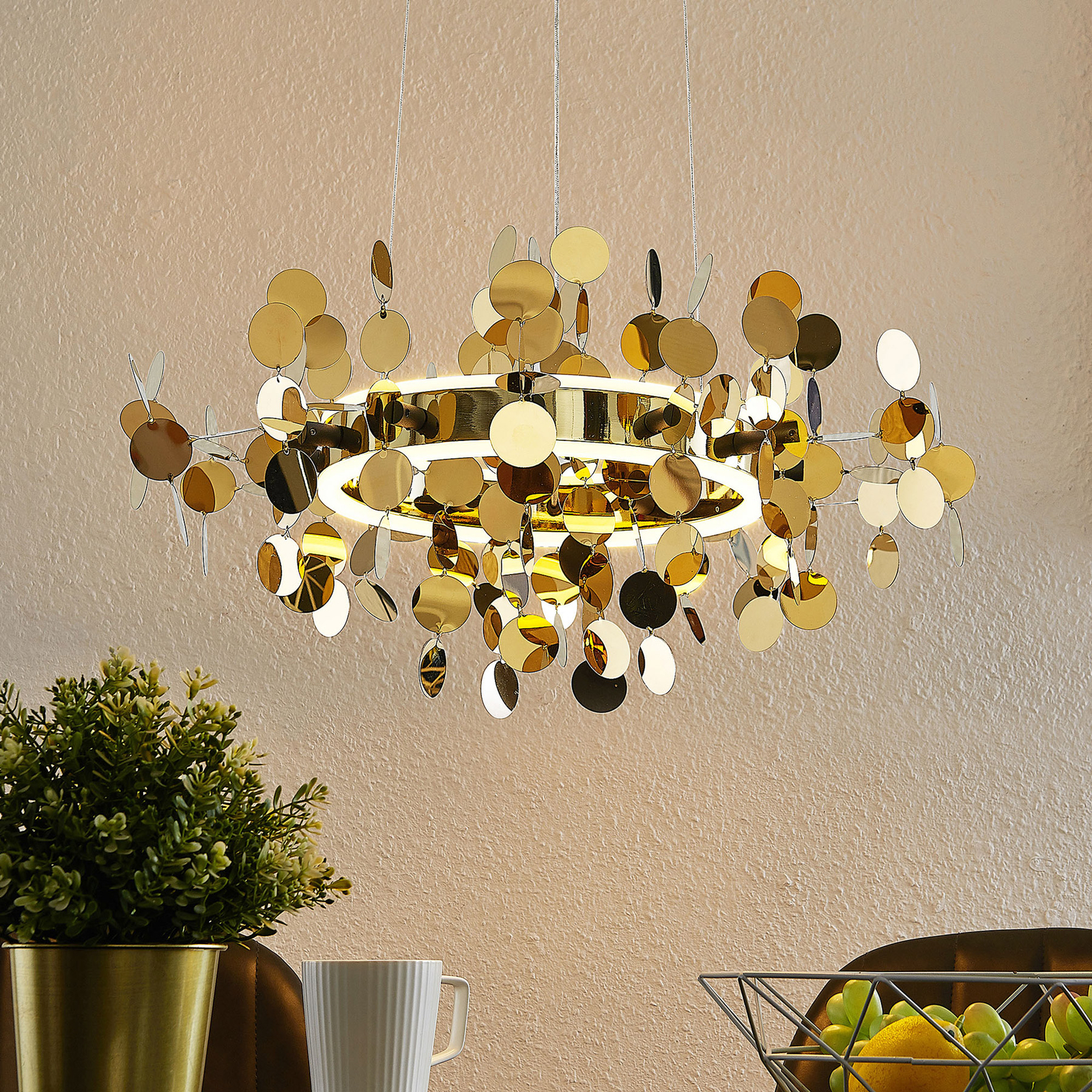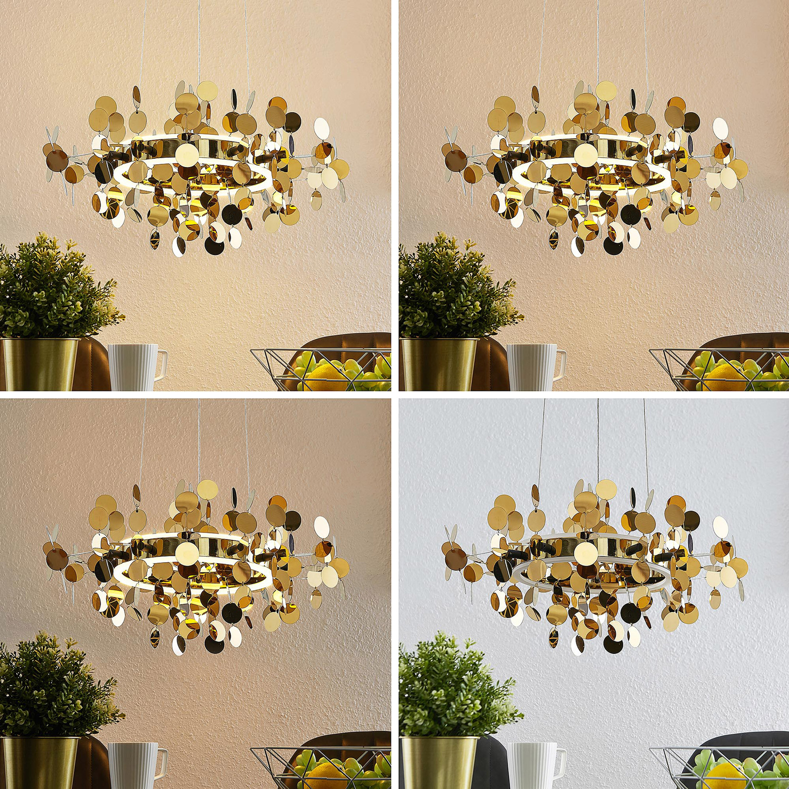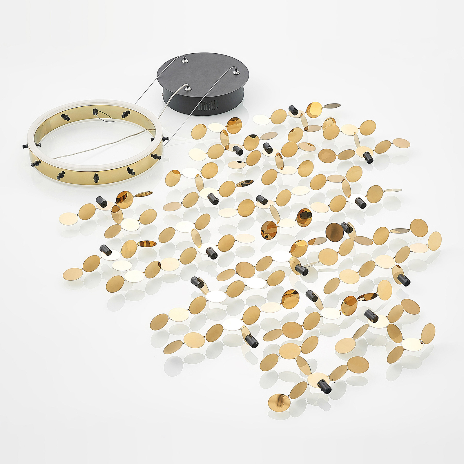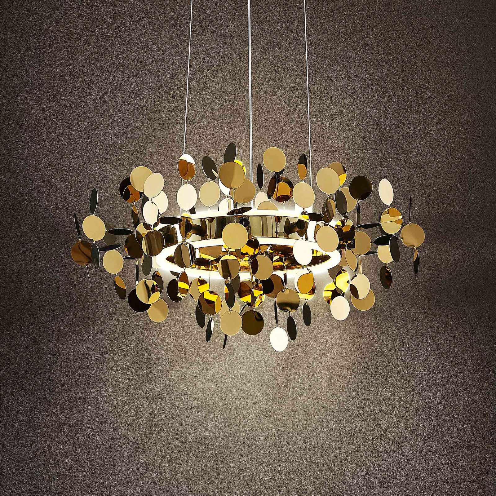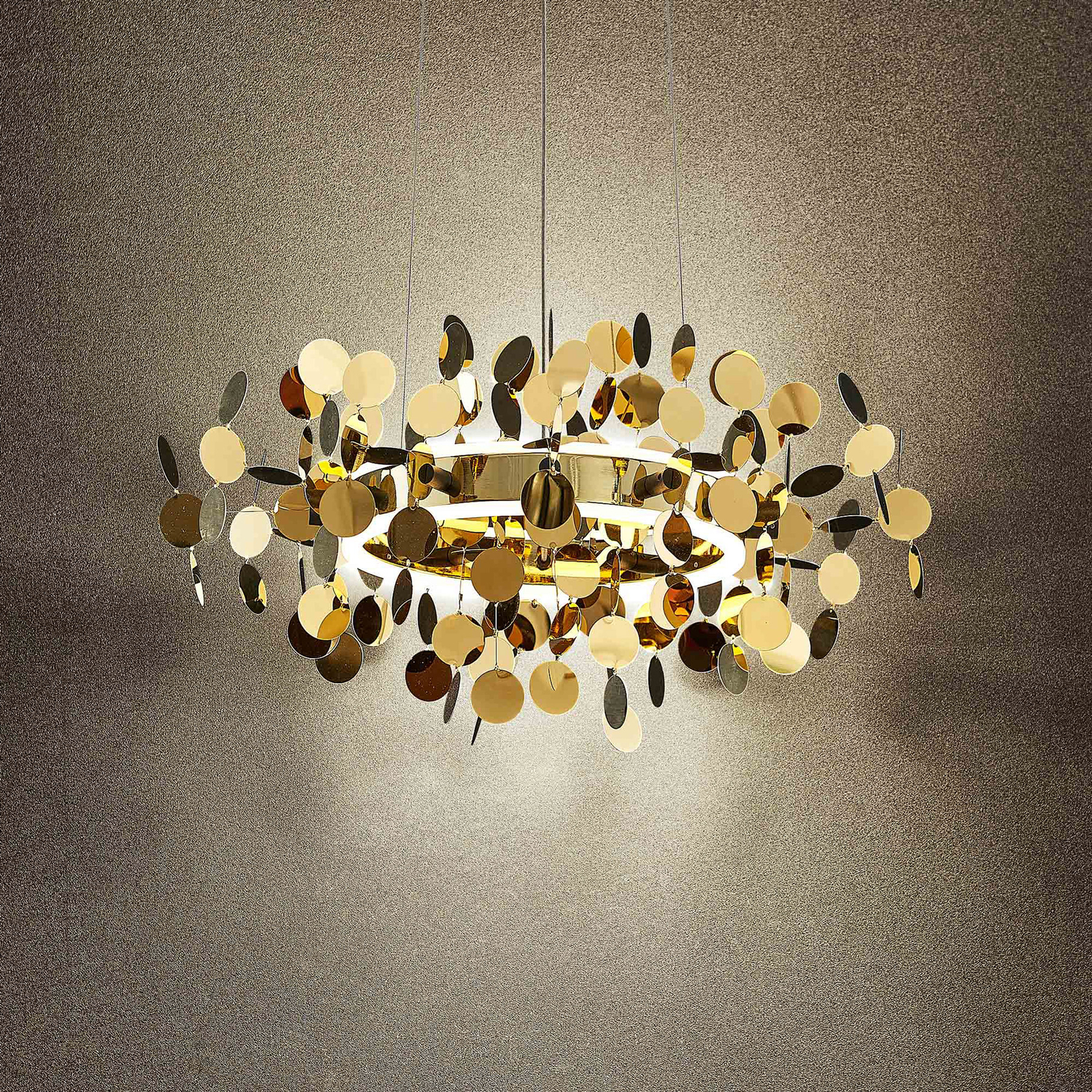 Glimmo-LED-riippuvalaisin tekee vaikutuksen ainutlaatuisella ulkonäöllä. Se valmistettiin raudasta, alumiinista ja akryylistä, ja siinä yhdistyvät kaksi kontrastiväristä harmoninen kokonaiskonsepti. Pyöreä kattokiinnike ja varjostin peitettiin mustalla pinnalla. Pyöreät koriste-elementit, jotka näyttävät kelluvan renkaan muotoisen varjostin , on suunniteltu hienoksi messingiksi. Lämmin valkoinen valo säteilee tasaisesti kaikilta puolilta. Tätä kaunista muotoilua voidaan epäilemättä käyttää menestyksekkäästi paitsi omassa kodissasi myös hotelli- tai ateriapalvelualalla.