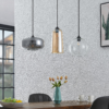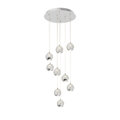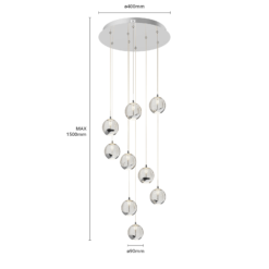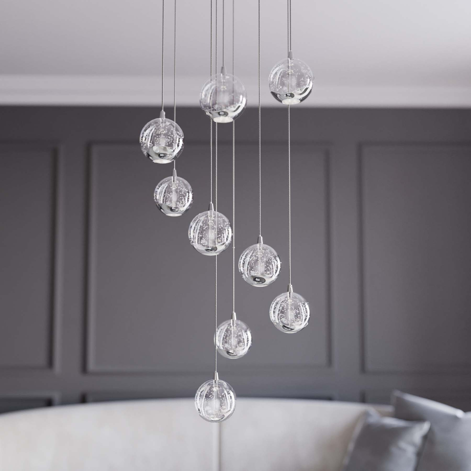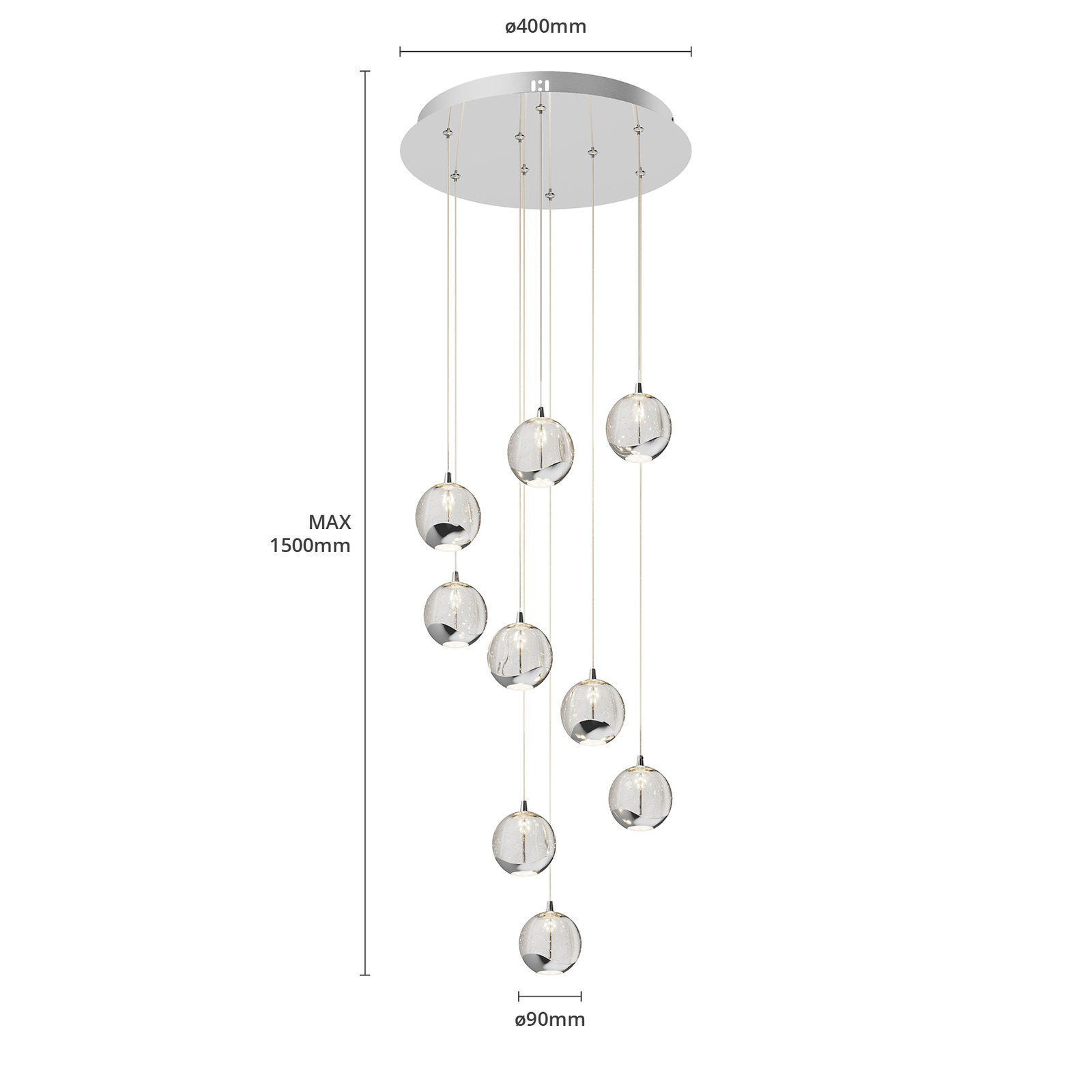 Yhdeksän lasipallon sisäosassa on koristepuhallus ja alapuoli on suljettu metallielementillä. Valaisimen pyöreässä kattokiinnikkeessä on moderni kromattu pinta, joka viimeistelee valaisimen yksilöllisen tyylin. Valaisin toimii näyttävän muotoilunsa ansiosta sisustuksen kauniina katseenvangitsijana myös valon ollessa pois päältä.