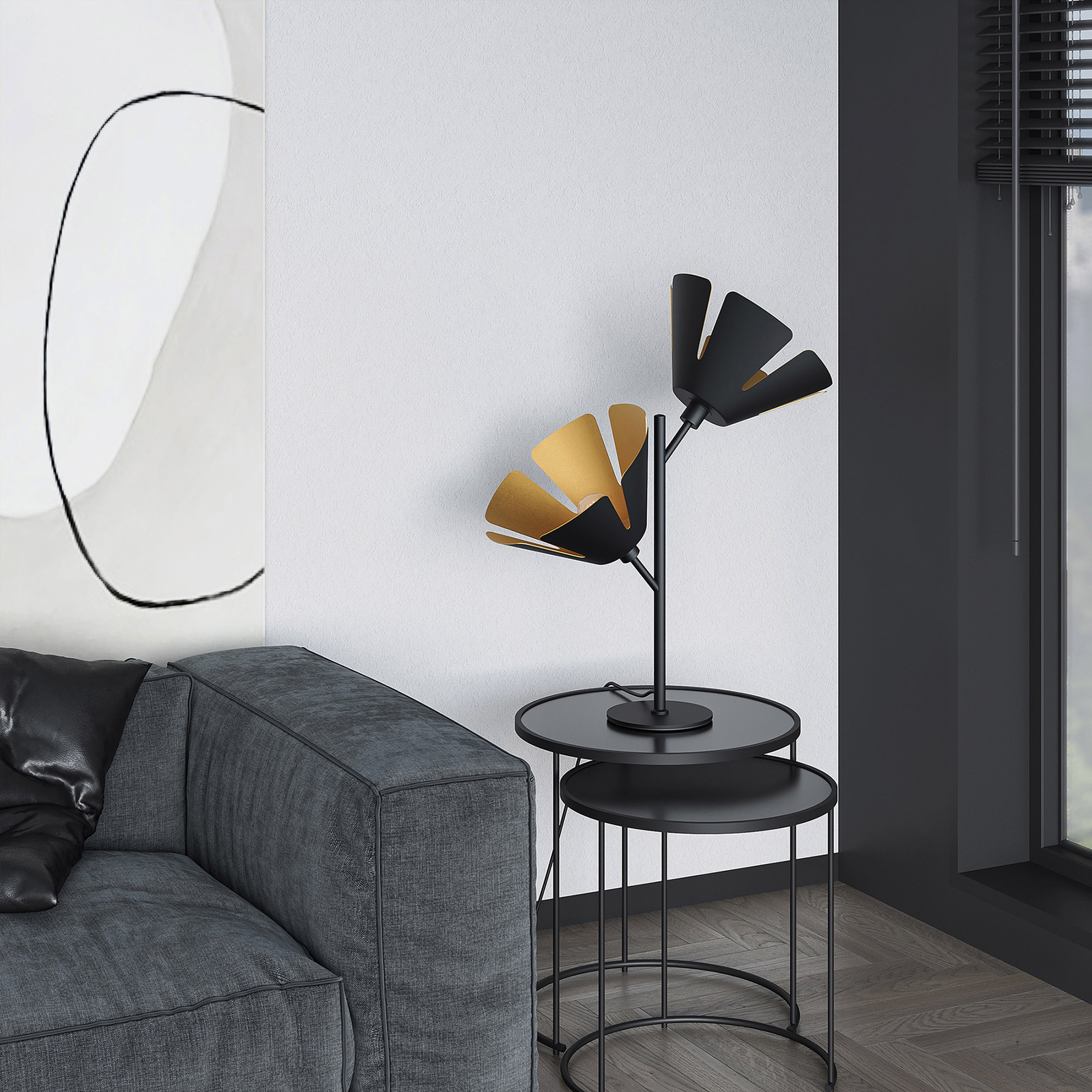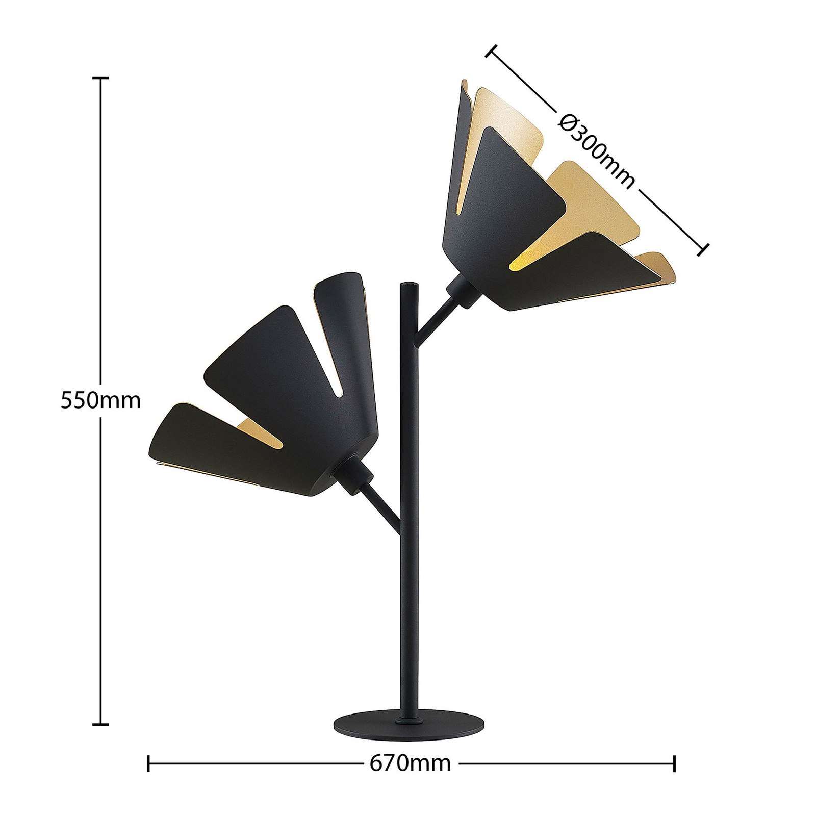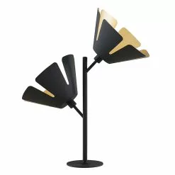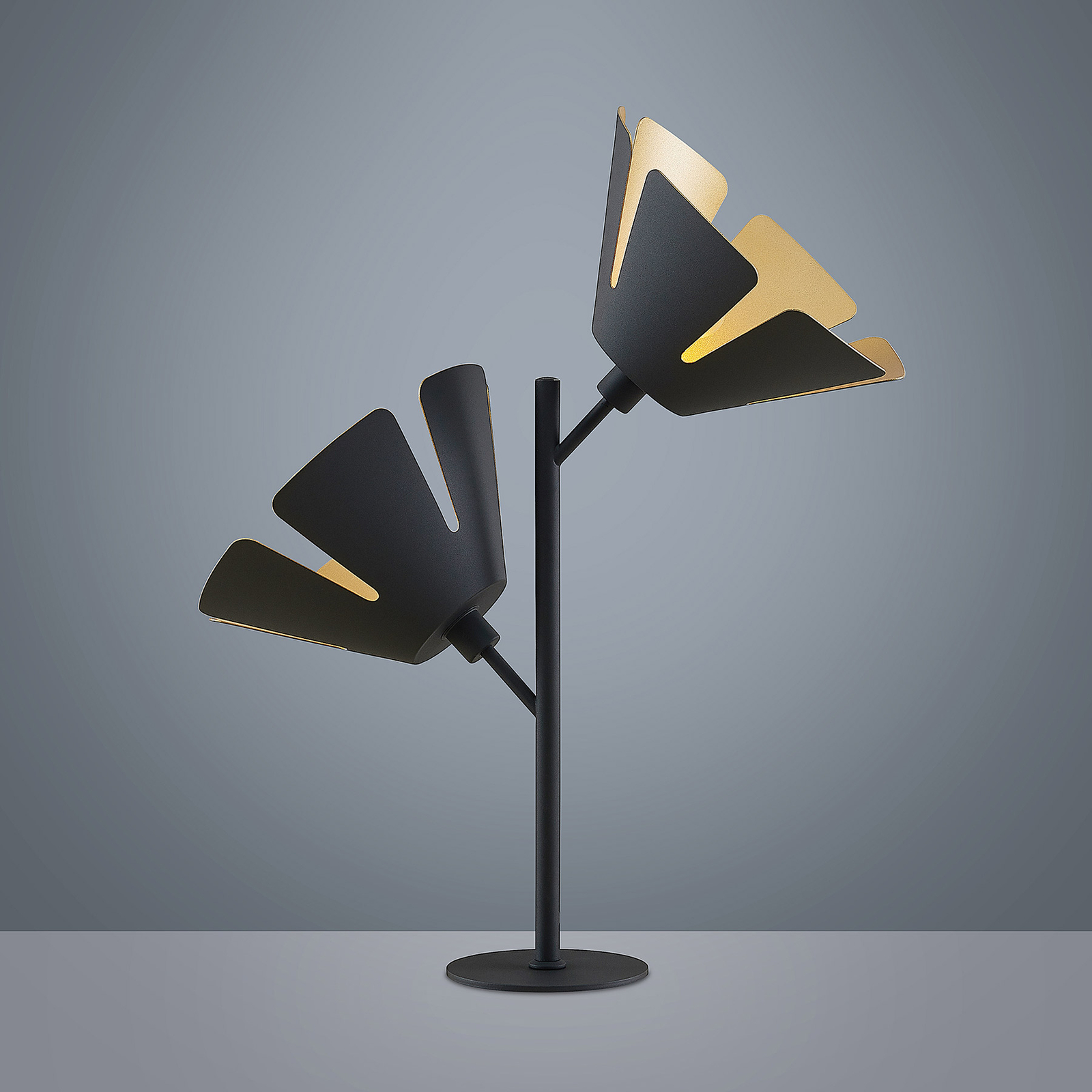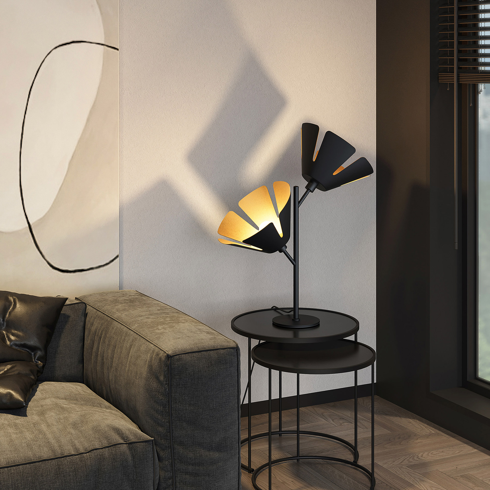 Tässä pöytävalaisimessa on eksklusiivinen muotoilu, ja siinä on kaksi ylöspäin suuntautuvaa ja eri korkeudella istuvaa hajautettua lampunvarjostinta. Jalustan ja tangon tavoin ne on pidetty ulkopuolelta mattamustana, mutta sävyjen sisäpuoli on pidetty pehmeän kullanvärisenä, mikä luo kauniin kontrastin, mutta ennen kaikkea vakuuttaa verrattoman lämpimällä ja kodikkaalla valaistusteholla. Sivuilla olevien lovien ansiosta näitä kahta sävyä voidaan pitää myös hyvin modernina tulkintana kukkasuunnittelun tyylistä, ja ne muistuttavat siten hieman kukkia. Erittäin kaunis moderniin huoneeseen ja erityiseen viihtyisyyteen kauniilla korostusvalaistuksella!