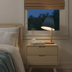 Tälle pöytävalaisimelle on ominaista toisaalta selkeä, perinteinen muotoilukieli, mutta toisaalta myös epätavalliset yksityiskohdat. Esimerkiksi on kiiltävä kromirengas, joka pitää mustaa tekstiilikaapelia ja johtaa varjostin pohjaan. Hieman kääntyvä varjostin estää ympäröivän valaistus varovasti ja antaa valon poistua kohdennetummin alaspäin, mikä luo erittäin kodikkaan valaistuksen asuin- ja makuutiloille. varjostin, joka ei tosin ole kovin yleinen, tulee pöytälampun erityinen katseenvangitsija ja se koostuu hienosta kankaasta, kun taas runko on valmistettu korkealaatuisesta puusta, ja se on kauniisti käsitelty ja korostaa yleisen ilmeen luonnollisuutta. Voisit melkein ajatella, että tämä lamppu on uudelleentulkinta skandinaavisesta mukavuudesta!