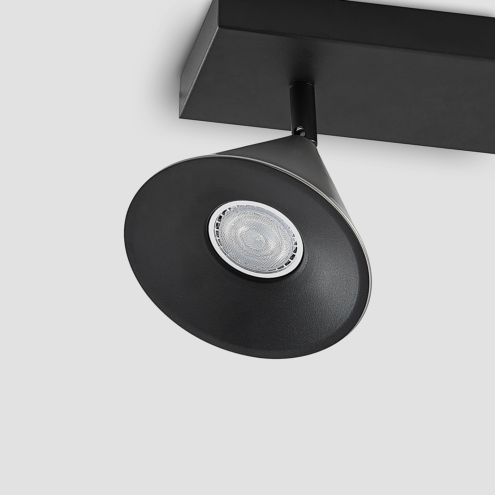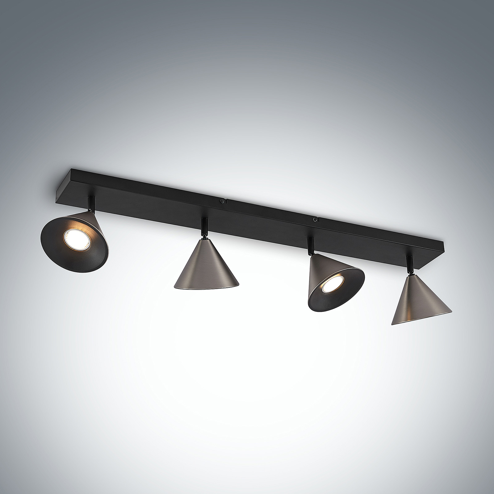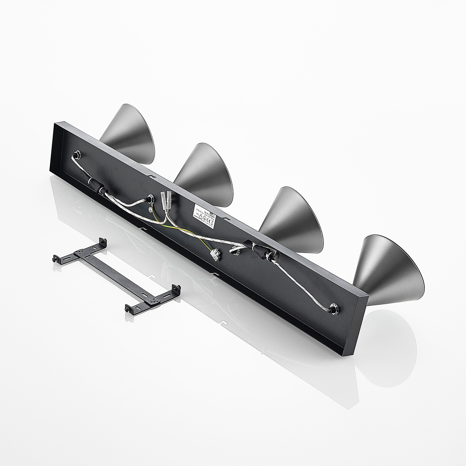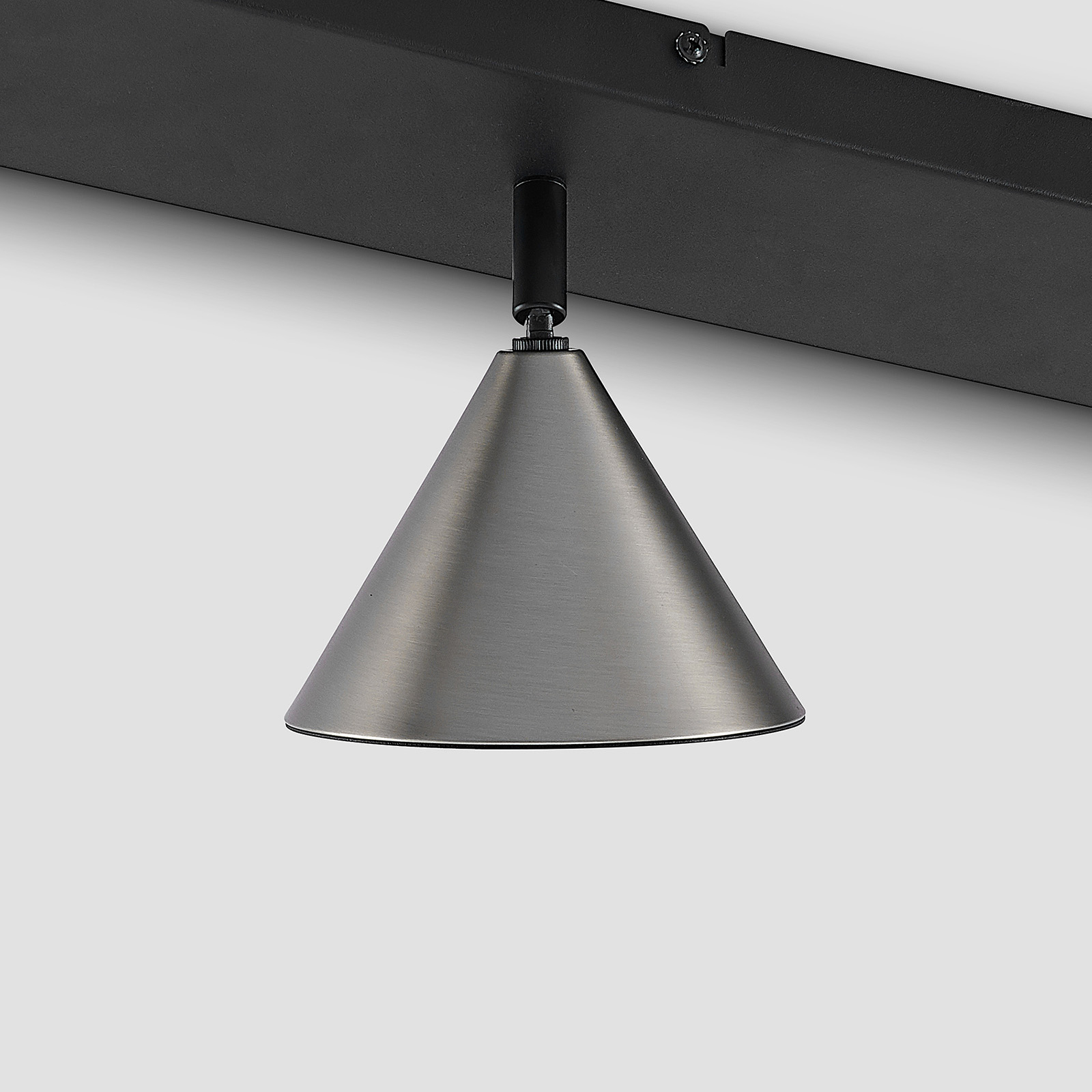 Tyylikkäässä valaisimessa on suoralinjainen, musta kiinnityslevy ja neljä kartion muotoista, nikkelinväristä varjostinta. Design-tyylisen valaisimen varjostimissa on korkealaatuinen ja tyylikäs mattanikkelipinta.