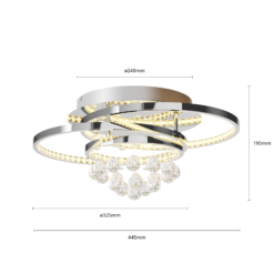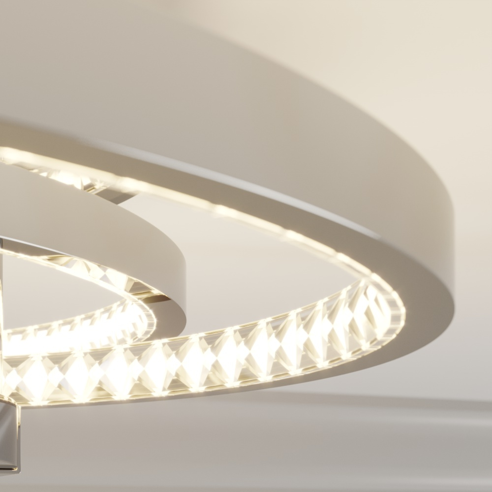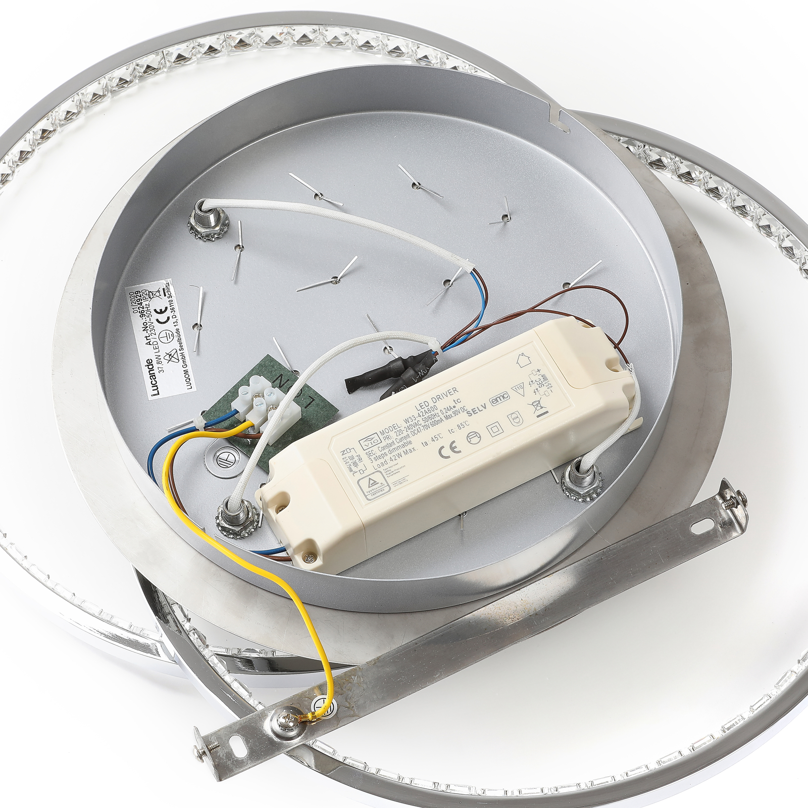Keely-LED-kattovalaisin koostuu kahdesta kiiltävästä kromikehästä, joiden toisella puolella on LED-valot. Lämpimän valkoiset LEDit on asennettu kristallimaisen suojuksen alle, mikä saa valon kimaltelemaan kauniisti. Tätä vaikutelmaa korostaa kansilevyn kristalliyksityiskohta, joka sijaitsee kehien leikkauskohdassa. Keely-LED-kattovalaisin sopii moderneihin olohuoneisiin, ruokailuhuoneisiin tai eteistiloihin, joissa valaisin luo lämmintä tunnelmaa. Kattovalaisimen integroitua himmennystekniikkaa voidaan käyttää tavallisen seinäkatkaisijan avulla. Valaisimessa on kolme kirkkaustasoa 100 %:n valotehosta 10 %:n hämärään valaistukseen.