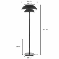 Muotoiluun suuntautunut Kellina-lattiavalaisin tummalla ulkonäölläTämä lattiavalaisin on nykyaikaisen muotoilun omaava ja näyttää erittäin hyvältä modernissa ympäristössä. Se on valmistettu raudasta ja päällystetty hiekanmustalla pintakäsittelyllä. Sen ilmeen etualalla on kaksinkertainen lampunvarjostin, jonka muoto on pyöristetty alaspäin. Varjostimen ansiosta valo säteilee häikäisemättä, joten tämä valaisin soveltuu erilaisiin käyttötarkoituksiin. Se voi tehdä hyvää jälkeä niin omassa olohuoneessa kuin liiketiloissa, ja se näyttää tyylikkäältä kodin lisävarusteelta myös sammutettuna.