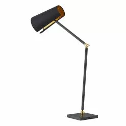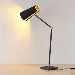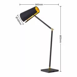 Kemoni-pöytävalaisimessa on vakaa, neliön muotoinen raudasta valmistettu lampunjalka ja ohut runko, jota voi tarvittaessa säätää. Lampunvarjostin on valmistettu tekstiilistä, ja sen klassinen väri on musta. Sävyn sisäpuoli kuitenkin yllättää lämpimällä kullan sävyllä. Tämä pöytävalaisin on ehdottomasti muotoilupainotteinen, ja sitä voidaan käyttää yksityisten tilojen lisäksi myös kaupallisissa tiloissa. Modernin ulkonäkönsä ansiosta se korostaa mitä tahansa työpöytää ja näyttää hyvältä myös sammutettuna.