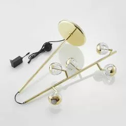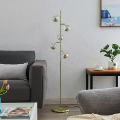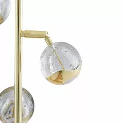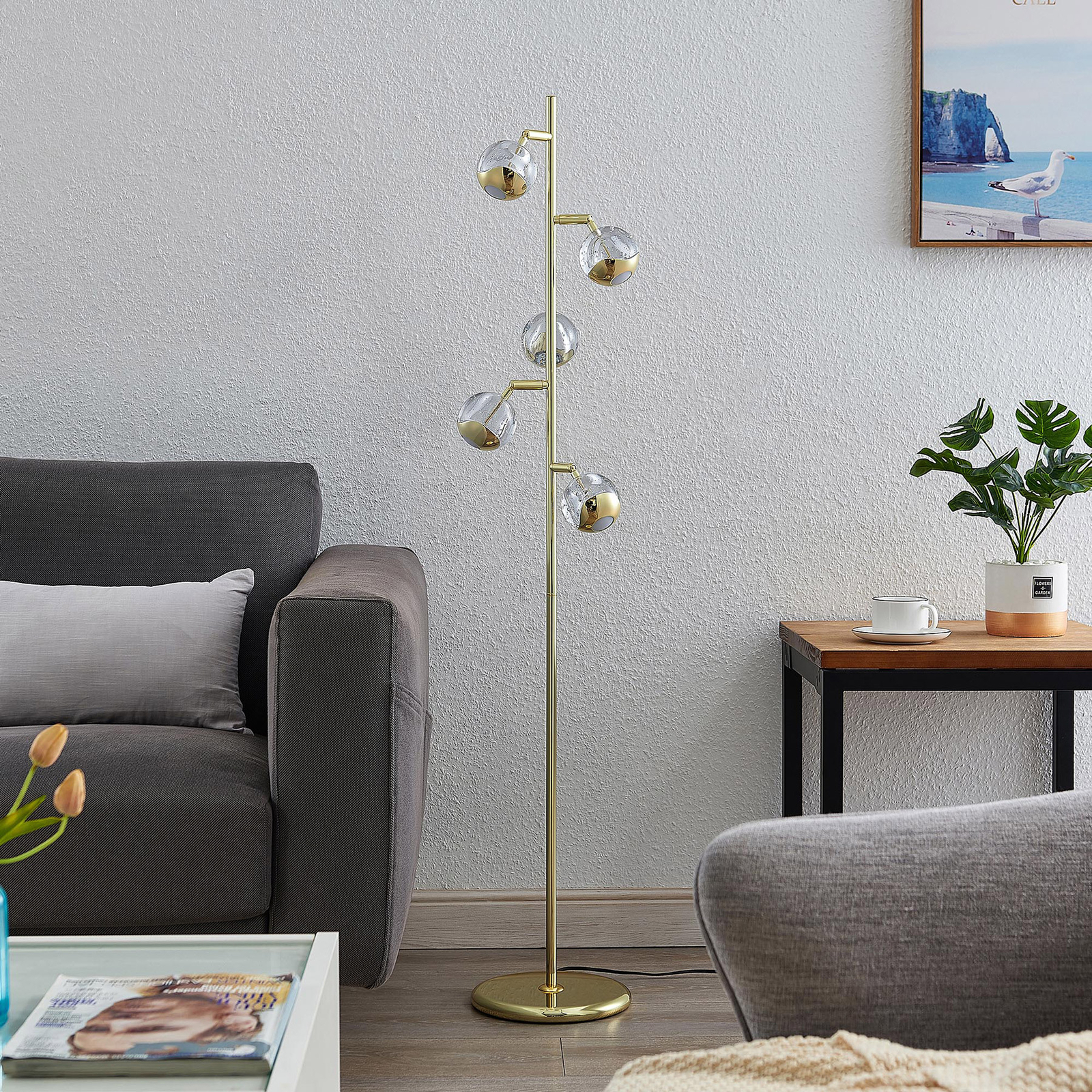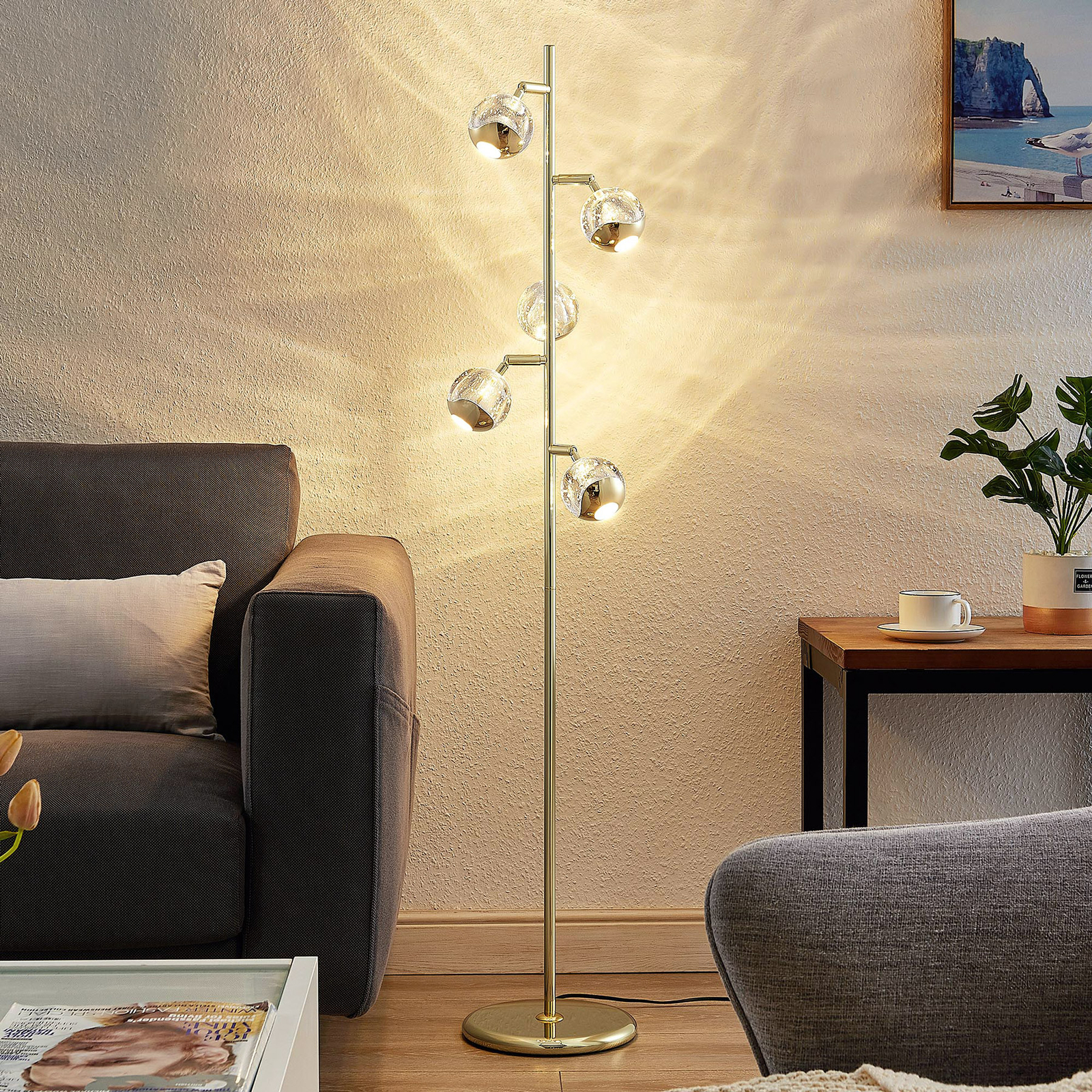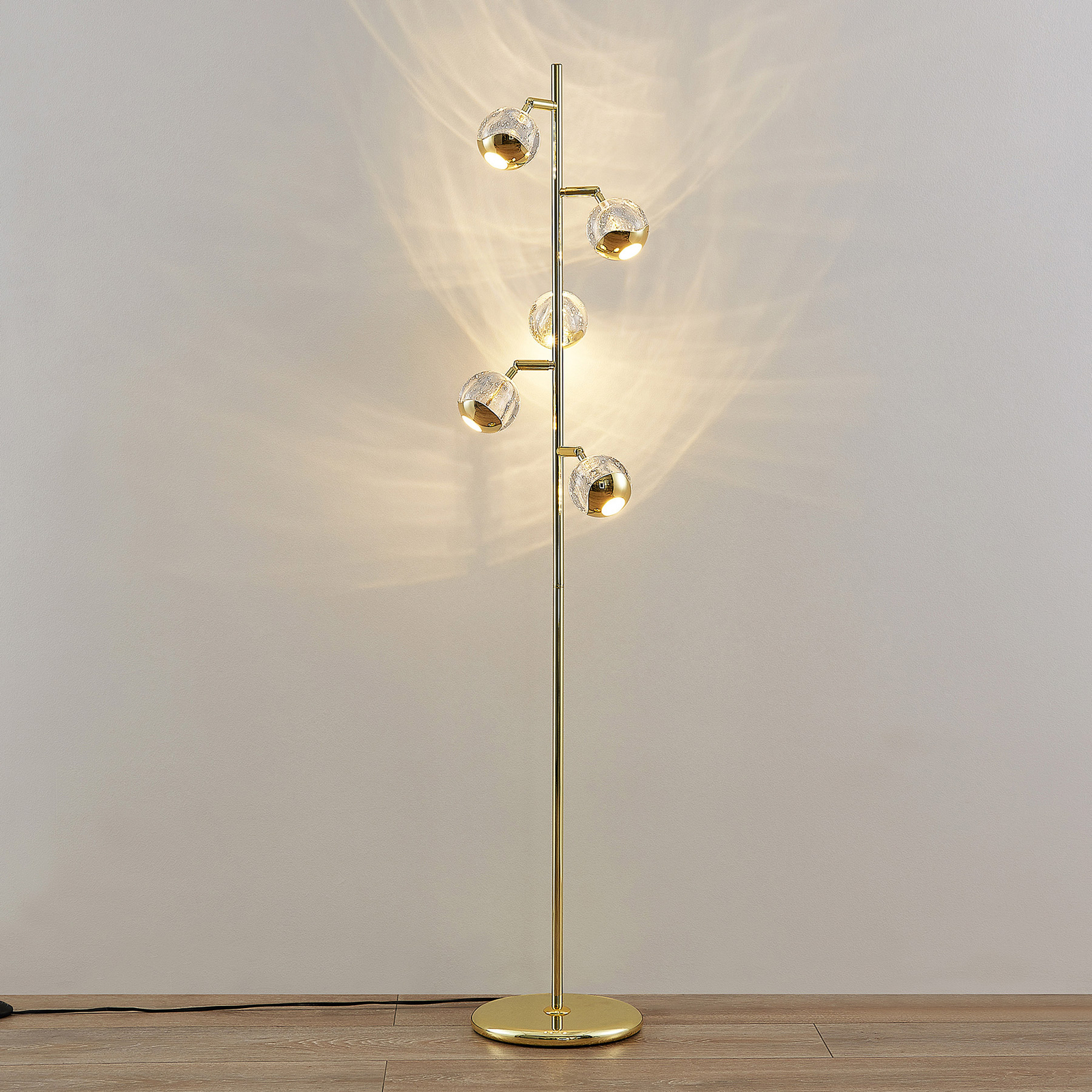 Viisilamppuinen LED-lattiavalaisin Kilio, jossa on kimaltelevat kuplalasivarjostimet ja kultainen kehys, himmennettävissä kytkimen kautta