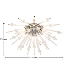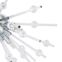 Kirai tarjoaa erittäin kauniin koostumuksen kahdesta materiaalista, jotka eivät voi olla erilaisempia: Tukeva rauta ja filigraanilasi luovat kiehtovan lampun, joka antaa jännittävän mutta harmonisen vaikutelman. Varjossa on yhteensä kuusi valopistettä, jotka voidaan varustaa G9-lampuilla. Kirai on todellinen katseenvangitsija, joka soveltuu hyvin sekä yksityiseen että kaupalliseen käyttöön.