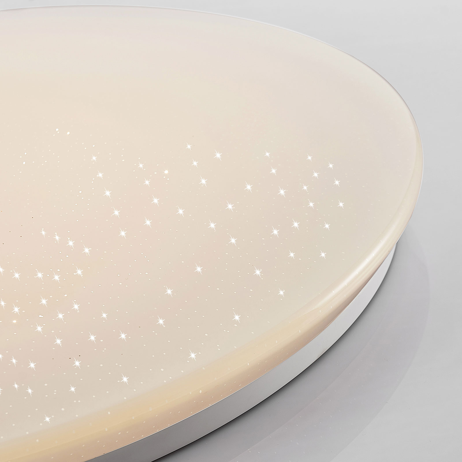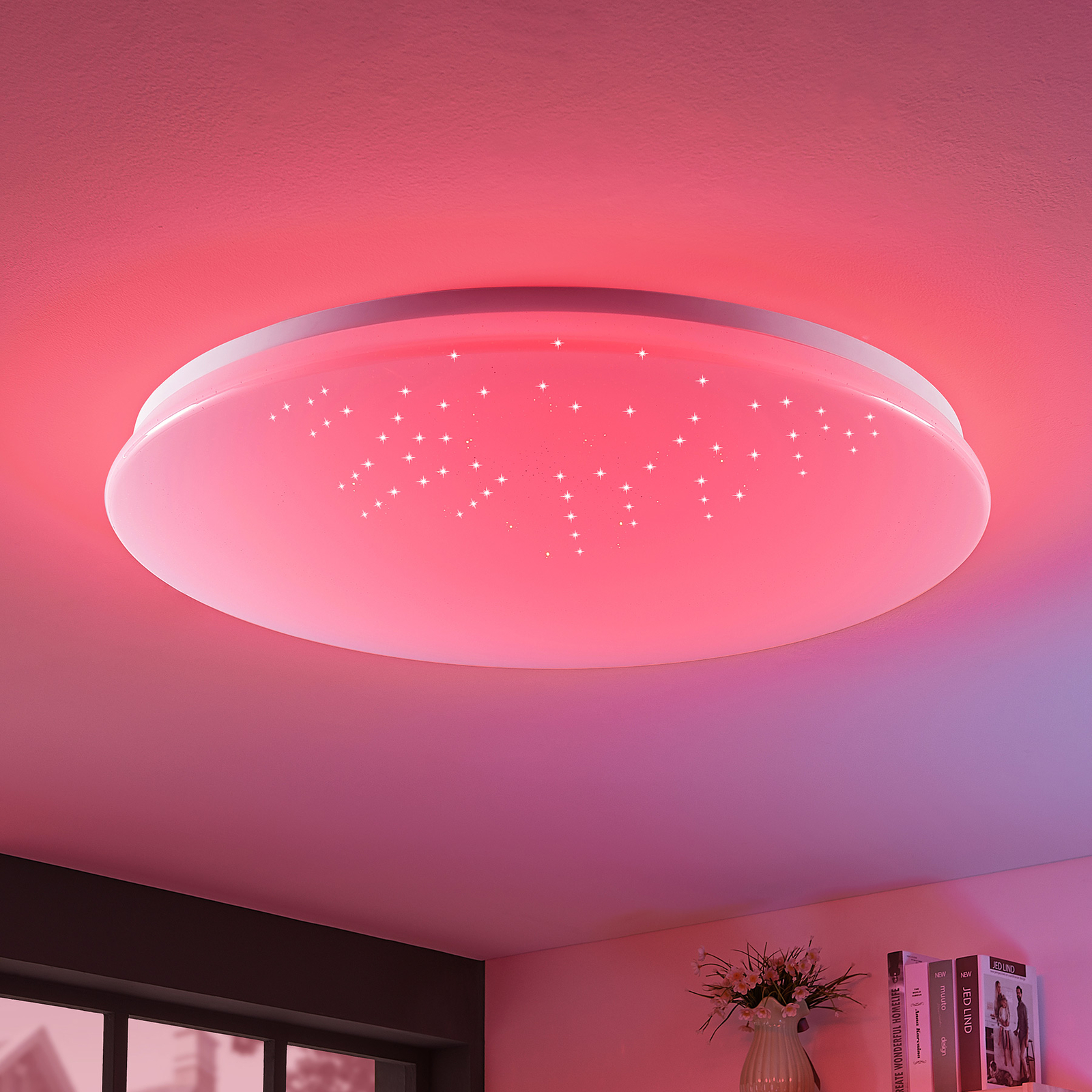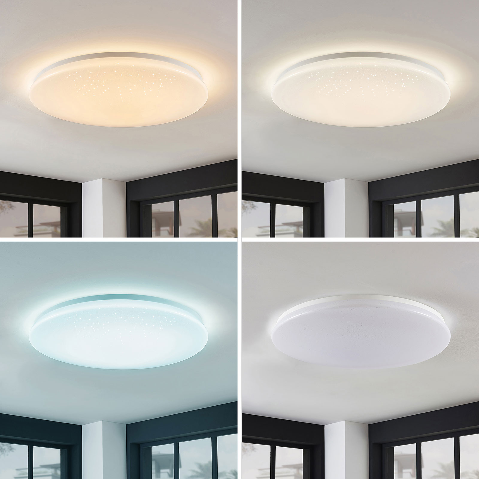 Lisäksi LED-kattovalaisin tuottaa huipputason LED-tekniikkaa, joka paitsi mahdollistaa värikkäät vaaleat värit, myös mahdollistaa valkoisen eri sävyjen vaihtelun lämpimästä valkoisesta yleiseen valkoiseen päivänvaloon. Tällä tavalla voit myös luoda valon, joka sopii ihanteellisesti työhön, ja vaihtoehtoisesti tarjota kodikas valaistus lämpimällä nuotilla illalla. LEDien valoteho on erittäin korkea, mutta se voidaan myös himmentää.