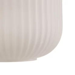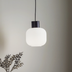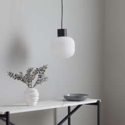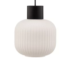 Lomeris on erittäin kaunis valonlähde koko asuintilaan, joka luo lämmintä ja kutsuvaa valoa ja vakuuttaa tyylikkäällä muotokielellä. Pyöreässä, sipulimaisessa lampunvarjostimessa on jalo ulkonäkö ja opaalilasin kaltainen yhtenäinen valkoinen pinta, jonka ansiosta valo pääsee tunkeutumaan lämpimästi ja tasaisesti ulospäin. Erityisesti sävyssä olevat urat viimeistelevät ulkonäköä ja yksilöllistävät kokonaisuutta. Mustat elementit muodostavat näkemisen arvoisen kontrastin lasivarjostimelle, ja ripustuskaapeli on myös musta, ja siinä on tekstiilivaippa, joka parantaa kokonaisuutta ja näyttää tyylikkäältä