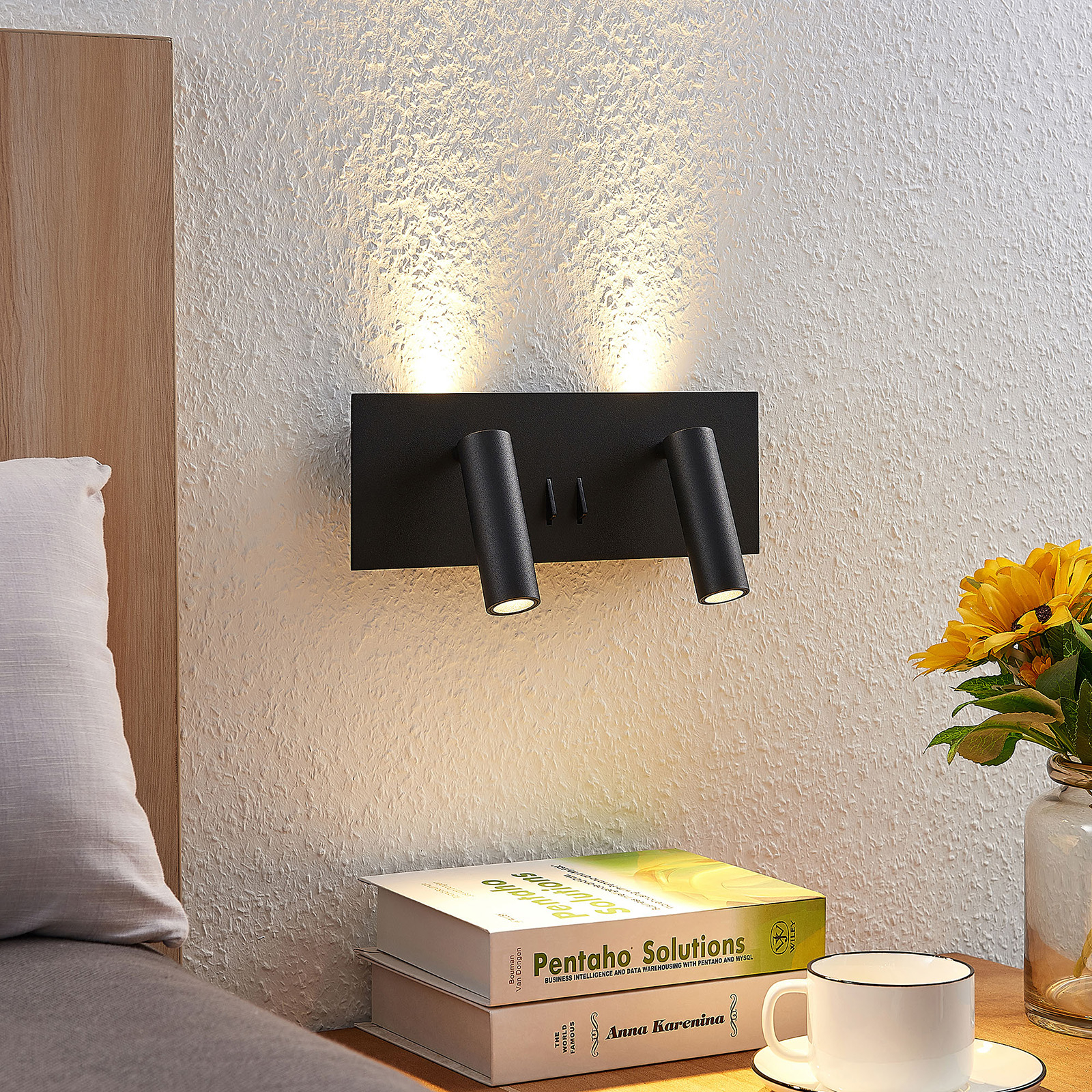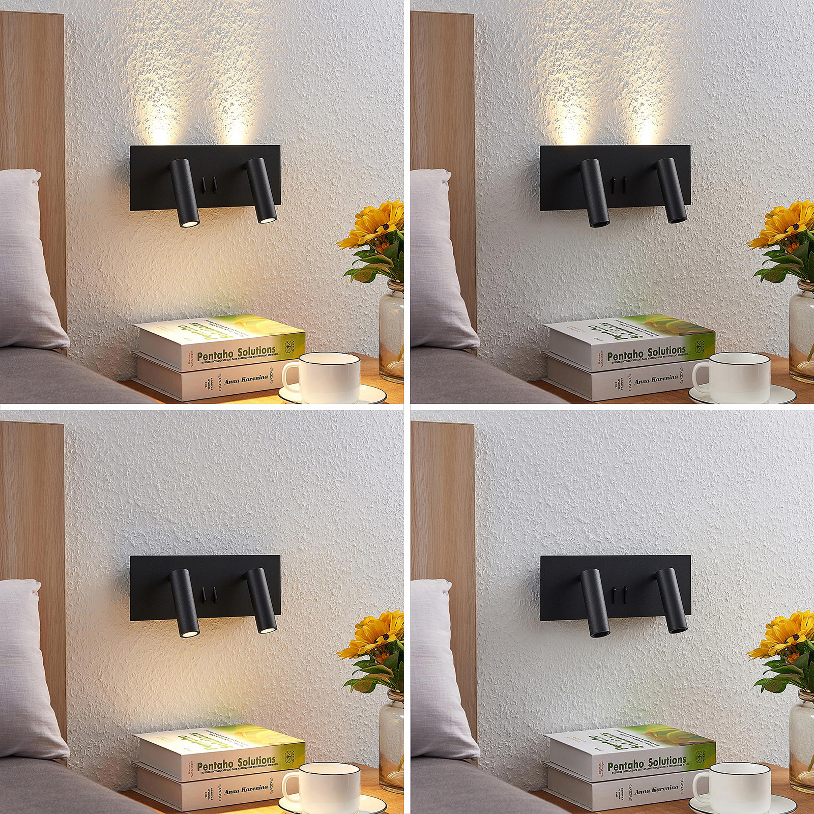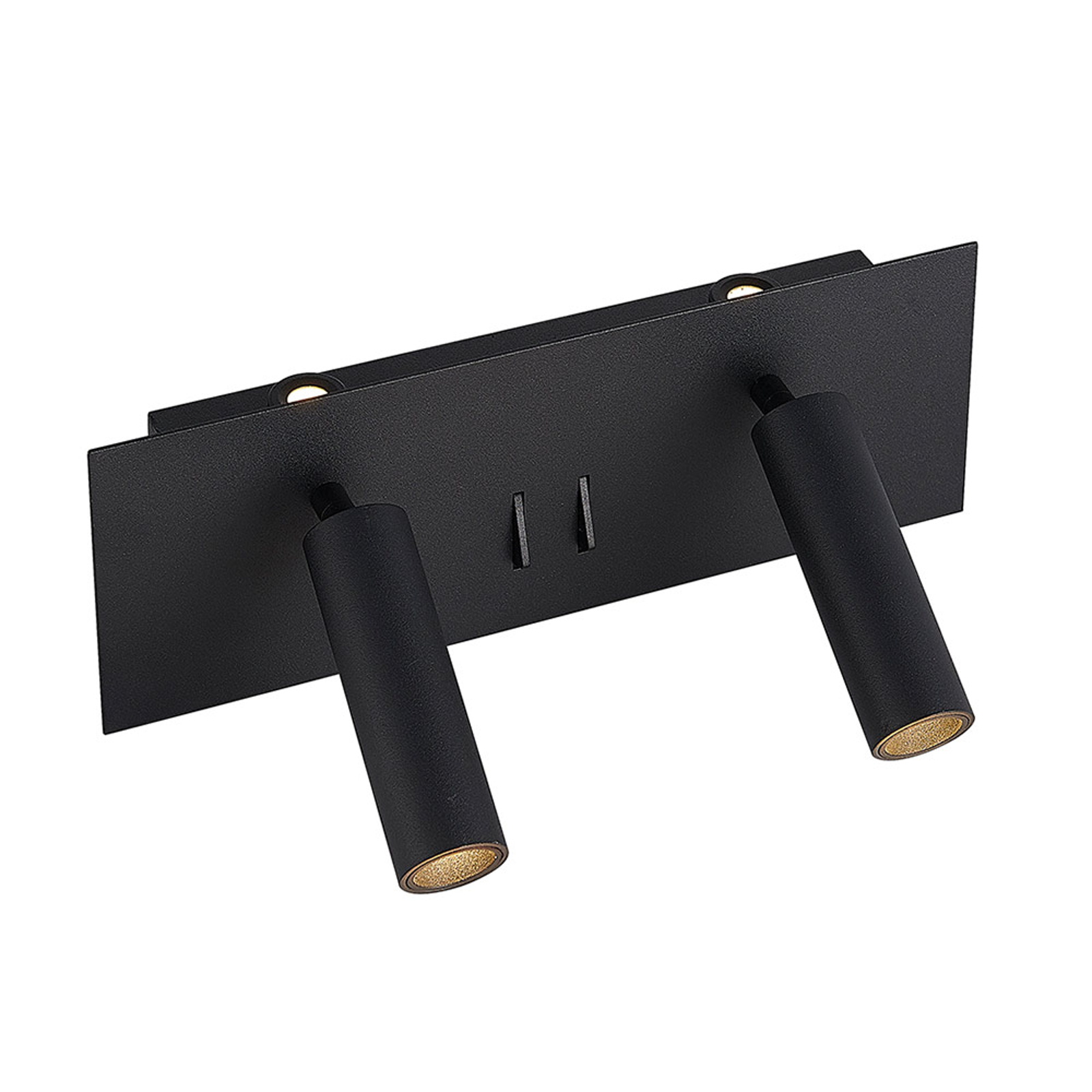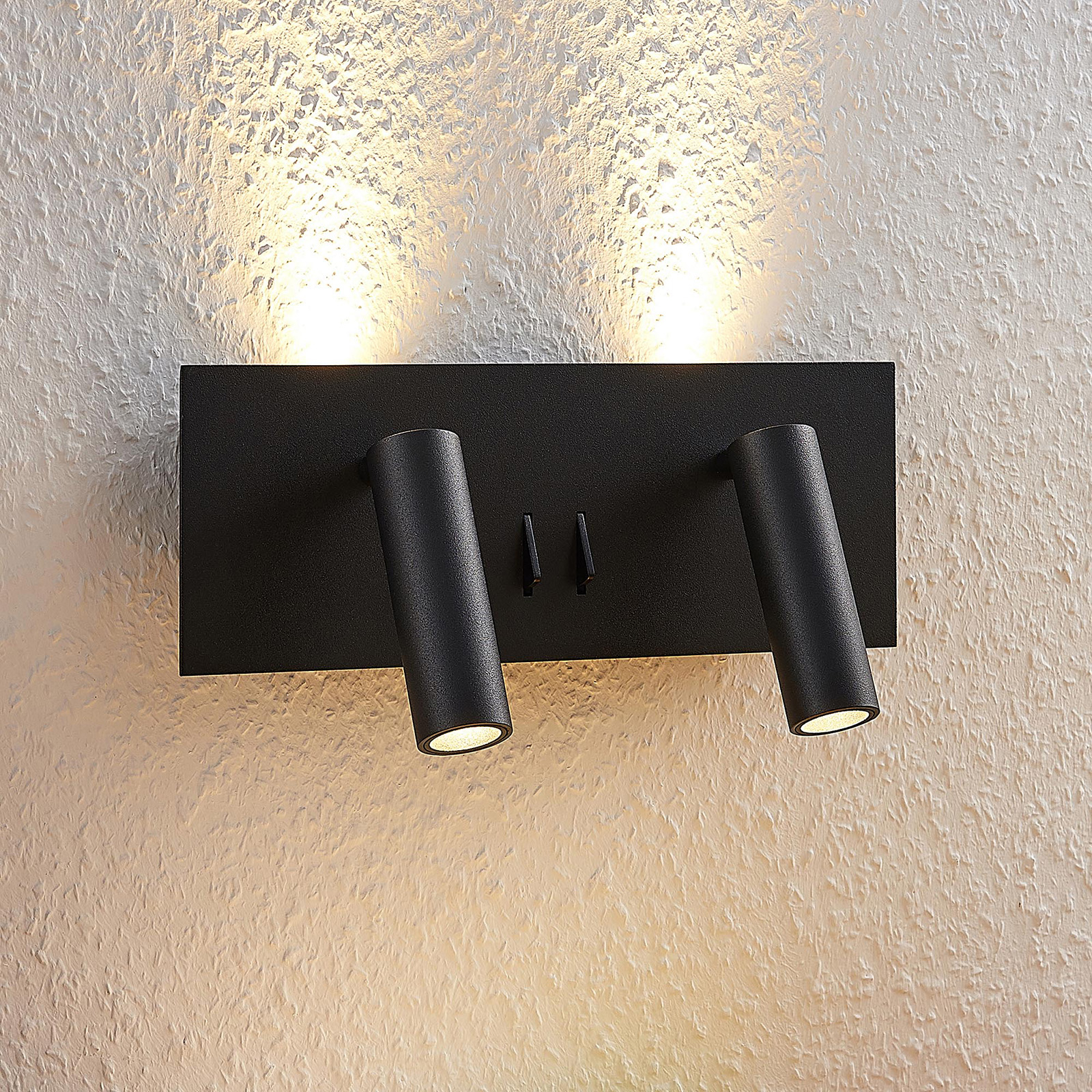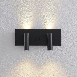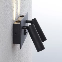 Magya-LED-seinävalaisimessa on kahden säädettävän kohdevalaisimen lisäksi myös kaksi taustavaloa. Ne sijaitsevat neliönmuotoisen levyn takana ja antavat seinälle kauniin valaistuksen. Kohdevalaisimet ja taustavalon voi kytkeä päälle erikseen kahden vipukytkimen ansiosta. Magya-LED-seinäkohdevalaisimessa on mattamusta pinta.