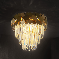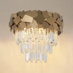 Tällä kauniilla kattovalaisin on erehtymätön ilme, joka parantaa välittömästi jokaista huonetta. Kotelo koostuu monista ruostumattomasta teräksestä valmistetuista elementeistä, jotka ovat neliön muotoisia ja jotka on saanut kultaisen pinnan.