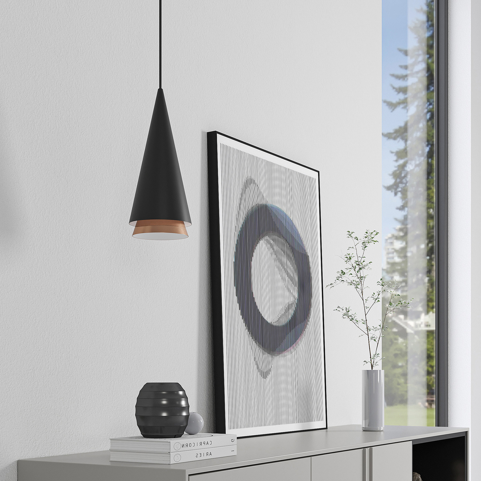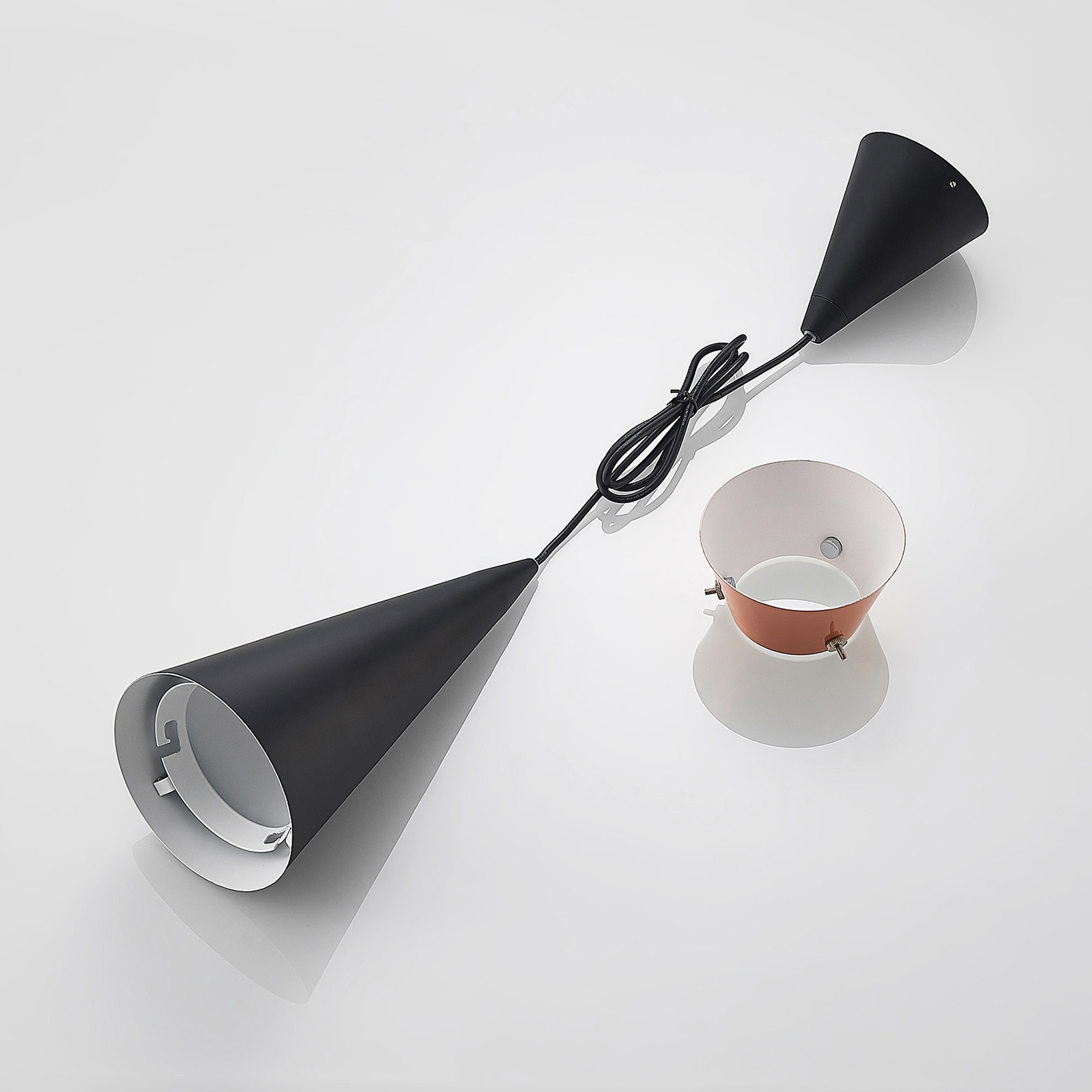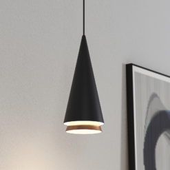 Naoh vakuuttaa muotoilullisella ulkoasullaan ja on riippuvalo, joka soveltuu erityisen hyvin nykyaikaisiin tiloihin. Yksiliekkiversiossa riippuvalaisin sopii hyvin tiskille tai pienelle pöydälle ja se voidaan asentaa peräkkäin useilla sellaisilla kopioilla. Metallinen varjostin on kartion muotoinen ja siinä on kaksikerroksinen rakenne, jossa sisempi varjostuselementti on kuparinväristä, kun taas ulompi, hallitseva osa on musta. Tuloksena on hienovarainen kaksisävyinen, joka näyttää erittäin näkemisen arvoiselta, ja tietysti kuparisävy myötävaikuttaa myös lämpimään valaistukseen. Kartiomaisen muodonsa ansiosta kattokiinnike peilaa jonkin verran varjostin , joten muotoilun geometria on vakuuttava kaikkialla.