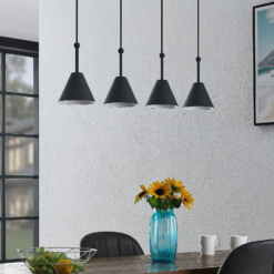 Phina-riippuvalaisin on ihanteellinen olohuoneen tai ruokasalin valaistukseen. Se on valmistettu raudasta ja on musta, kun taas sen varjostimet ovat valkoisia. Sen pitkänomainen muoto koostuu pitkänomaisesta kattokiinnike, johon on kiinnitetty neljä suspensiota, joista jokaisessa on varjostin . Jos varustat nämä E27-lampuilla, seinät luovat häikäisemättömän valaistuksen ja harmonisen tunnelman. Muodikkaan muotoilunsa ansiosta Phina-riippuvalaisin voidaan helposti integroida moniin erilaisiin sisustustyyleihin ja asettaa tyylikkäät aksentit sisustukseen.