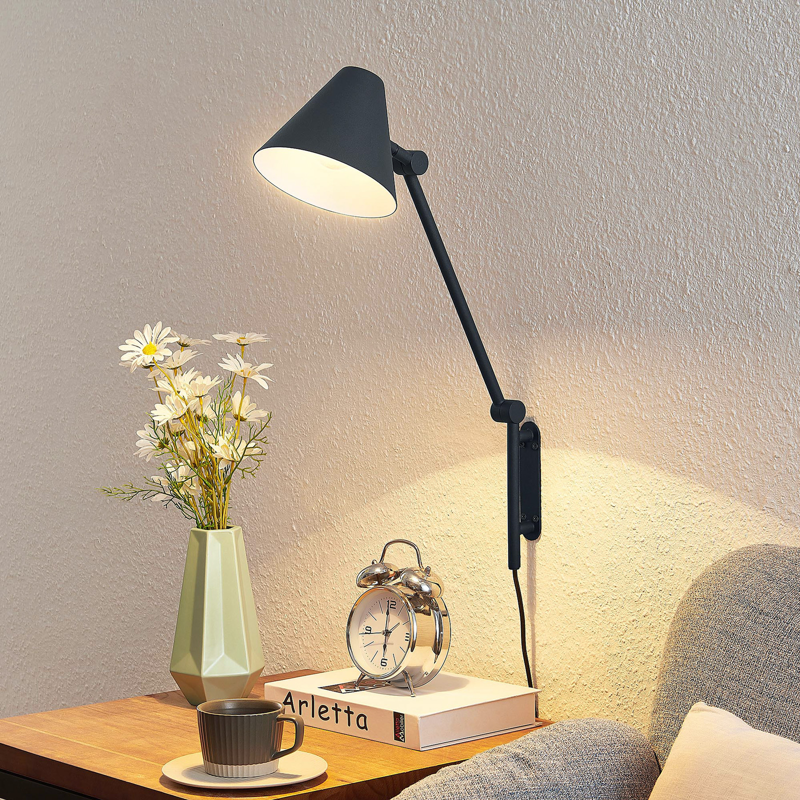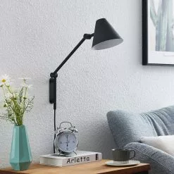 Phina on ohut seinävalaisin, joka sopii erityisesti olohuoneen korostusvalaisimeksi. Siro, pitkä varsi nousee seinäkannattimesta, jossa on kaksi liikuteltavaa niveltä ja joka päättyy huomaamattomaan lampunvarjostimeen. Runko ja varjostin ovat molemmat mustaa terästä, ja varjostimen sisäpuoli on vuorattu harmonisella valkoisella. Tämä viehättävä värikontrasti antaa valaisimelle sen tietynlaisen vivahteen ja viimeistelee sen muotoilun. Phina voidaan varustaa E27-lampuilla, jotka tuottavat tarvittavan valon. Valaisimen melko huomaamaton ulkonäkö sulautuu vaivattomasti muuhun kalustukseen ja sopii hyvin moderniin sisustustyyliin. Tarvittaessa Phina voidaan yhdistää muiden sarjan valaisimien kanssa yhtenäisen kokonaiskuvan luomiseksi.