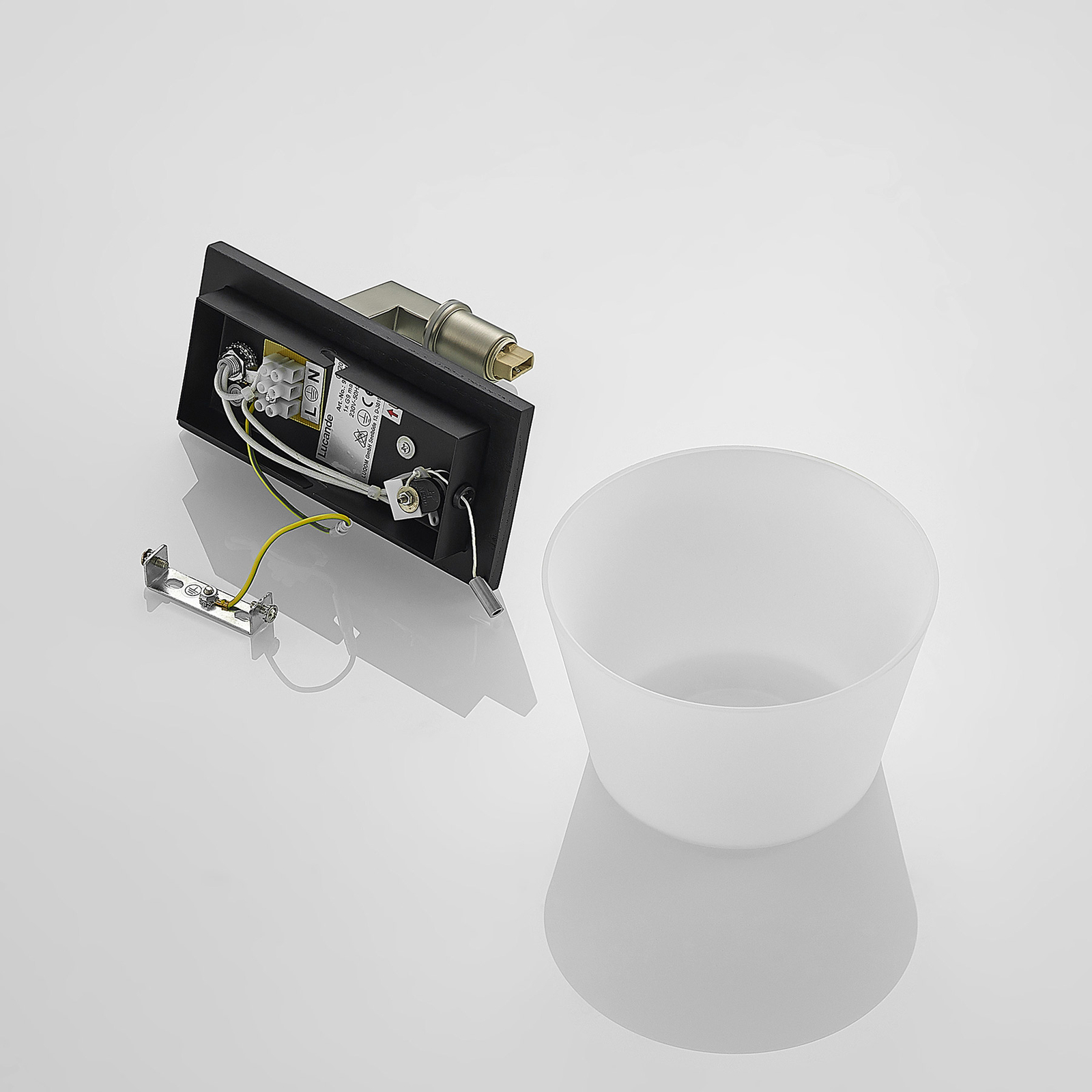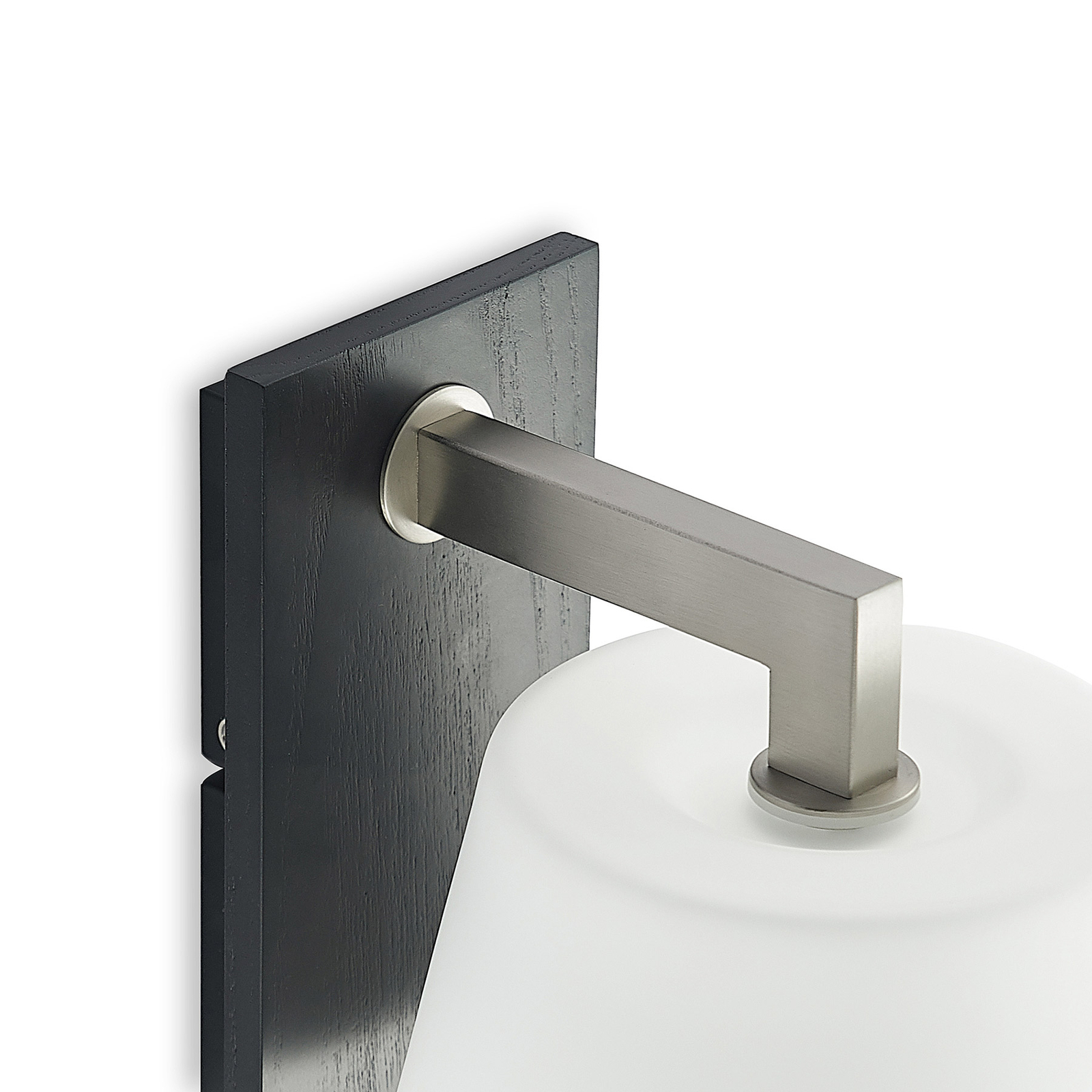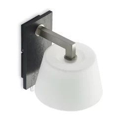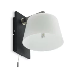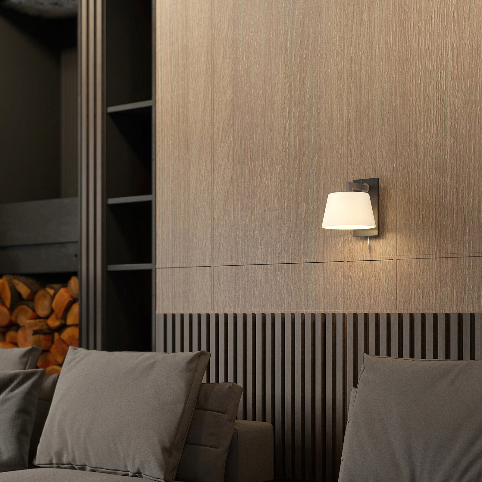 Tässä seinävalaisimessa on valkoisesta lasista valmistettu varjostin , puinen seinäkiinnike mustalla ja liitoselementti kromilla, jotta se vastaa klassista kolmikomponenttista ulkoasua ja on optisesti yksilöllinen rikastus. valaistus jakaa valon pehmeästi ja tasaisesti, ja vetokytkin varmistaa nopean käytön paikan päällä, jolloin Rhea voidaan asentaa seinävalaisimeksi sängyn tai sohvan ulottuville.