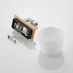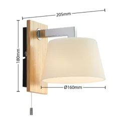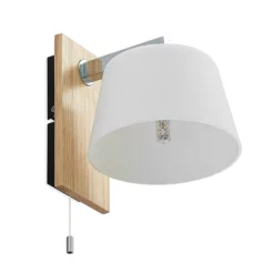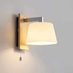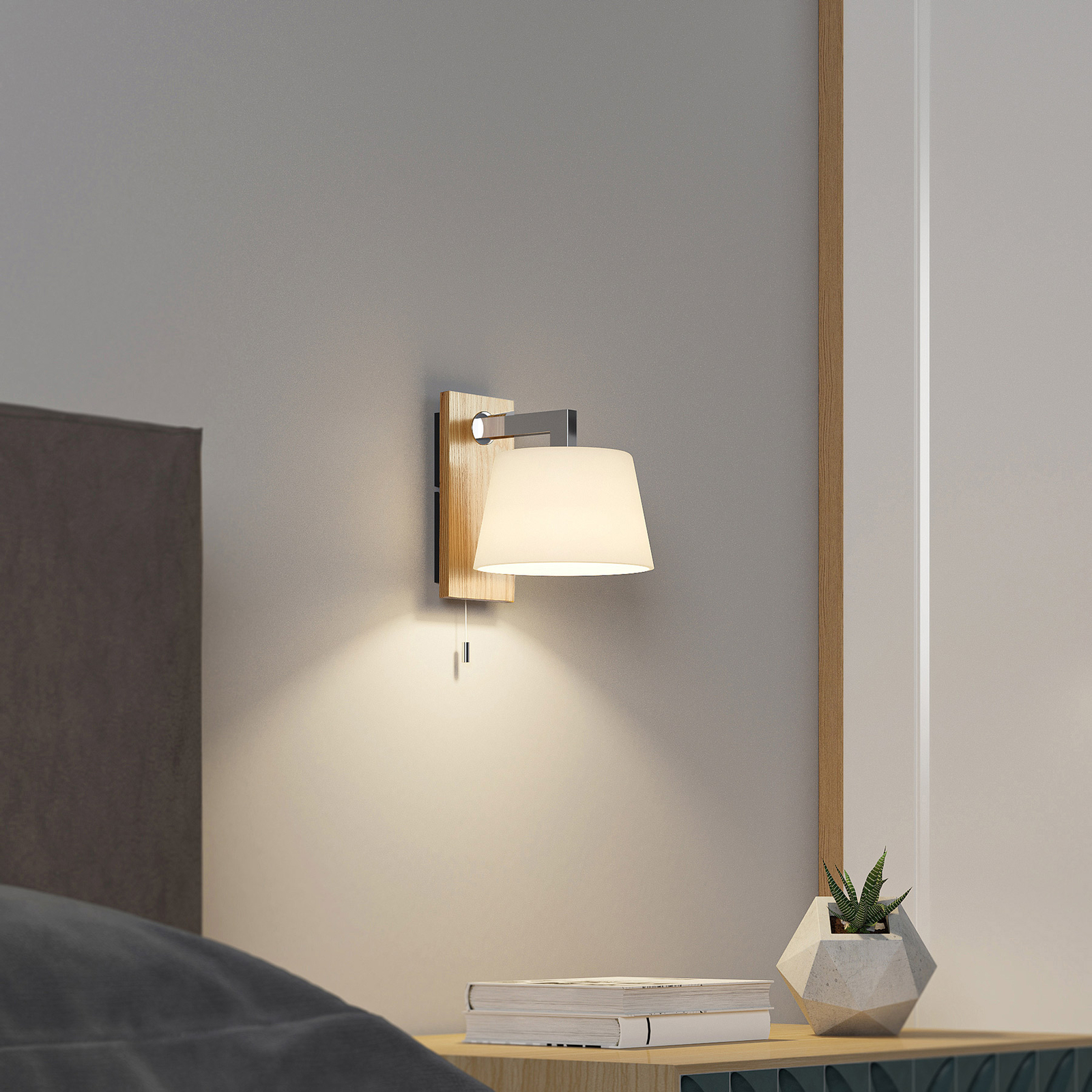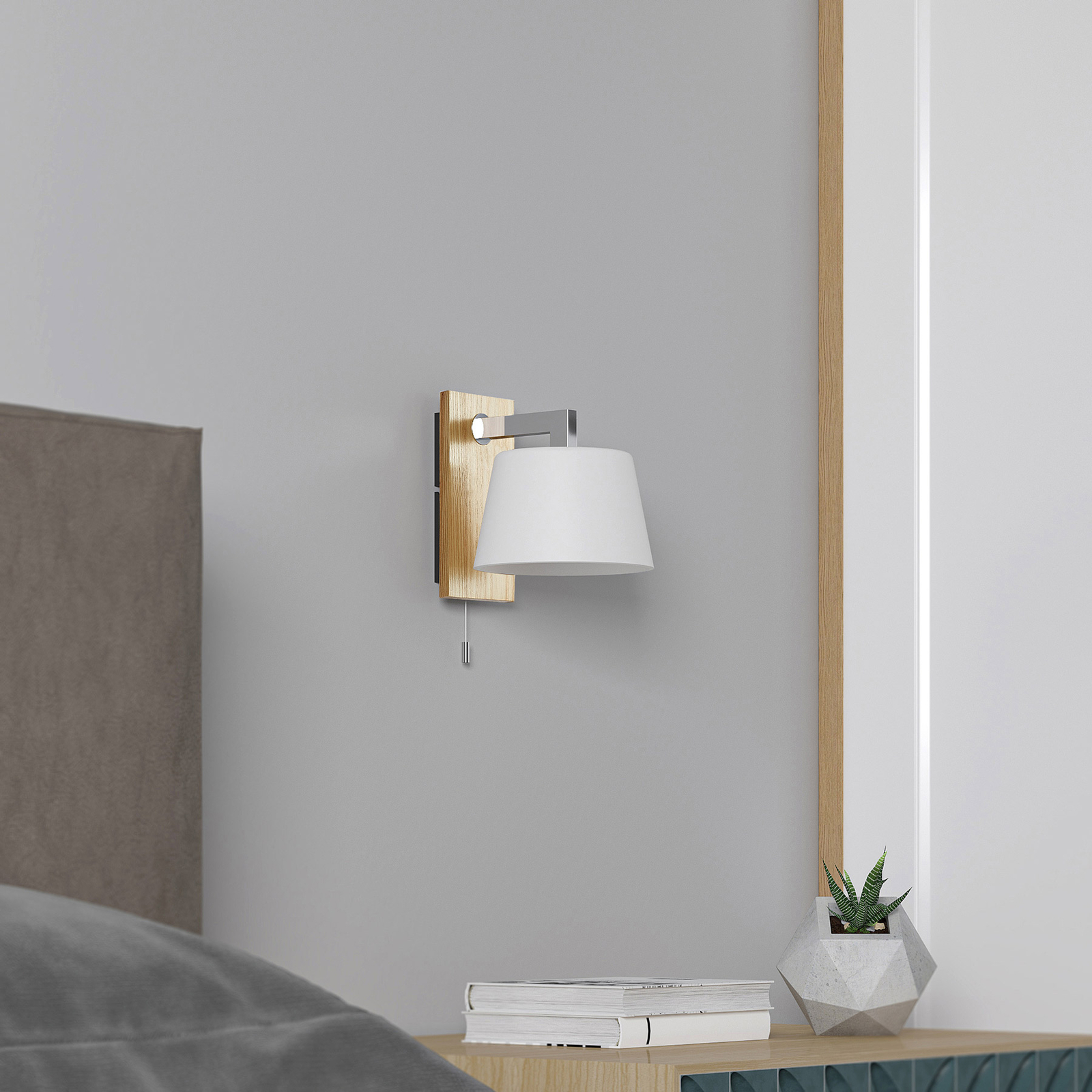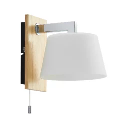 Tässä kolme komponenttia yhdistyvät luodakseen kauniin ja vakuuttavan ilmeen, koska seinävalaisimessa on pyöreä lasivarjostin ja vaaleasta puusta valmistettu seinäteline, jotka on liitetty toisiinsa kromatulla metallielementillä. valaistus on lämmin, pehmeä ja kodikas – juuri sitä mitä etsit makuuhuoneesta tai olohuoneesta, kun haluat nojata taaksepäin työn jälkeen. Vetokytkin täydentää valoa ja helpottaa virran kytkemistä päälle ja pois päältä.