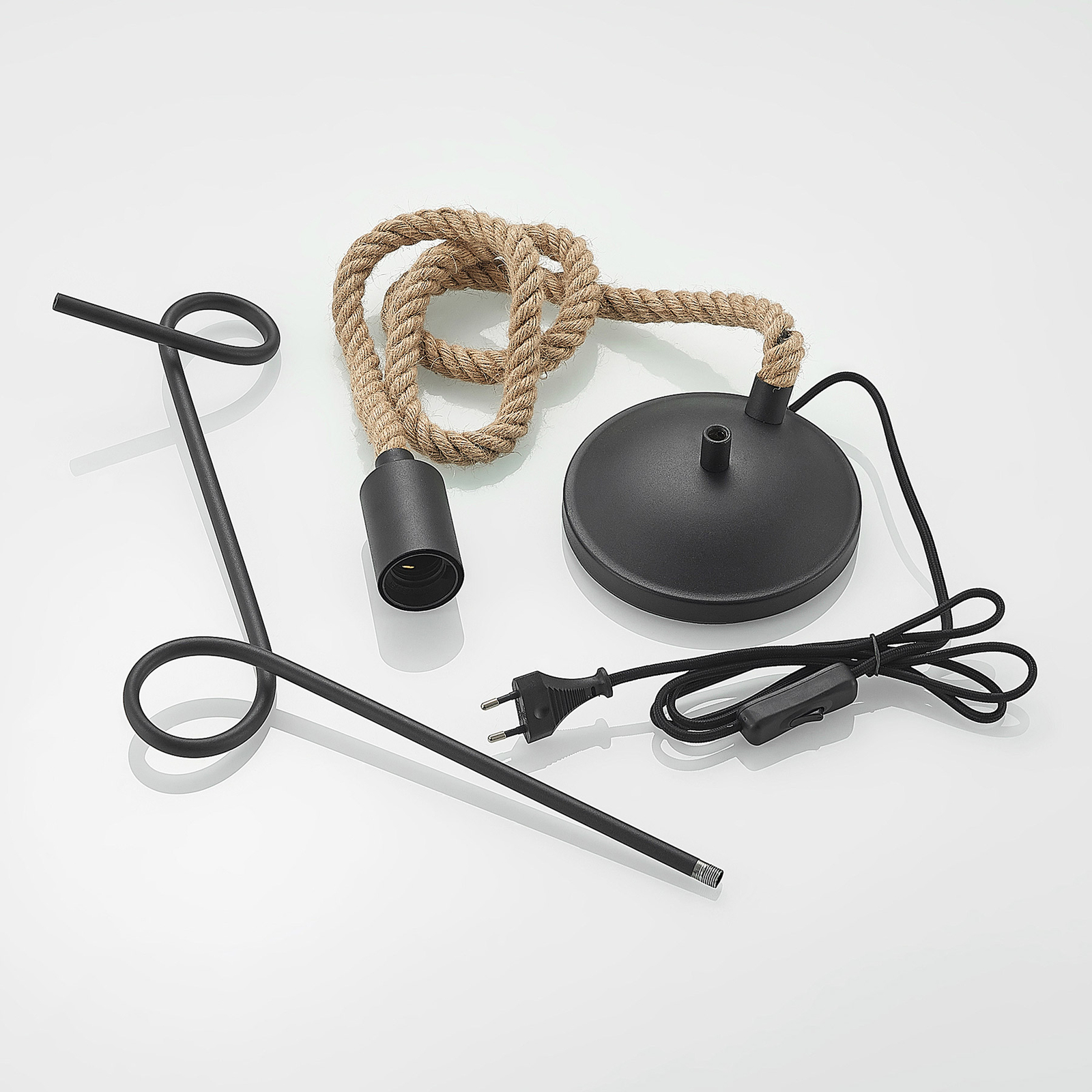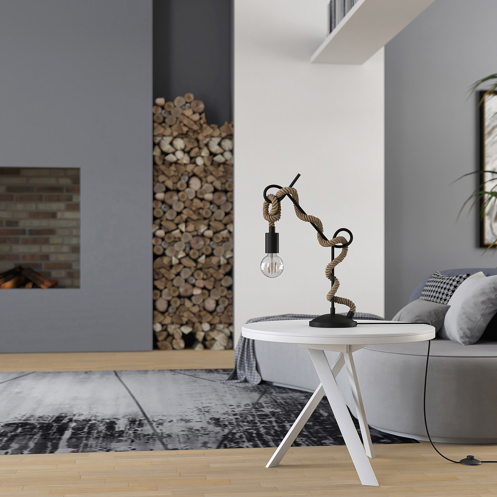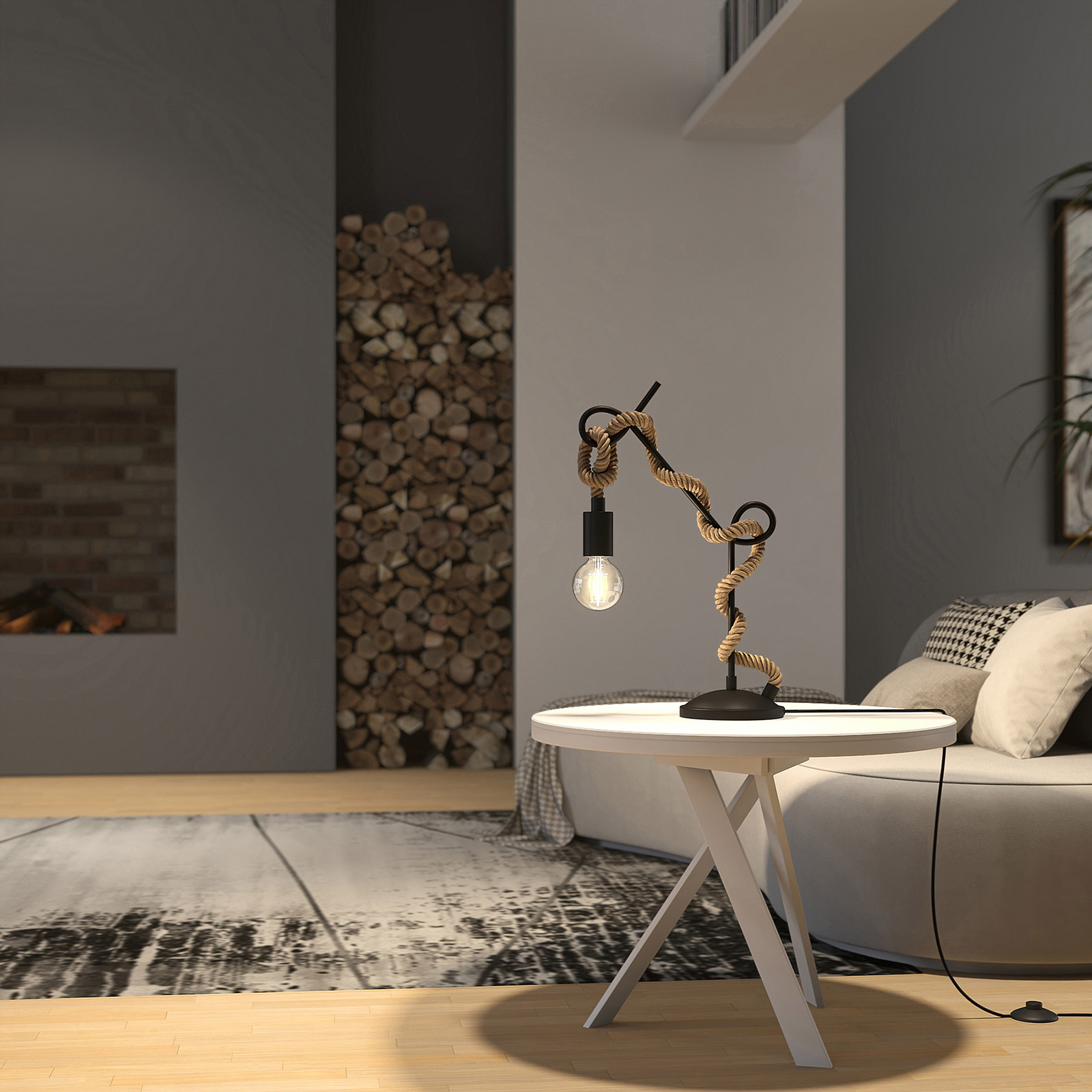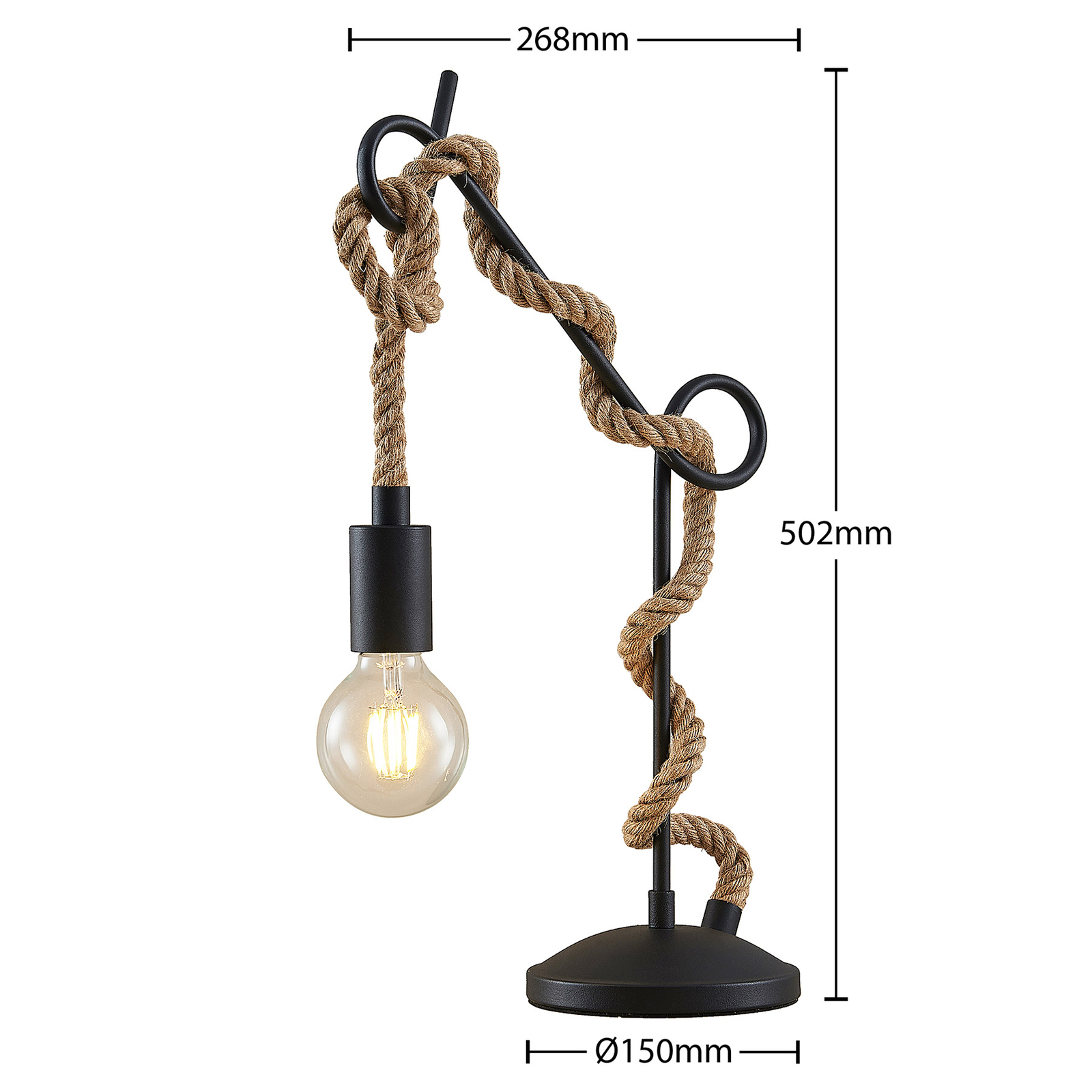 Tämä mielenkiintoinen pöytälamppu herättää kaikkien huomion epätavallisella muotoilullaan. Taiteellisesti kaareva tanko nousee pyöreästä alustasta, jonka ympärillä köyden muotoiset kaapelit kiertyvät. Köyden päähän on kiinnitetty musta pidin , joka on värikoordinoitu metallirungon kanssa.