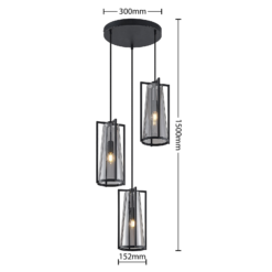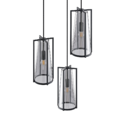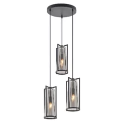 Kolmilamppuinen Rufina-riippuvalaisin savulasista, jossa on eksklusiivinen rondellin muotoiluRufinassa kolme lampunvarjostinta on järjestetty rondellin muotoon ja ne roikkuvat alas pyöreästä katoksesta eri korkeuksilla. Ne koostuvat mustasta metallikehyksestä ja savulasikartiosta, jota kehys ympäröi. Savulasi luo valoon pehmeän himmennyksen, joka vaikuttaa lasin kanssa kodikkaalta. Tumma varjostin antaa riippuvalaisimelle jalon ja ylellisen ilmeen. Käytettävät valonlähteet näkyvät selvästi sekä päälle- että pois päältä kytkettynä, ja niiden on siksi sovitettava yleisilmeeseen, kuten esimerkiksi hehkulamppujen tapauksessa. Rufina sopii rakennemuotonsa ja kolmen yksilöllisesti muotoillun lampunvarjostimensa ansiosta hyvin tiskin tai ruokapöydän yläpuolelle ja koristaa koristeellisesti asuintiloja.