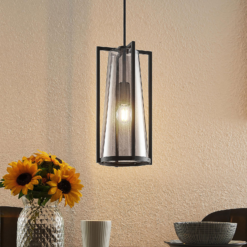 Rufina-riippuvalaisin, jossa on savulasivarjo, eksklusiivinen muotoiluRufina-riippuvalaisin sopii hyvin olohuoneen ja ruokailutilan pöytien valaistukseen. Siinä on savunharmaasta lasista valmistettu varjostin, jota ympäröi musta teräskehys, joka kapenee ylöspäin. Muotoilu on eksklusiivinen, ja sille on ominaista kontrasti, joka on näkemisen arvoinen. Savulasi luo mielenkiintoisen, kodikkaan vaikutelman ja himmentää hieman valoa. Kun valo on kytketty päälle, valonlähteet ovat kuitenkin selvästi näkyvissä, ja ne on siksi valittava huolellisesti, ja niiden on mieluiten oltava klassisen hehkulampun näköisiä, kuten hehkulamppujenkin kohdalla.