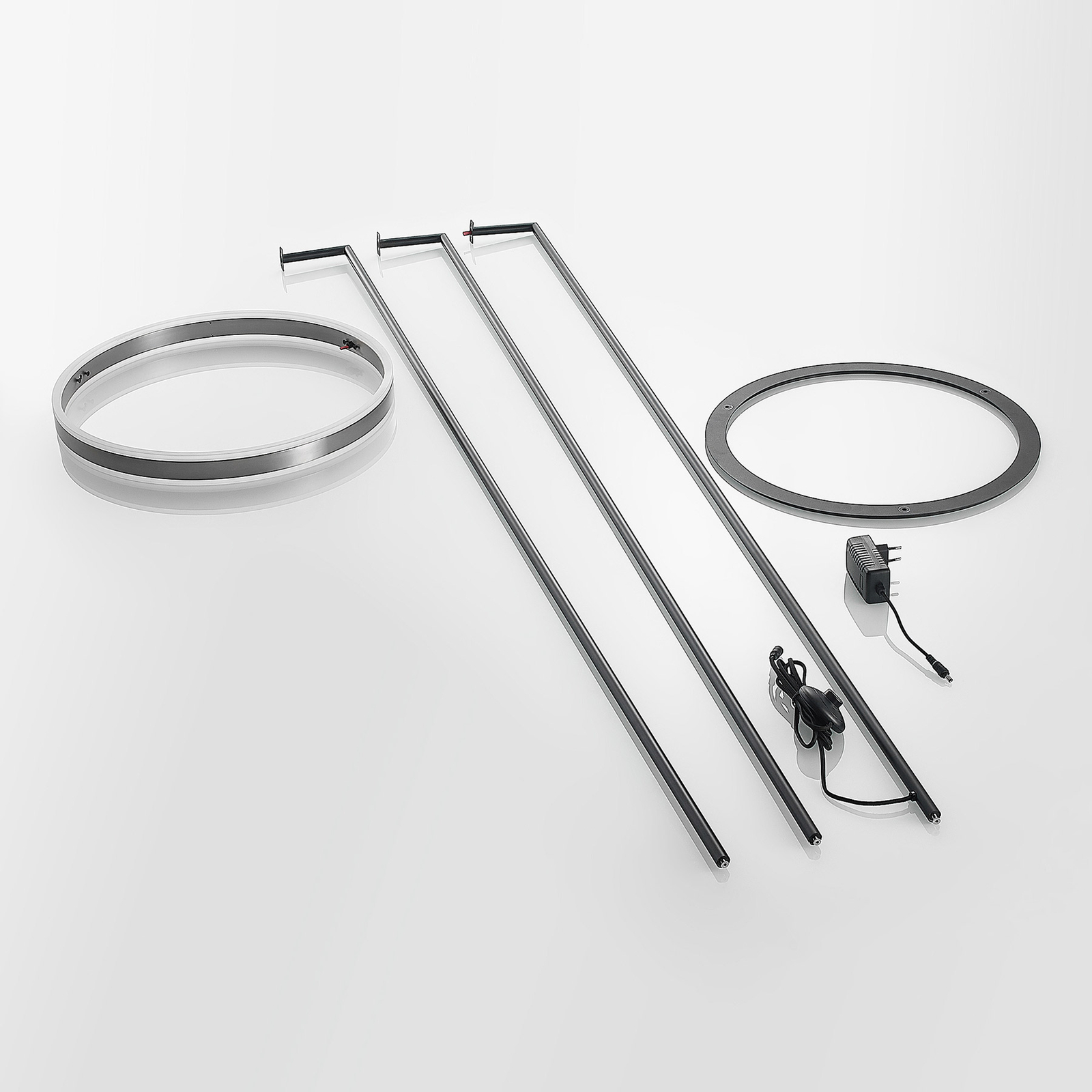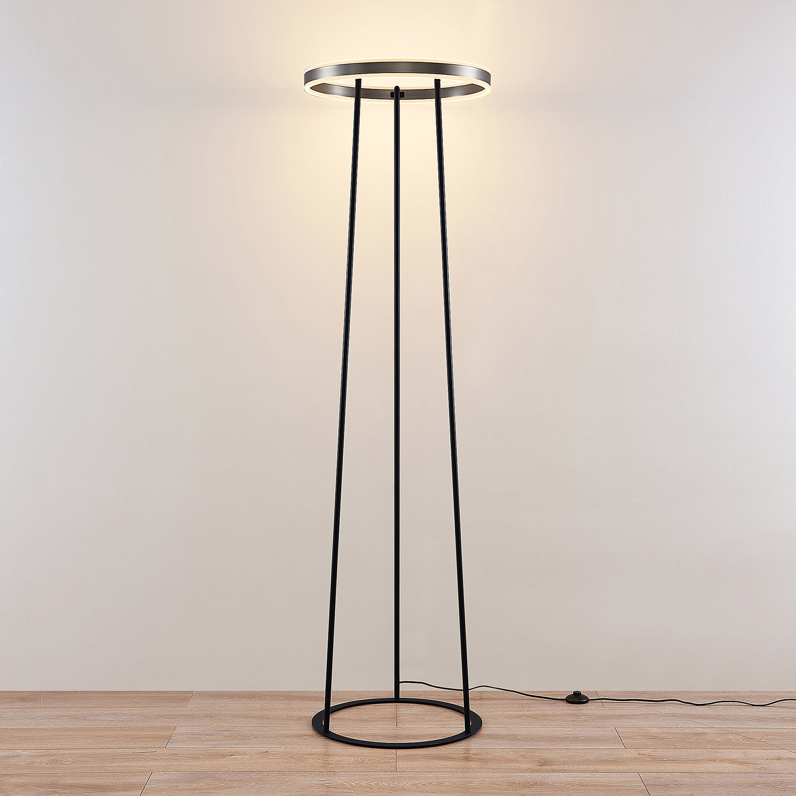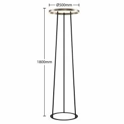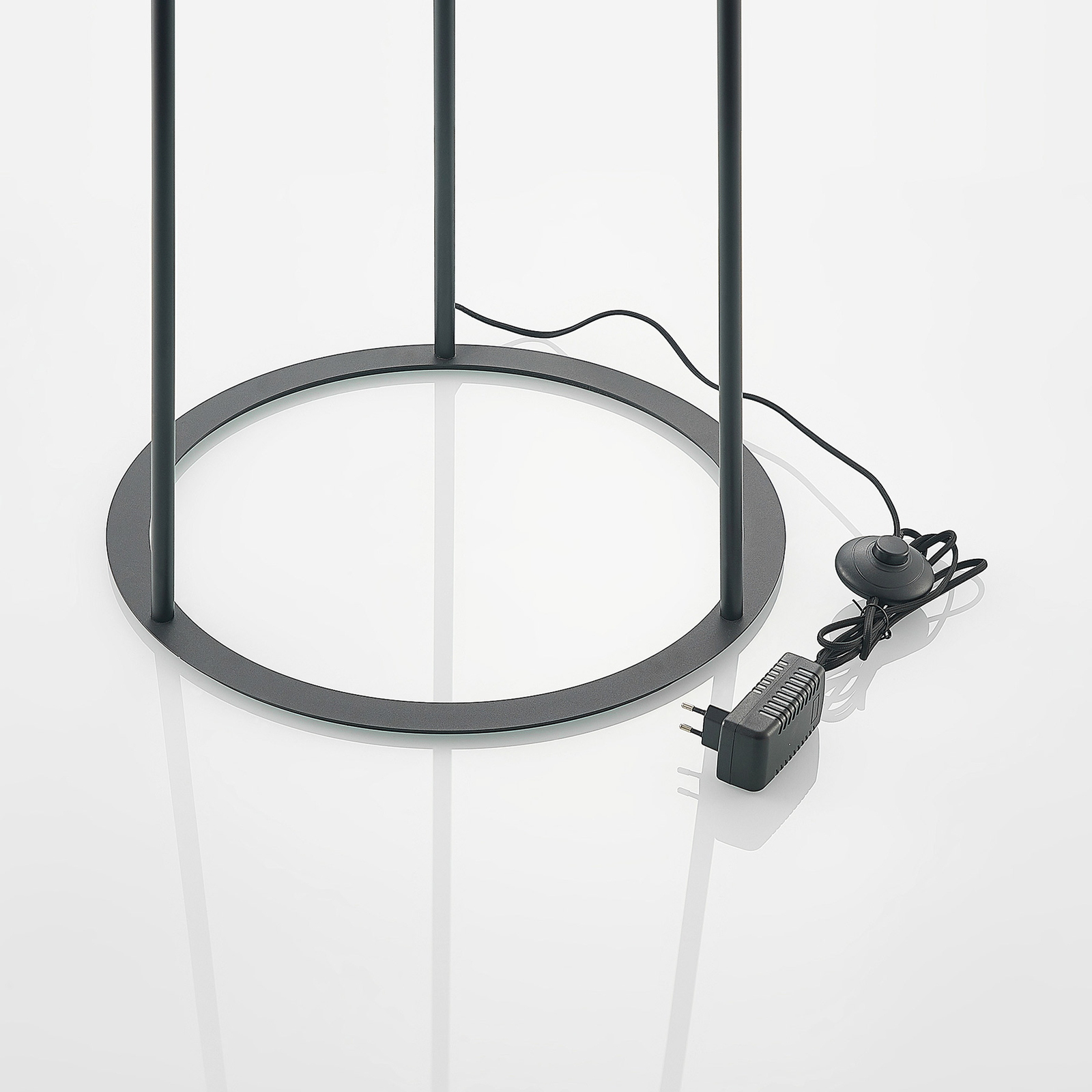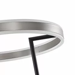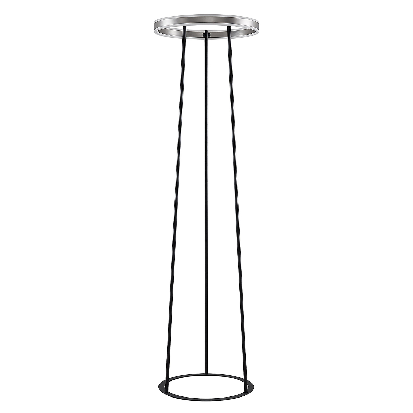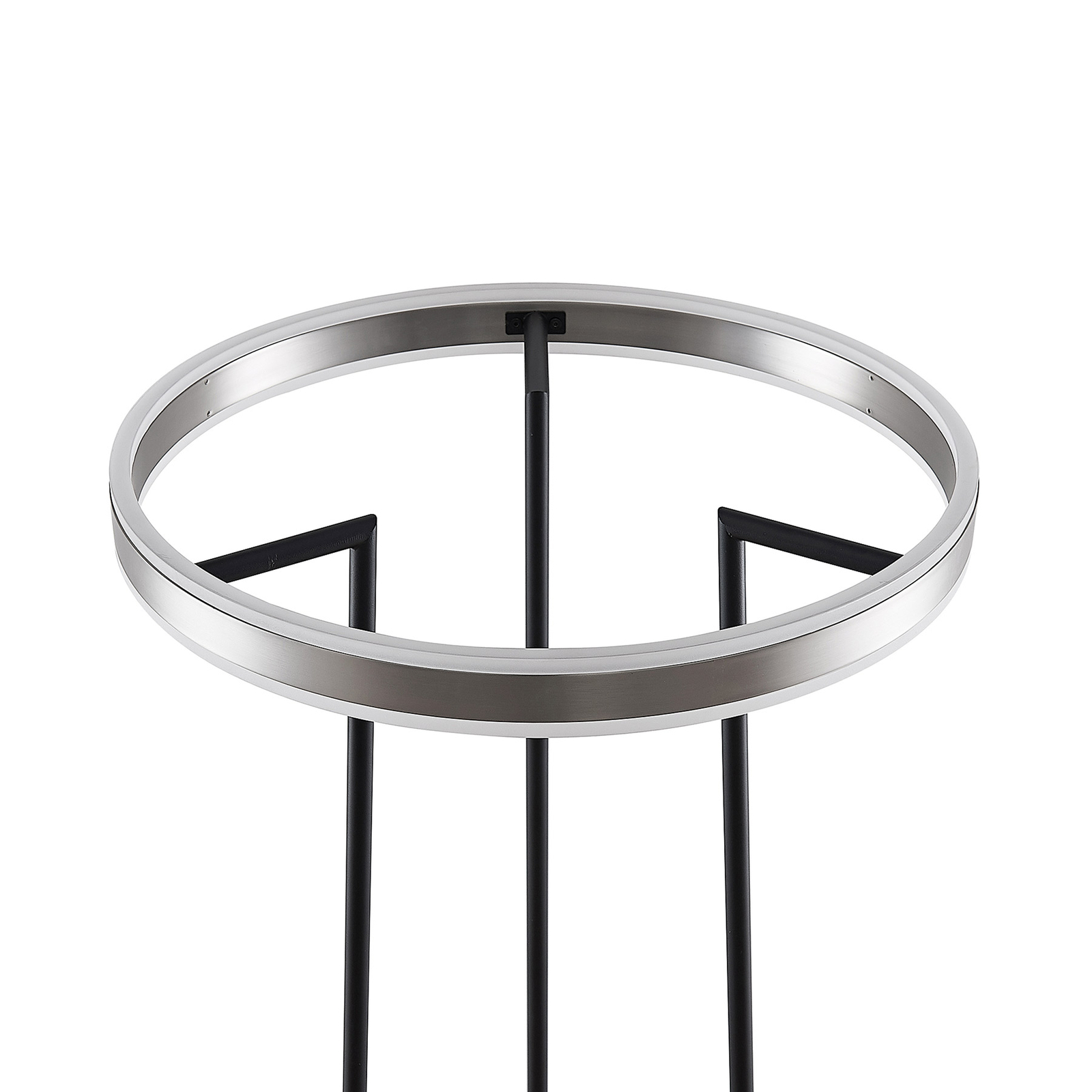 Pyöreä muotoilullinen LED-lattiavalaisin Seppe, jossa on matta nikkeliä oleva rengas, kolmiportainen himmennettävä kytkimen kautta