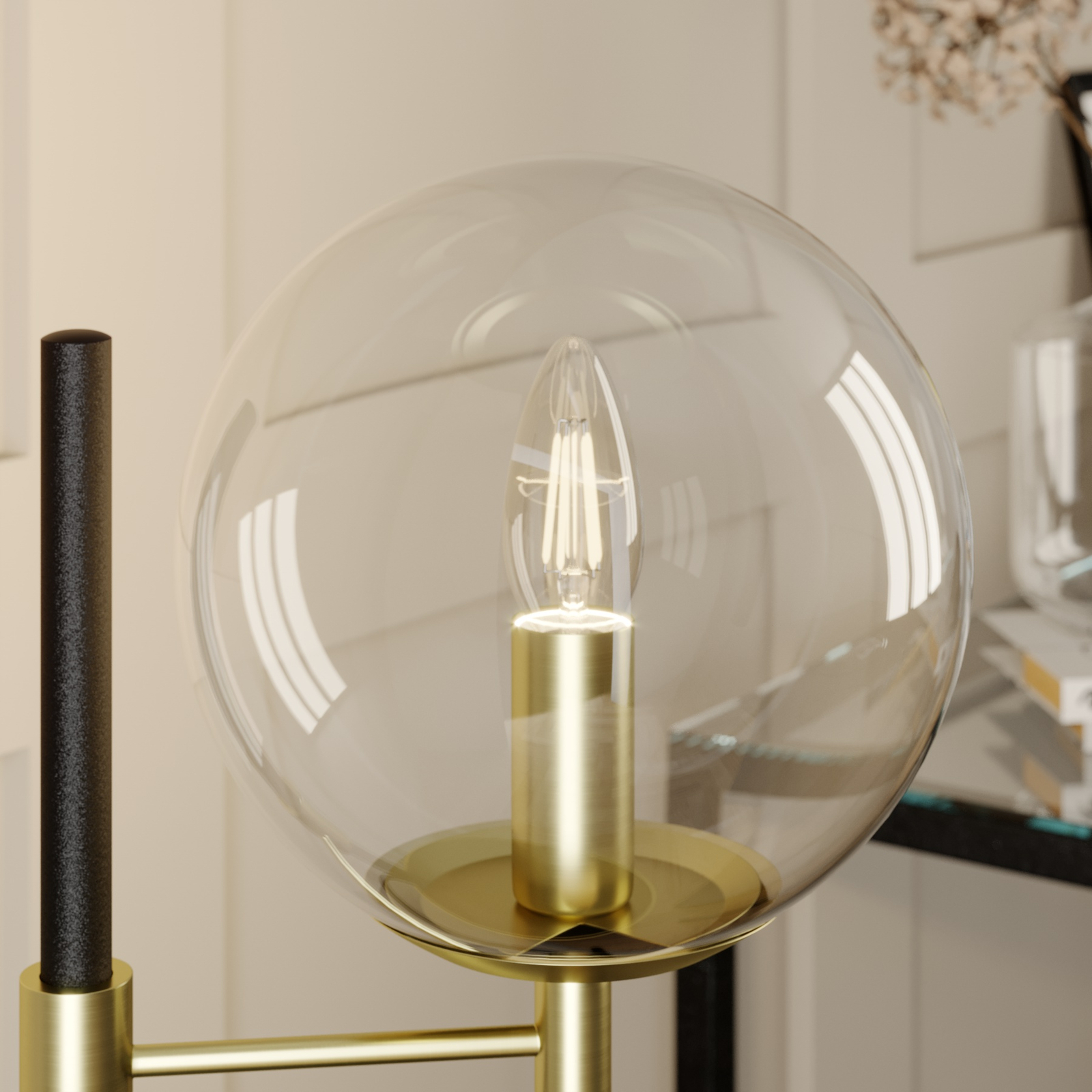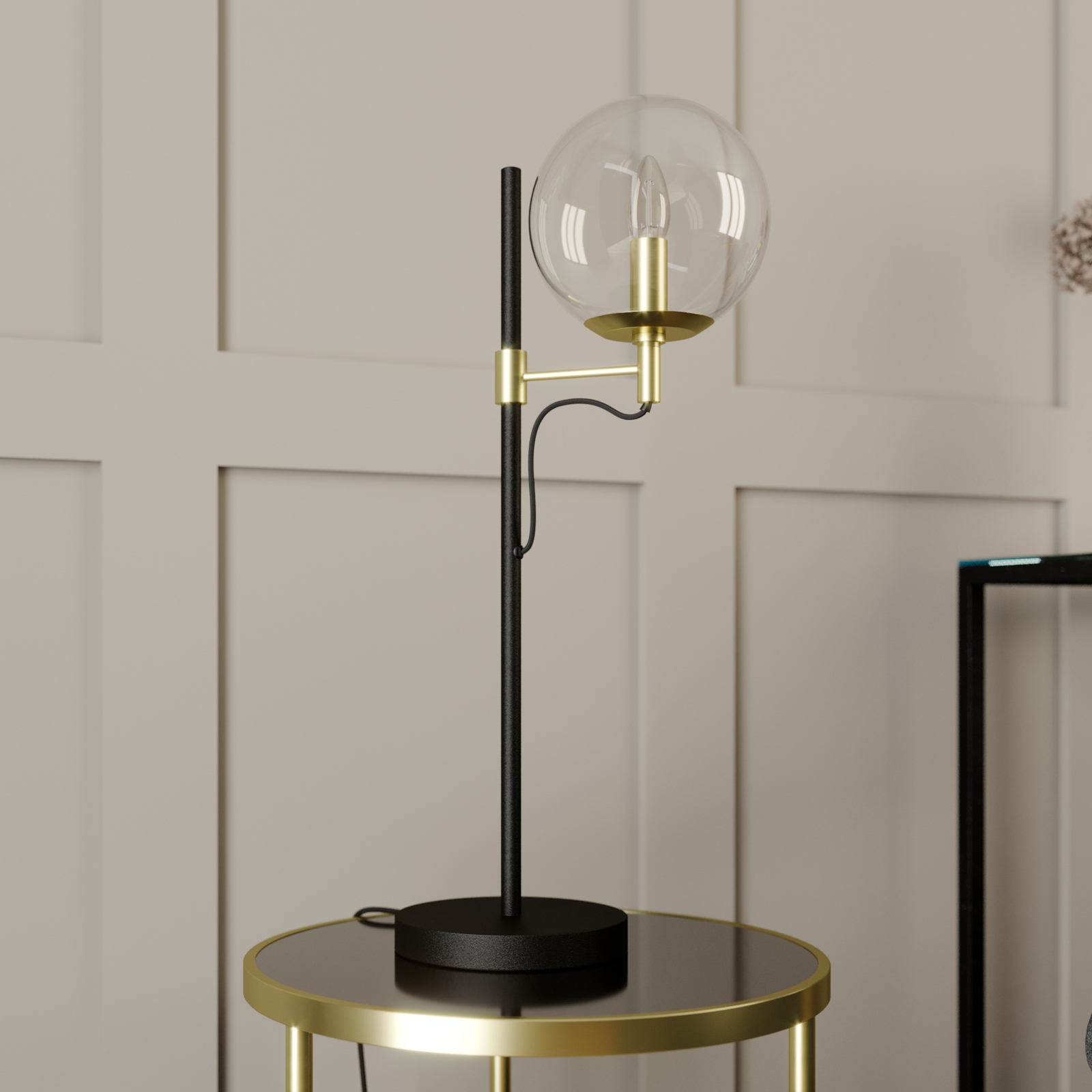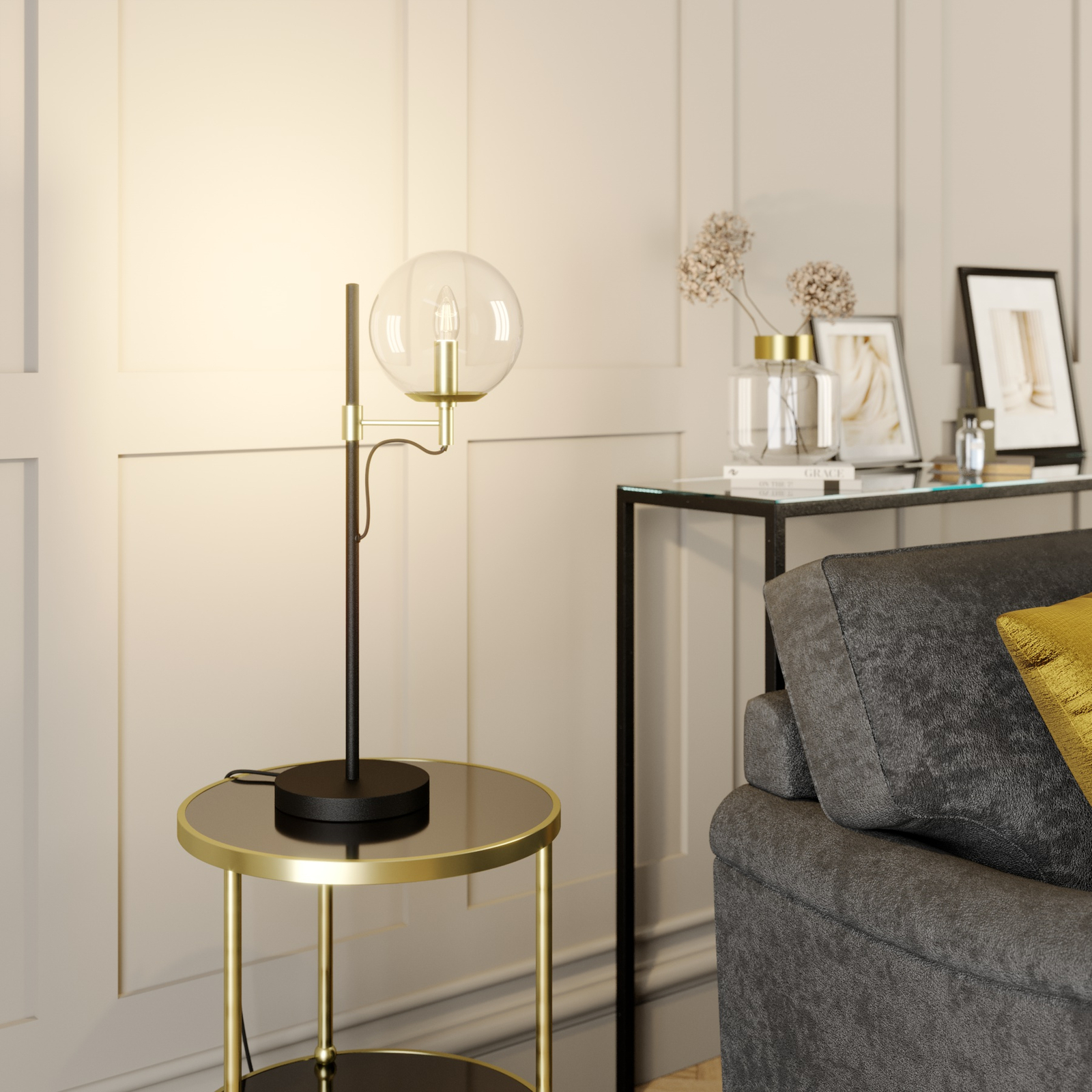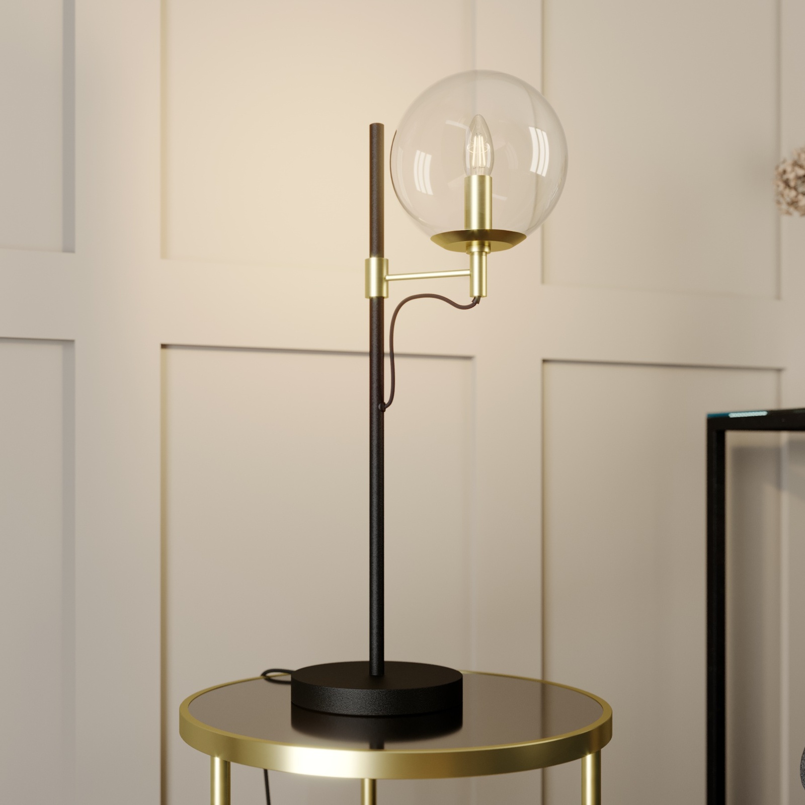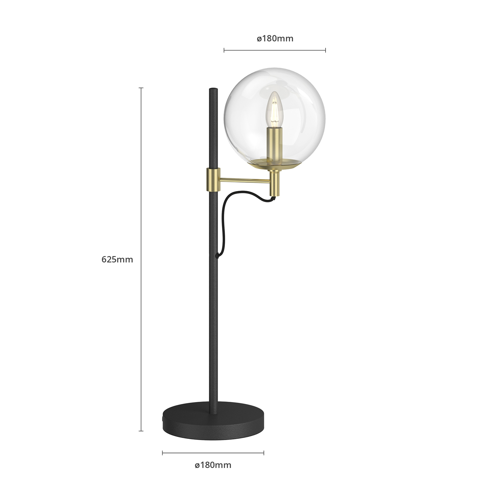 Sotiana-pöytävalaisin ihastuttaa erityisellä nostalgisella vintage-tyylillään. Valaisin on uusi tulkinta klassisesta valaisinsarjasta. Varjostin koostuu kirkaspintaisesta lasipallosta, joka erottuu valaisimen mustasta rungosta. Lisäksi valaisimessa on messinginväriset metalliyksityiskohdat, kuten varjostimessa oleva, esteettä näkyvä pidin. Kirkkaasta lasipinnasta johtuen valaisimeen kannattaa valita sen tyyliin sopiva lamppu. Tähän valaisimeen sopii erittäin hyvin pisaranmallinen LED-filamenttilamppu. Varjostin on helppo irrottaa muutamalla kädenliikkeellä asennuksen ja lampun vaihdon yhteydessä.