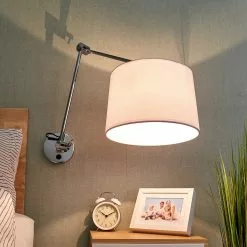 Jolla on täydellinen lisä, kun valon tulee olla käden ulottuvilla vuoteesta tai sohvasta käsin. Ulokevarsi koostuu kahdesta nivelöidystä elementistä, siten että seinävalaisin on vedettävissä oman mielen mukaan ja kirkkaus pääsee tarkalleen toivottuun kohtaan. Lieriömäinen varjostin koostuu valkoisesta kankaasta ja se pitää huolen miellyttävästä ja kodikkaasta valovaikutuksesta. Kytkin sijaitsee rungossa, siten että Jolla voidaan kytkeä päälle ja pois suoraan paikan päällä.