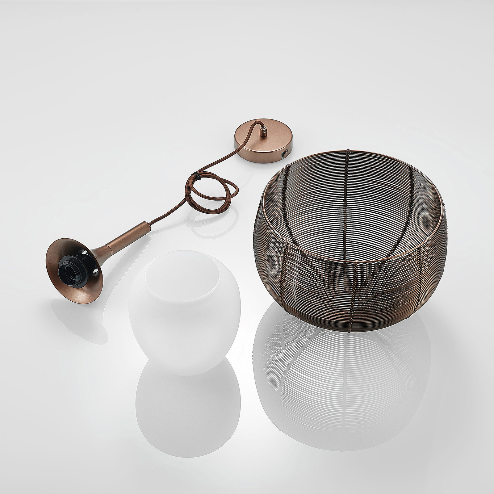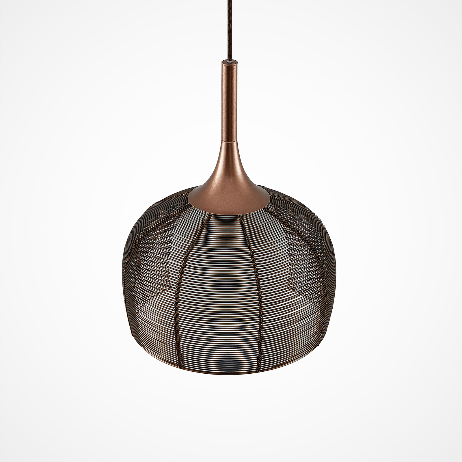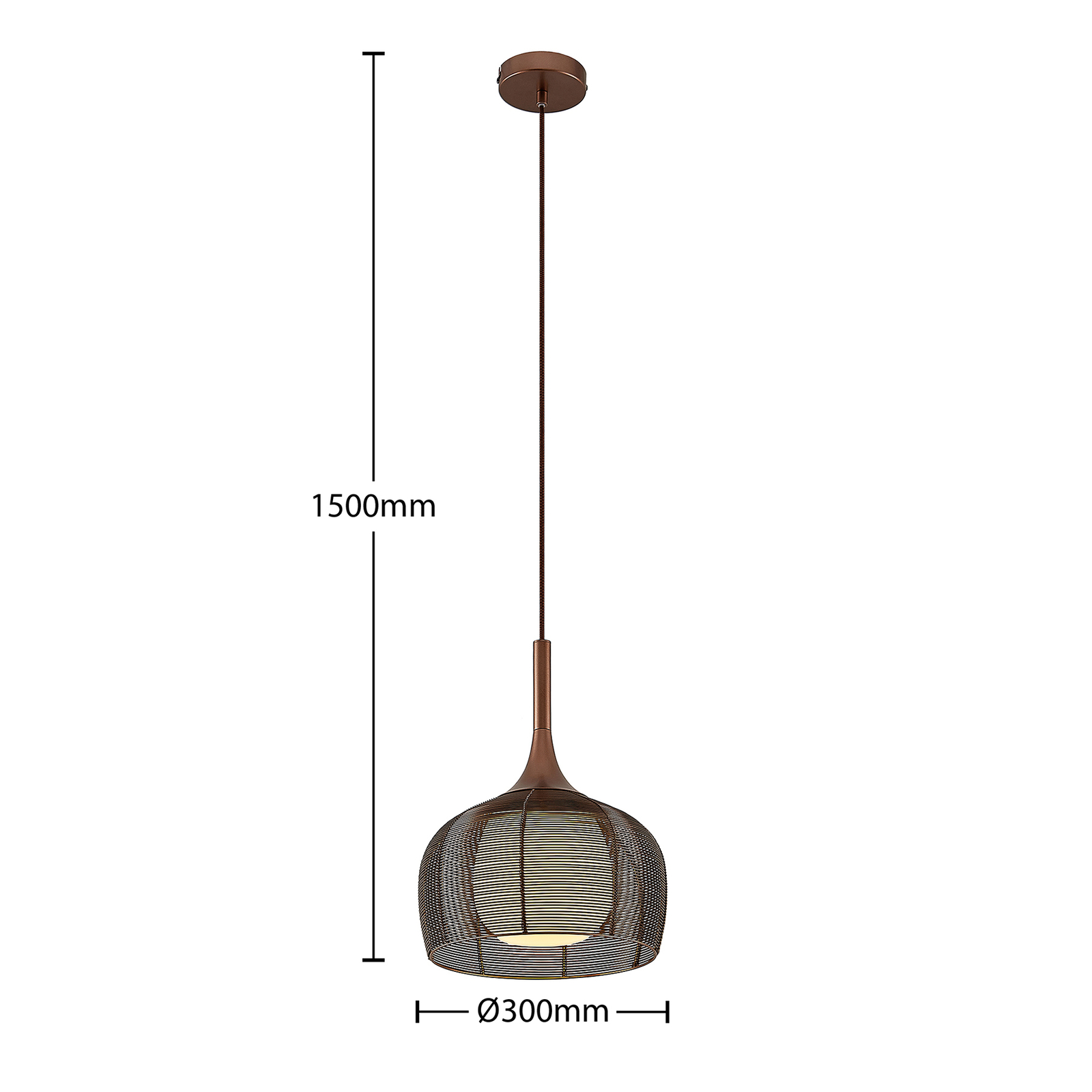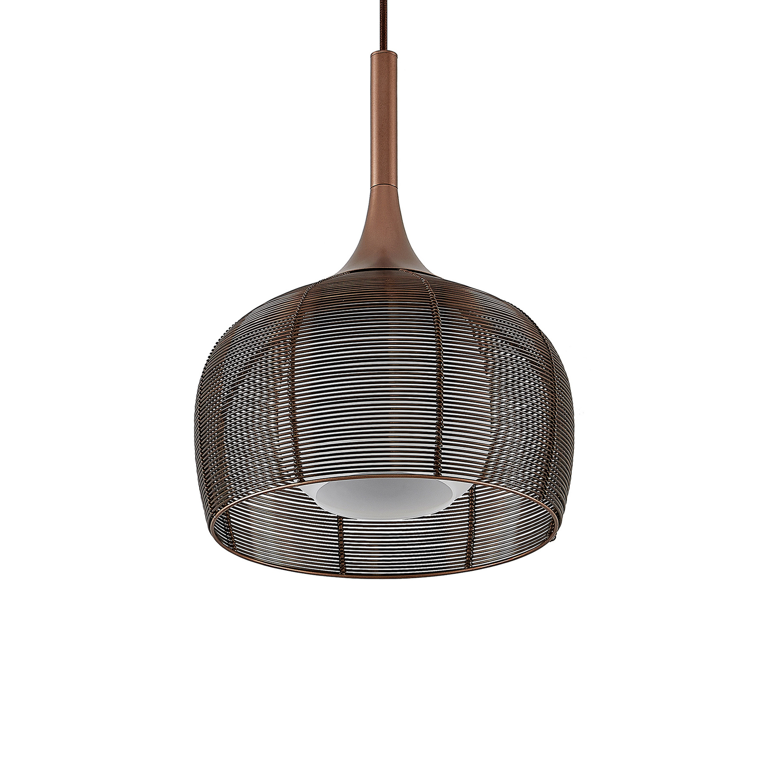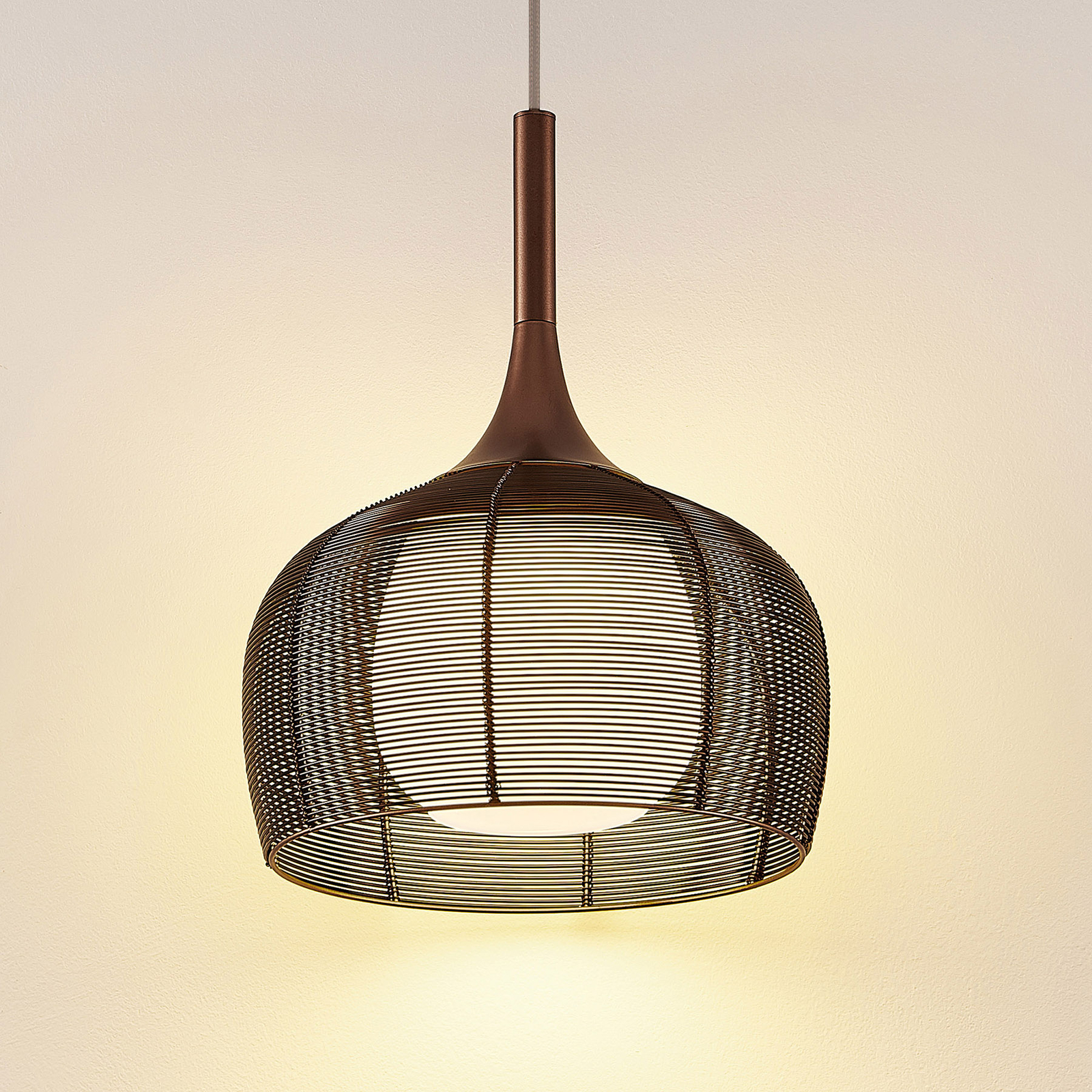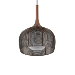 Tämä riippuvalaisin on ihanteellinen käytettäväksi ruokapöydän yläpuolella keittiössä tai tiskillä oleskelutilassa. varjostin koostuu häkin kaltaisesta metalliverkosta, ja sillä on monia ulostuloja ja sitä pidetään houkuttelevalla kahvisävyllä, jonka väri vastaa aikamme trendejä. Jotta valaistus mahdollisimman tasaisesti, ulompaa sävyä täydennettiin valkoisella varjostin lampun sisällä. Valo tunkeutuu ympäristöön erityisen varovasti ja pakenee ennen kaikkea alaspäin, missä ei ole kantta ja valaistus voi paeta vapaasti. Tämä tekee riipusvalosta ihanteellisen pöydän yläpuolella olevaan riippuvalaisin . E27-valonlähde voidaan valita haluamallaan tavalla, mieluiten tehokkailla LEDeillä.