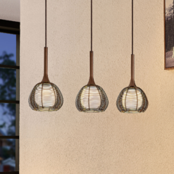 Tetira on vakuuttava sanan todellisessa merkityksessä koko linjan, koska kolme sävyä on järjestetty pitkänomaisiksi viivaksi, mikä tekee riipusvalaisimesta sopivan hyvin pöydän pinnan valaisemiseen. Varjostimet on valmistettu metallista eräänlaisessa häkkiverkossa, jossa on paljon aukkoja. Tämä luo tehokkaan valotehosteen, jossa valkoiset sisemmät lasisävyt tekevät valon jakautumisesta erityisen pehmeää ja tasaista, ja valo voi paeta vain suoraan alaspäin. Tämä on myös seikka, joka puhuu ruokapöydän sytyttämistä keittiössä ja olohuoneessa. Kahvinruskea pinta pyöristää tyylikkäästi yksilöllisen valaisimen muotoilun ja tekee Tetirasta merkittävän valaisin moderneihin huoneisiin.