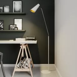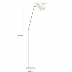 Kapea lattiavalaisin Wibke on melko pelkistetty, mutta tyyliltään hyvin moderni ja skandinaavinen. Valkoinen, kromi ja kulta sopivat harmonisesti yhteen ja muodostavat valaisimen, jonka tyyli näyttävä, mutta silti hillitty. Alaspäin säteilevä valo tekee Wibke-lattiavalaisimesta ihanteellisen käytettäväksi lempituolisi tai sohvan vieressä. Kätevänä ominaisuutena on varjostimen yläpuolelle sijoitettu virtakytkin valon päälle- ja poiskytkemiseksi.