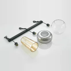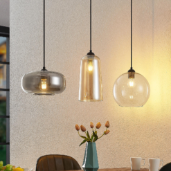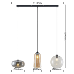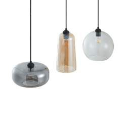 Ihanteellinen moderni ja tyylikäs pöytävalaistus, Wilja-riippuvalaisimessa on kolme lasivarjostinta, jotka on kiinnitetty kattokiinnike yhdensuuntaisesti. Nämä ovat myös muotoiltu eri tavalla ja kukin eri lasiväreillä. Kirkas lasi, meripihkanvärinen ja savuharmaa lasi yhdessä mustan kattokiinnike ja mustan tekstiilikaapelin kanssa muodostavat upean kokonaisuuden, joka herättää välittömästi kaikkien huomion.