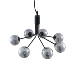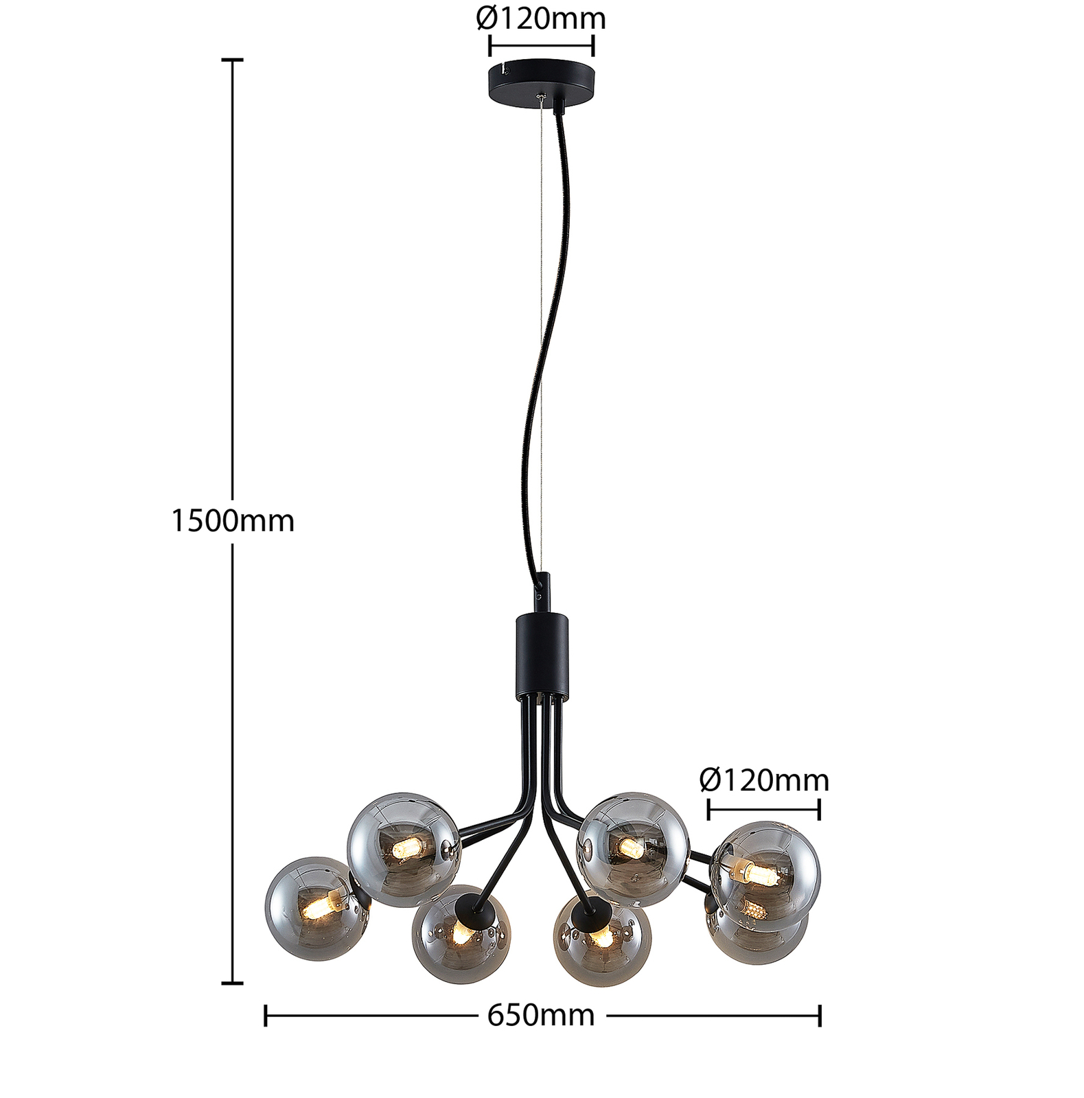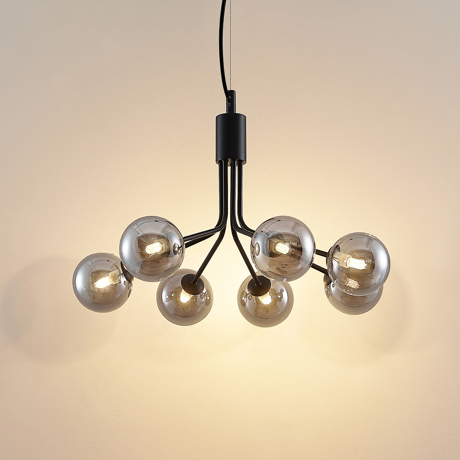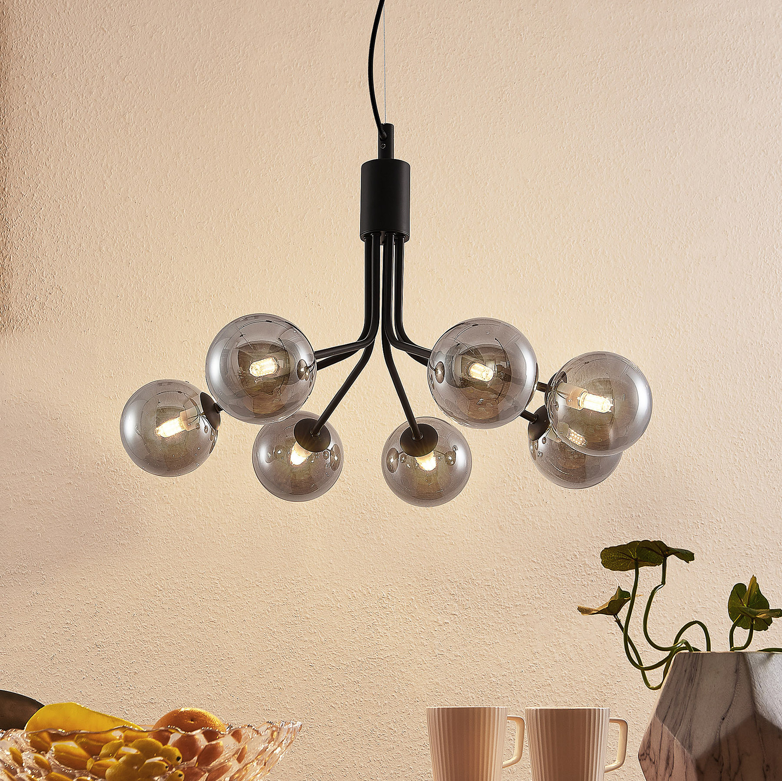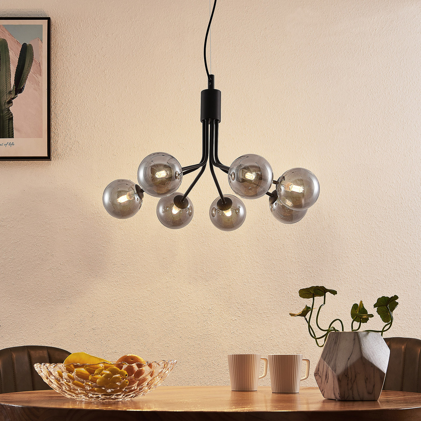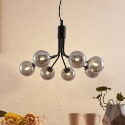 Tämän riippuvalaisin sävyjä ei yleensä suunnitella, vaan ne muistuttavat palloja ja on valmistettu kirkkaasta lasista, jolla on kuitenkin savuinen, harmaa sävy ja kauniit urat. Tällä on myös tehokas vaikutus valokuvaan, jolle valoheijastukset antavat kauniimman hehkun ja näyttävät siksi erityisen tyylikkäältä. Viisi lampunvarjostinta voivat varmistaa hyvän kirkkauden valitsemalla sopivat lamput, ja ne on varustettu parhaiten LED-lampuilla maksimaalisen hyötysuhteen saavuttamiseksi. Musta runko, jossa on mattapinta, täydentää savuista kirkasta lasia uritetulla rakenteellaan, jolloin saadaan harmoninen kokonaiskuva.