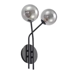 Tämän seinävalaisimen teräsrungossa on mattapintainen pintaviimeistely mustalla, varjoihin johtavien tankojen keskellä. Tehokkaana lisäyksenä ulkonäköön, jolla on hieman vintage-luonne, kaksi pallomaista sävyä, jotka on sävytetty savunharmaiksi, ovat kirkkaita ja niissä on houkuttelevat rihlat. Tämä ei hyödytä vain lampun optiikkaa, vaan myös kevyttä kuvaa, joka saa tehokkaat aksentit ja kauniin hehkun lasin urien läpi.