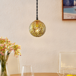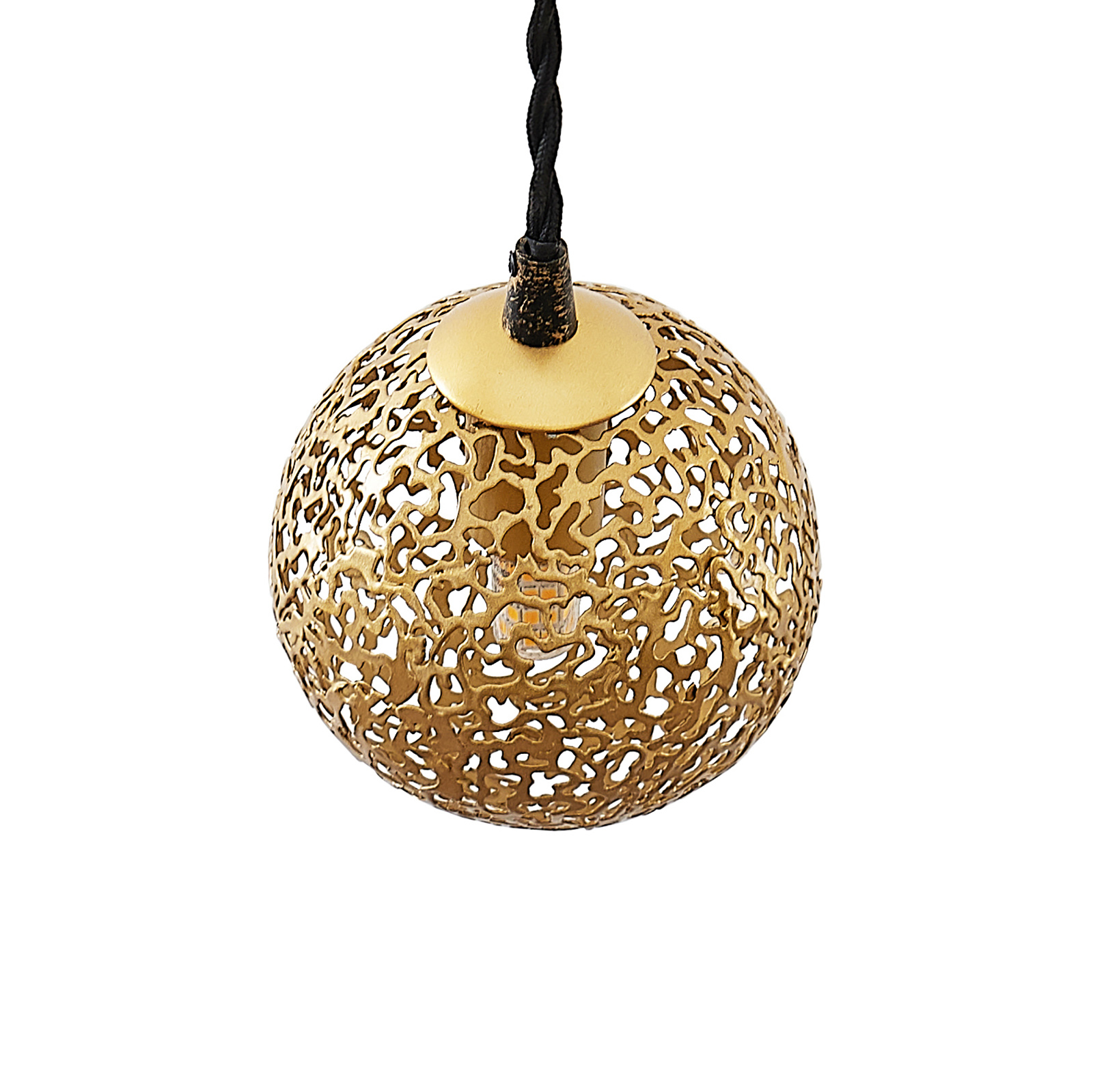 Yhden liekin roikkuu lamppu Zale koostuu kapea suspension, joka on pallomainen varjostin valmistettu metallista on kiinnitetty. varjostin on ihana kohokohta oleskelutilassa, koska varjostin on varustettu kultainen viimeistely ja se on myös hieno syvennyksiä, jotka johtavat ihana kuvio. Tämä kuvio antaa lampulle itämaisen muistiinpanon ja samalla luo tehokkaan valaistuksen, koska valo loistaa sisältäpäin kuviota vasten, joten taiteelliset varjot heijastuvat seiniin. Tämä luo romanttisen, kodikkaan ilmapiirin.
