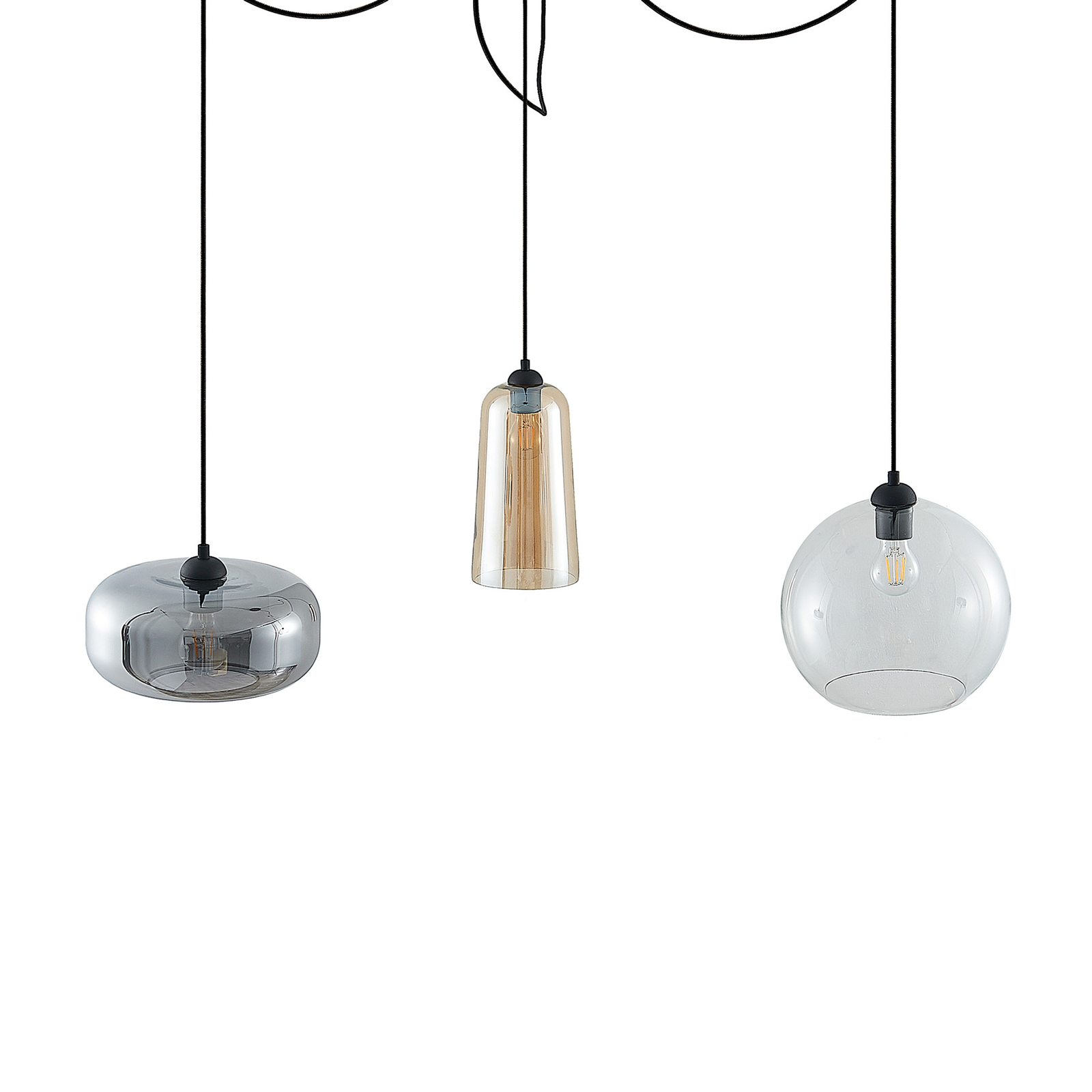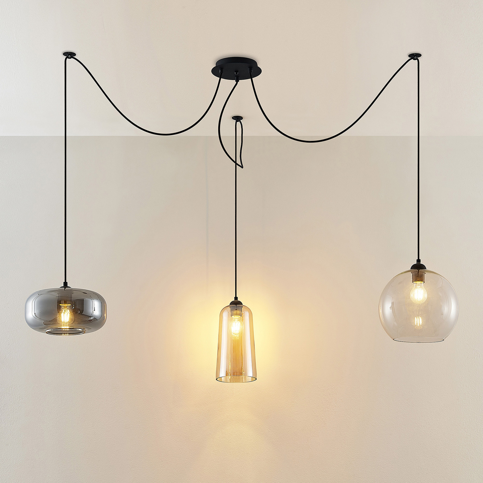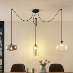 Moderni riippuvalaisin zyli on varustettu kolmella eri muotoinen lasi sävyjä, jotka on kaikki suunniteltu eri tavoin. Olipa kristallinkirkas, meripihkanvärinen tai savuinen harmaa, kukin varjostin on kiinnitetty pyöreään kattokiinnike mustalla tekstiilikaapelilla. Tämä moderni ilme sopii hyvin nykyaikaisiin elämäntapoihin. Zyli- riippuvalaisin on todellinen katseenvangitsija ja miellyttävän kirkas valo.